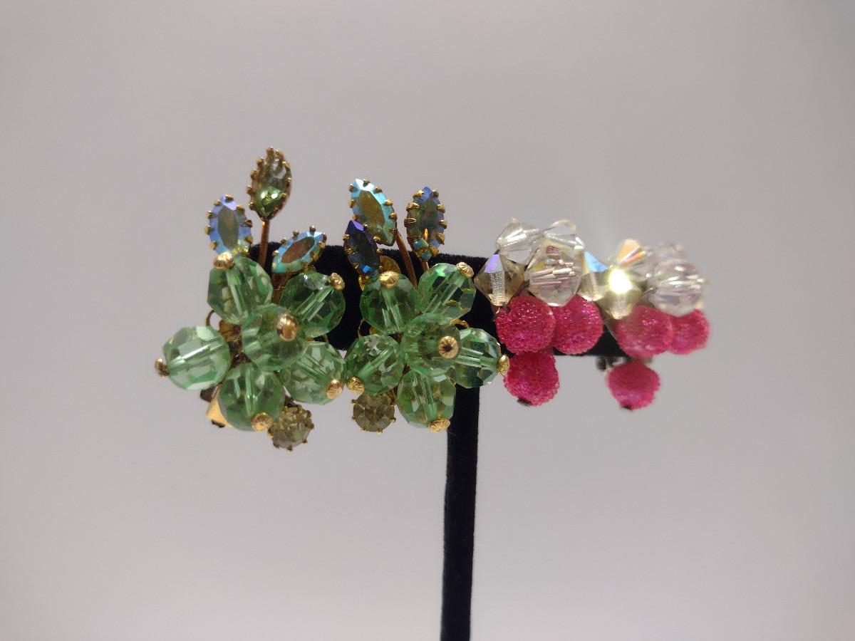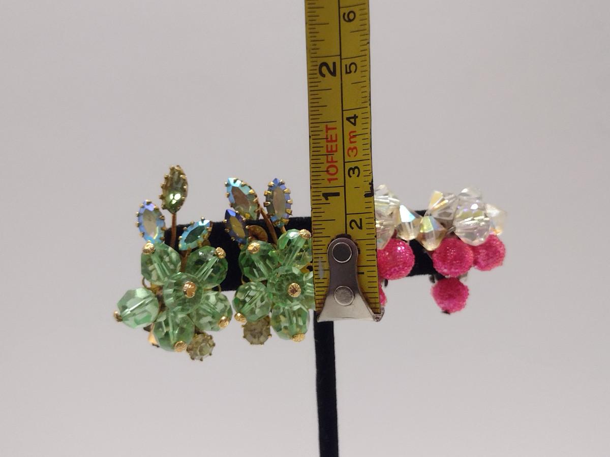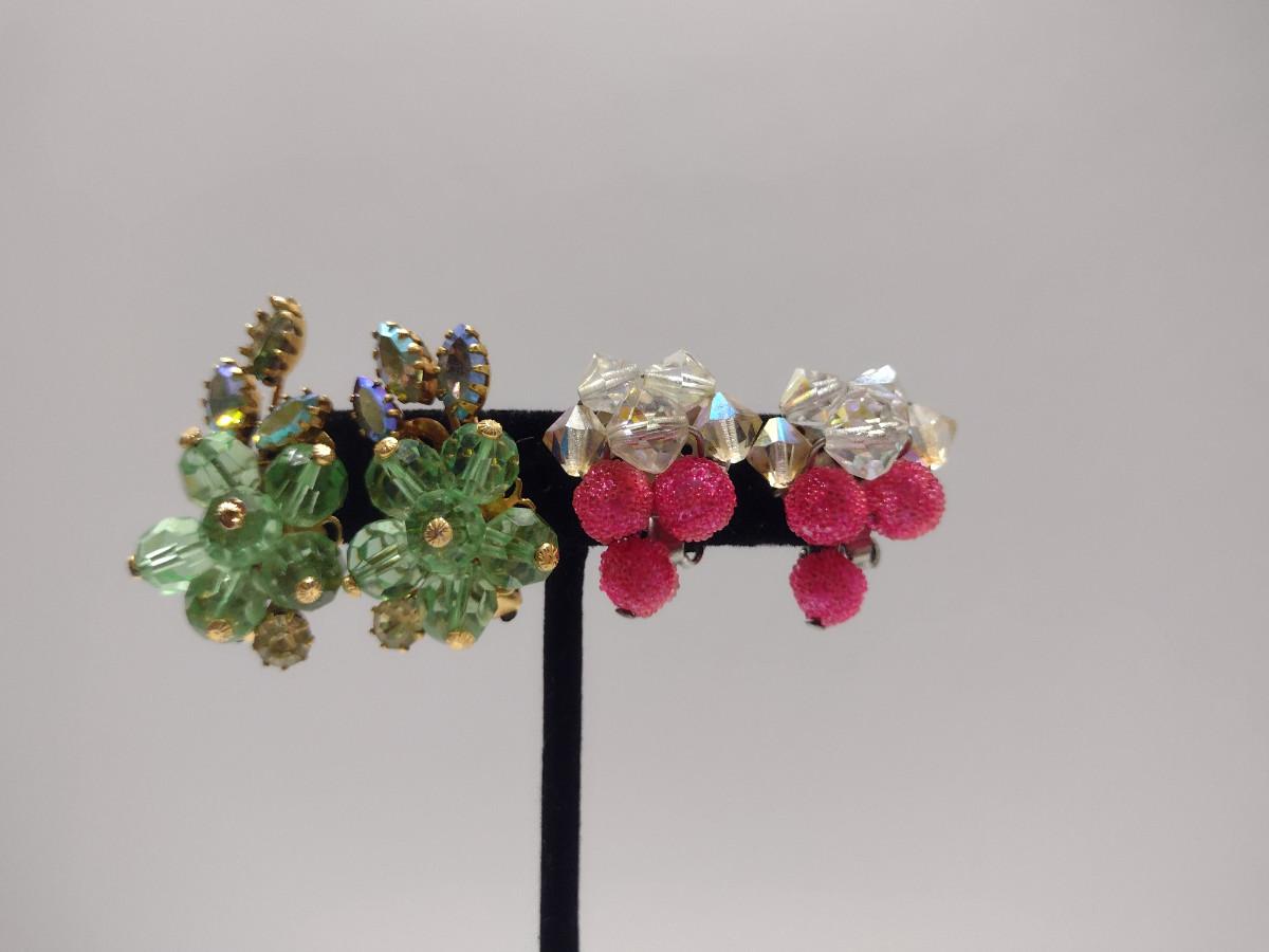 Two Pairs of Vintage Aurora Borealis Earrings (#45). Green one is marked 'Austria'.