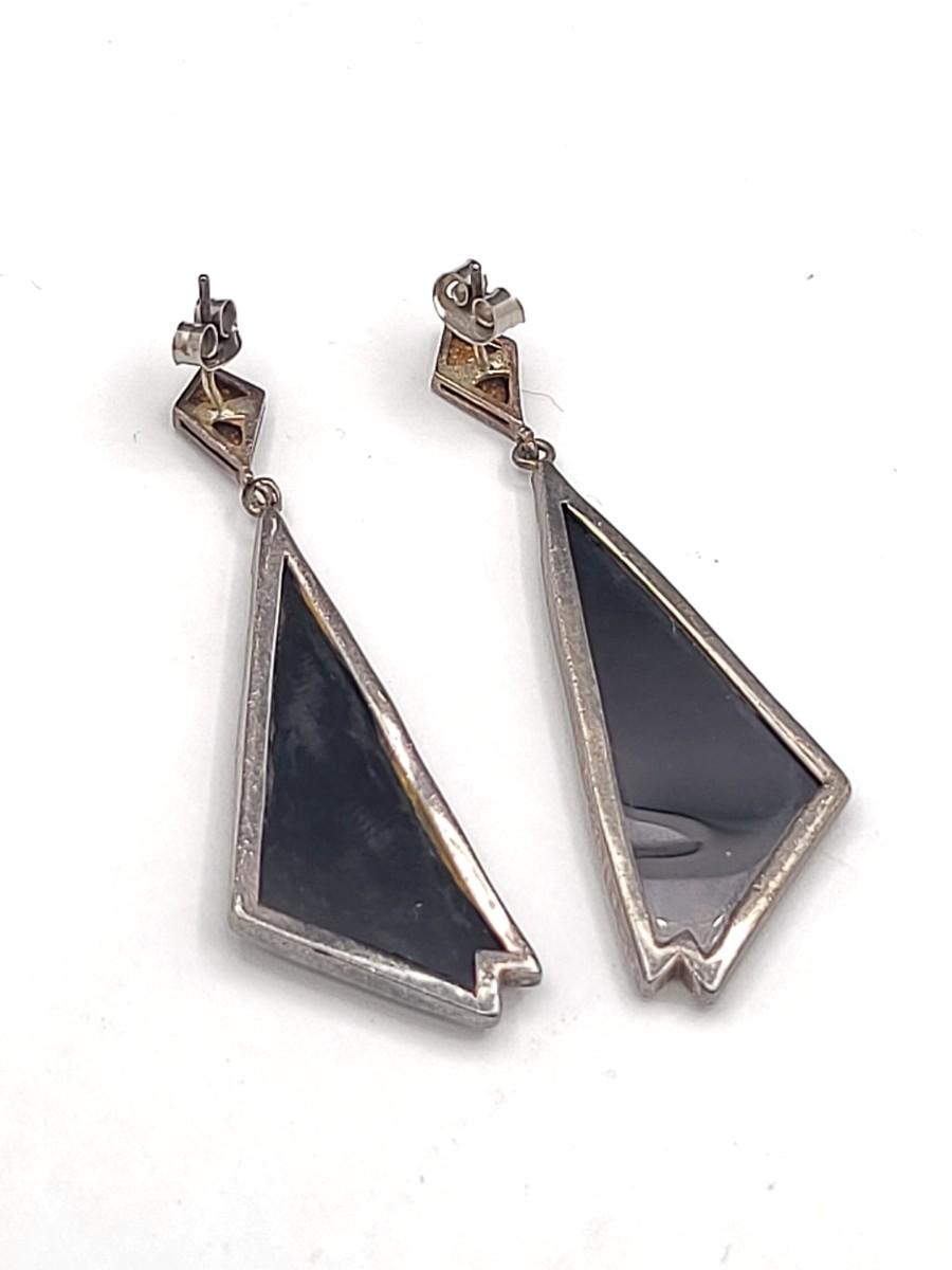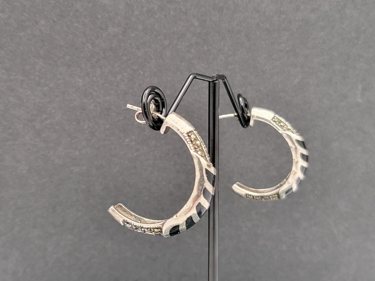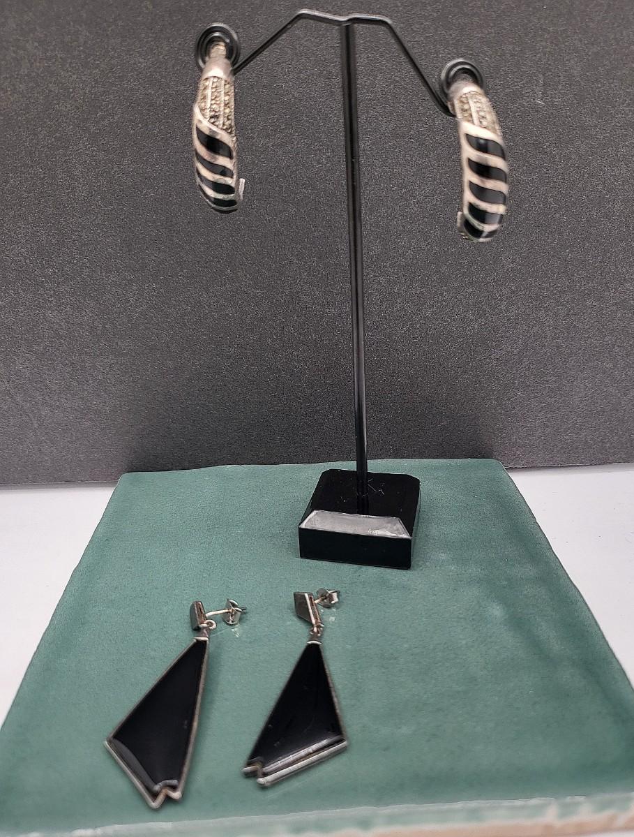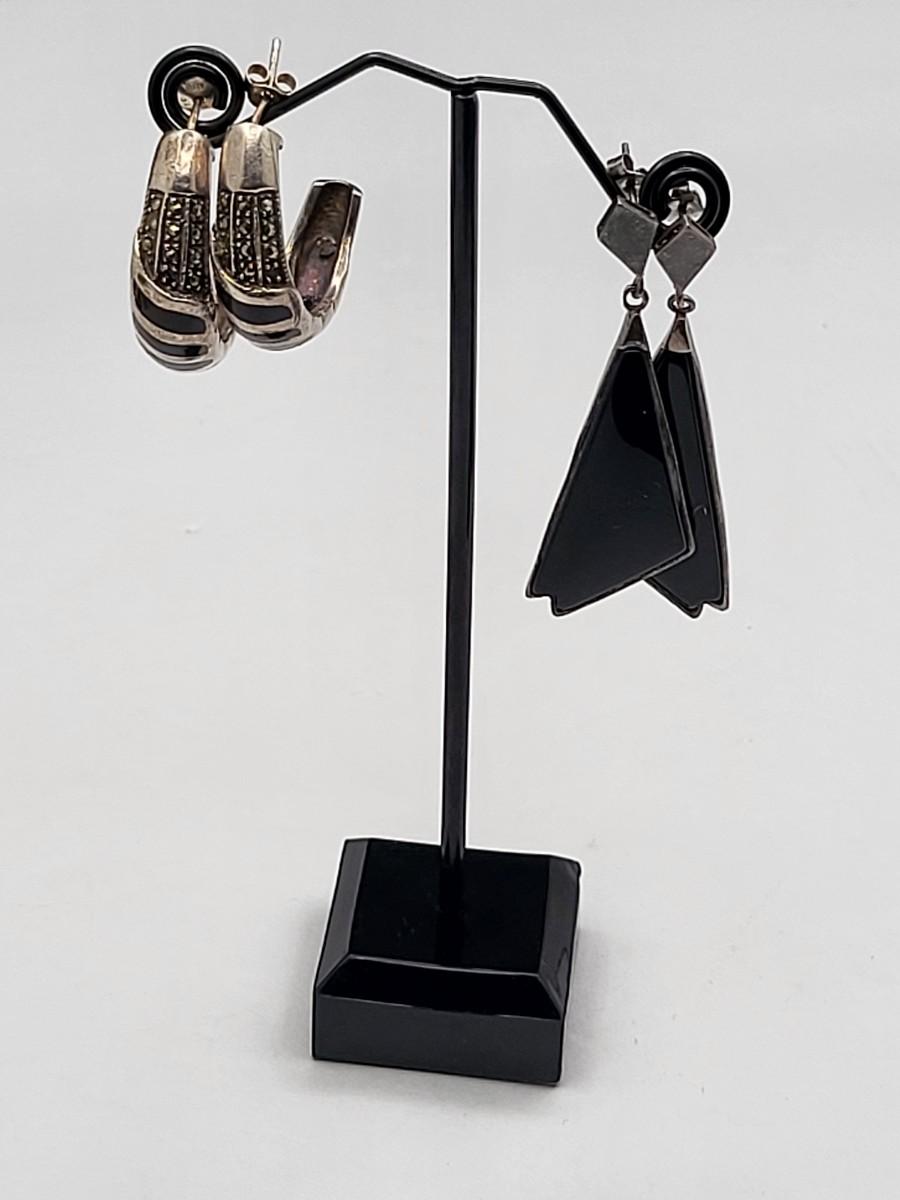 Pierced, 3/4 hoop earrings in sterling silver, onyx inlay & marcasite stones. Art Deco, geometric onyx dangle earrings 2" long, also sterling silver. Total weight is 22.3 grams.