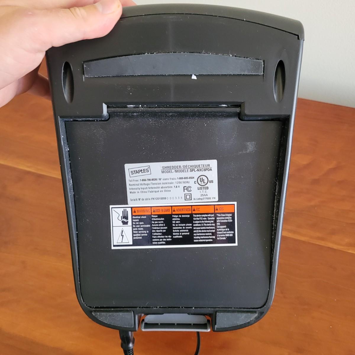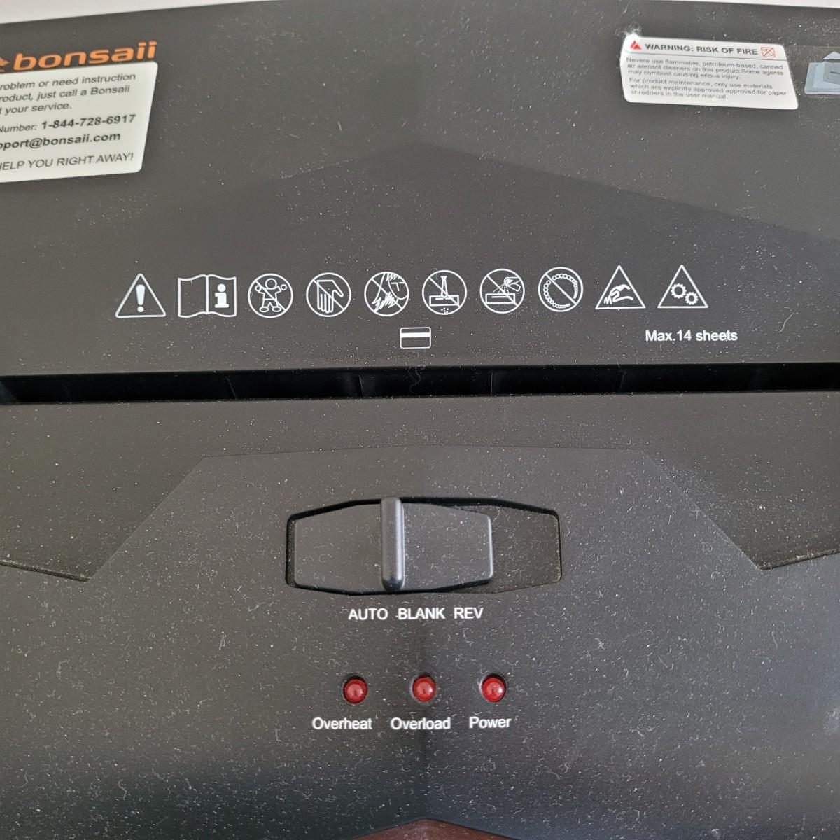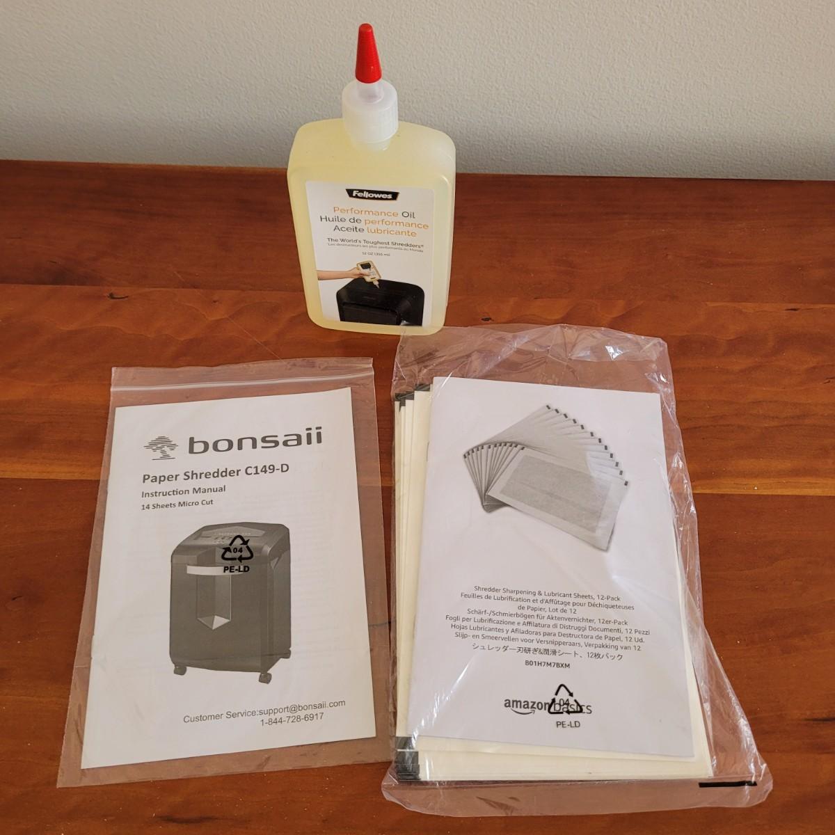 This lot includes two paper shredders. The larger shredder is a stand-alone style Bonsaii brand rolling unit. It measures 14" x 10" x 20"H. The smaller shredder is a Staples brand Minimate and is also a stand-alone style shredder bin. It measures 8" x 10" x 14"H. Both items powered on when plugged in. Also includes is a what appears to be a new bottle of performance oil (we do not guarantee contents), shredder sharpening sheets, and paperwork for the Bonsaii unit.