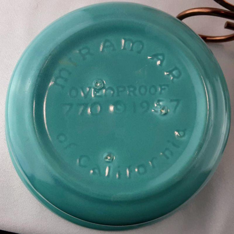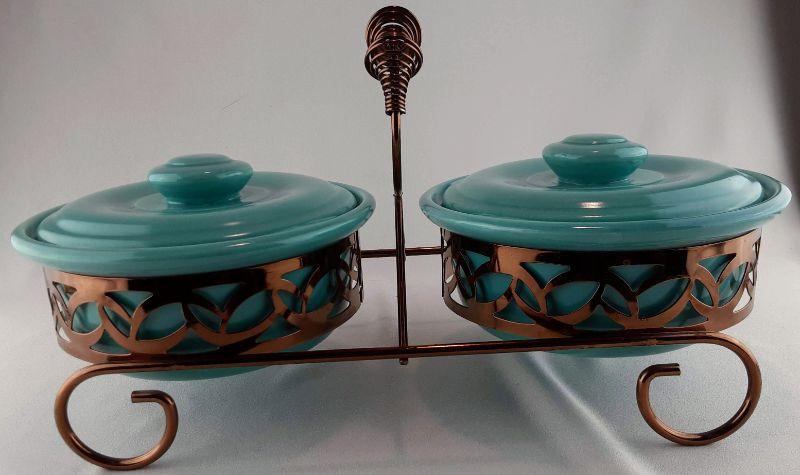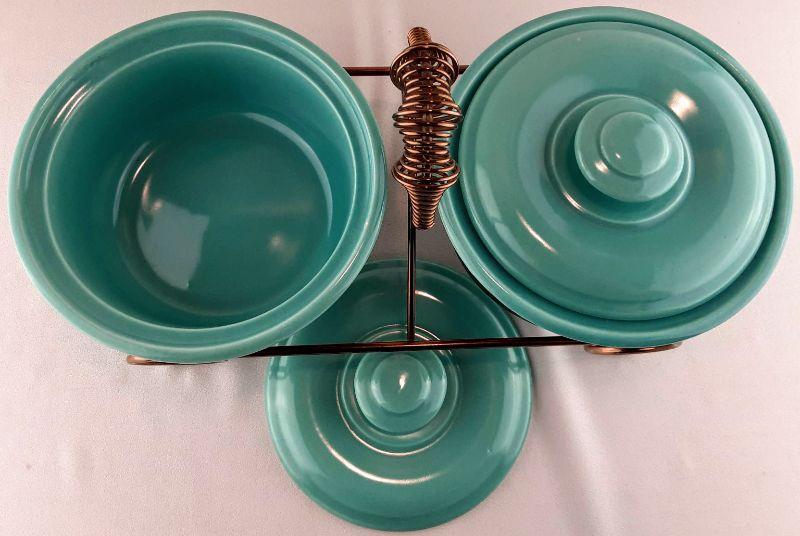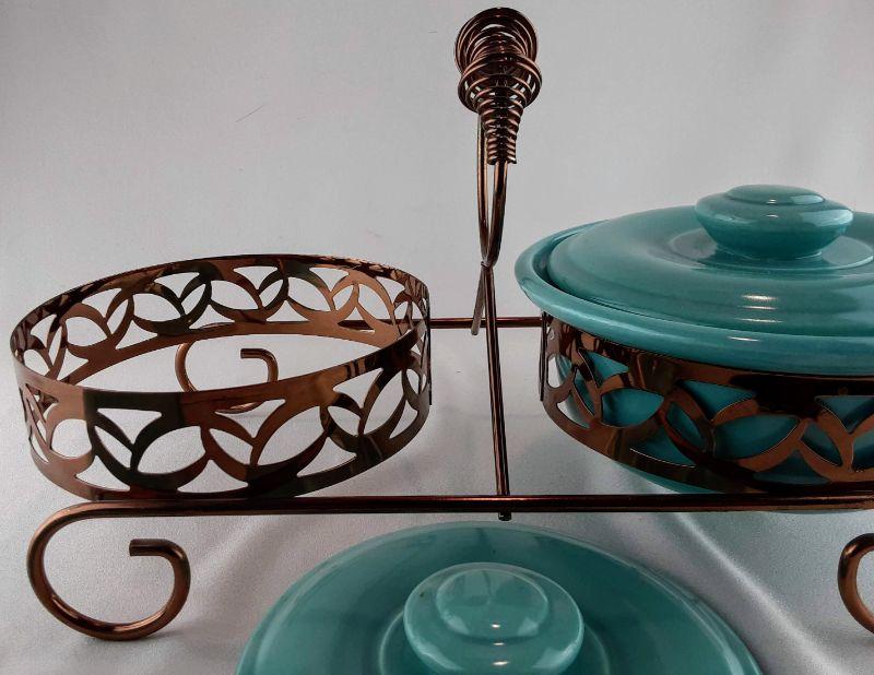 Good looking metal stand with two ceramic casserole dishes measuring 6.5in across and 3.5in. tall. the stand is 14in. across.