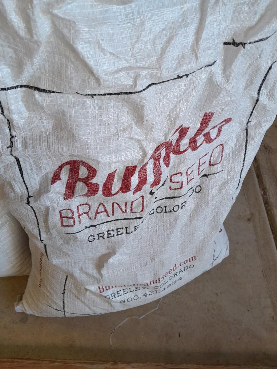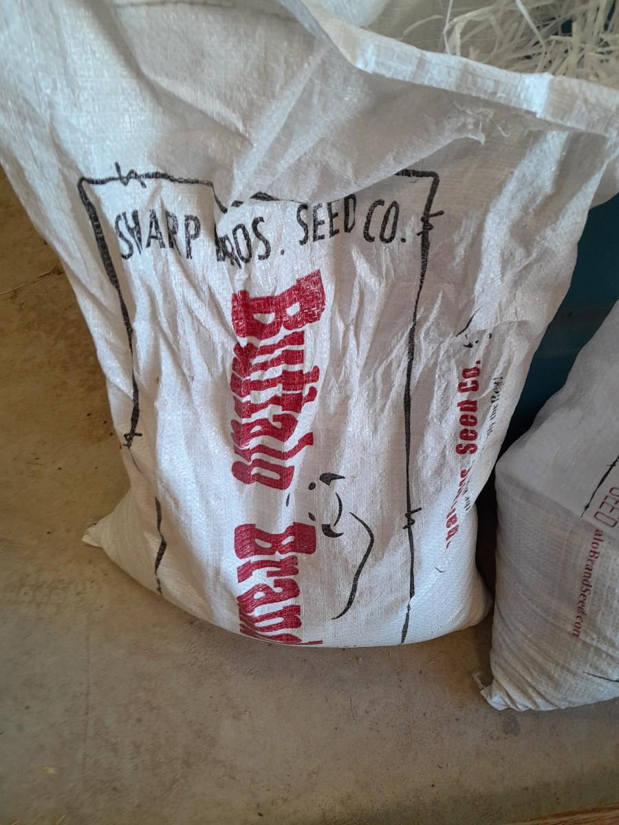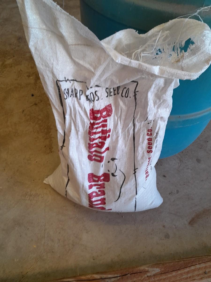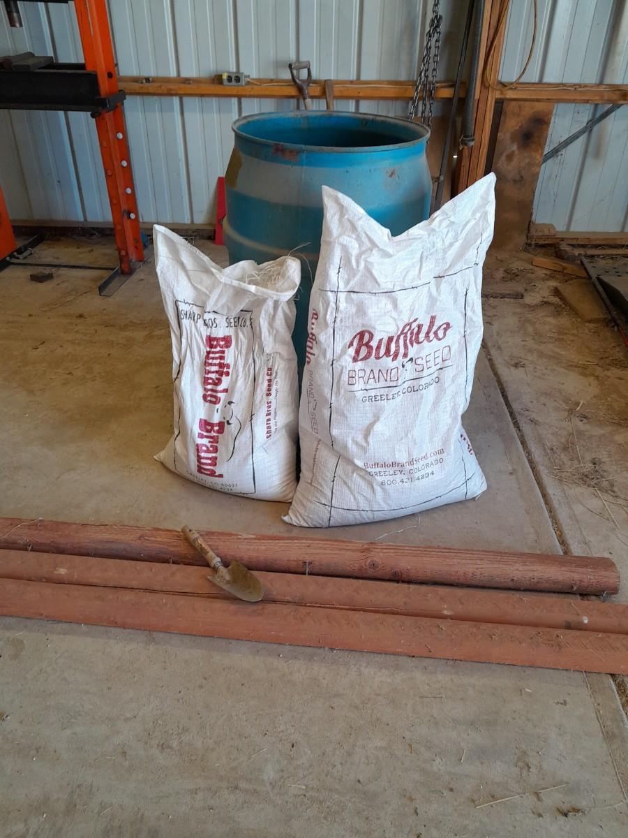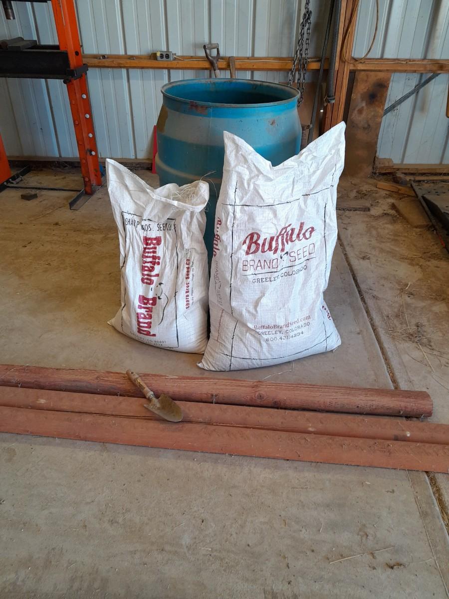 TWO PARTIAL BAGS OF UNKNOWN GRASS? SEED, LARGE BLUE BARREL FOR STORAGE, PLASTIC RAKE, AND THREE 3"X8' LANDSCAPE TIMBERS