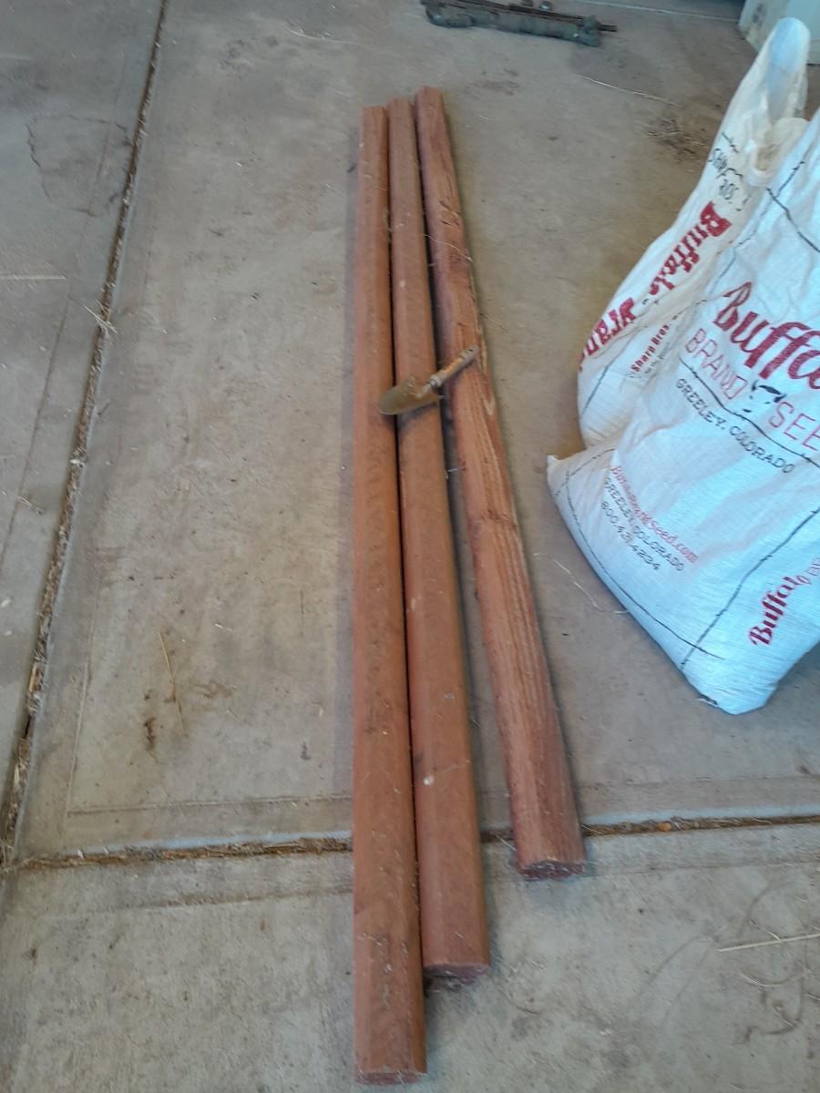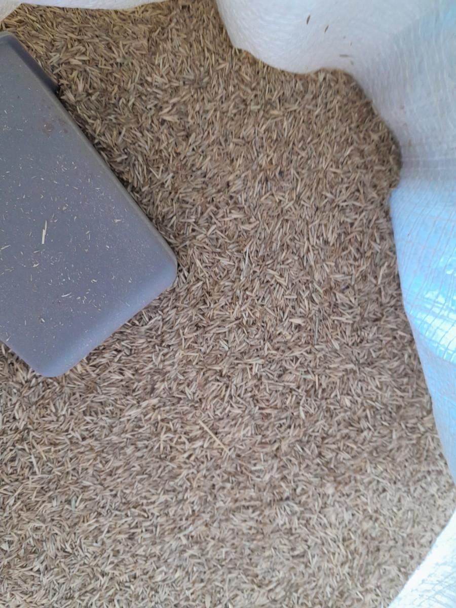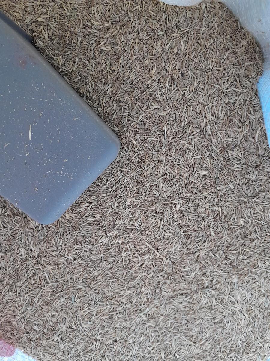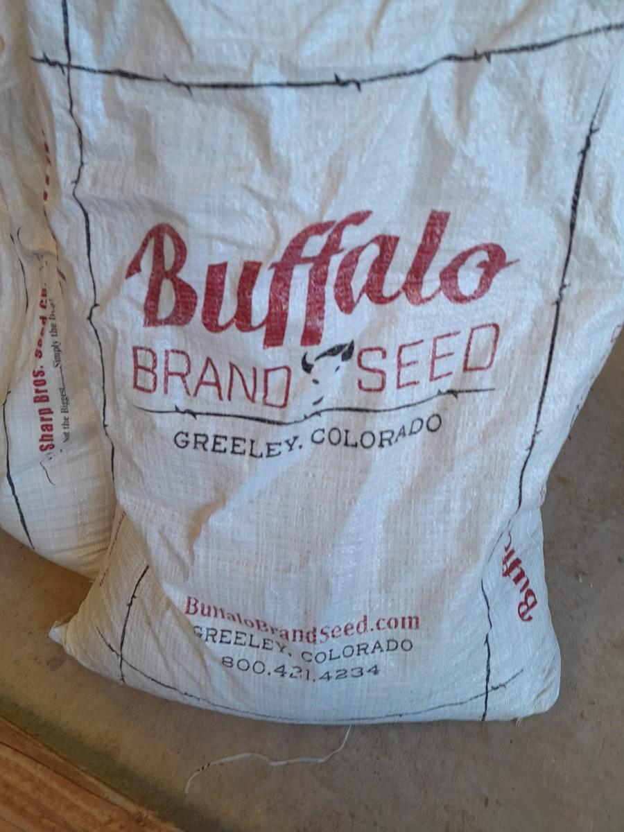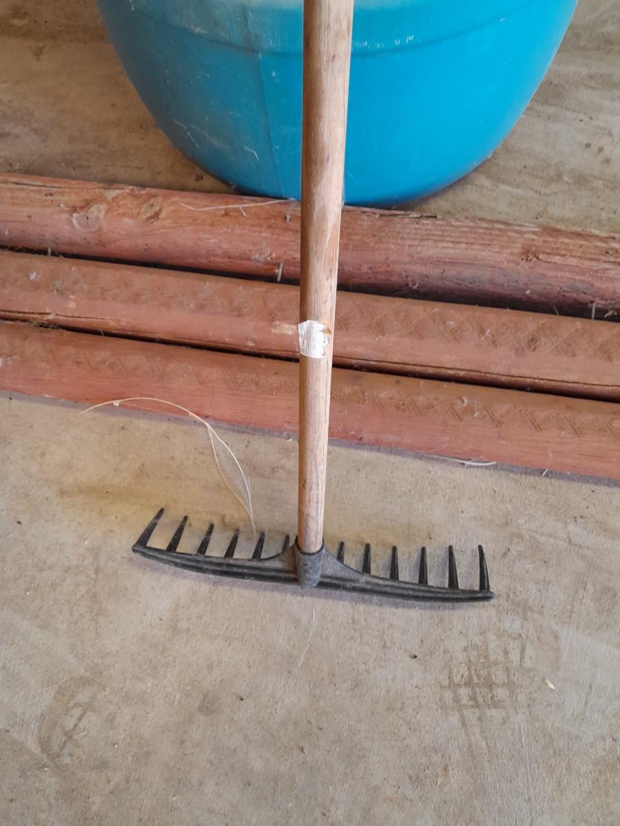 TWO PARTIAL BAGS OF UNKNOWN GRASS? SEED, LARGE BLUE BARREL FOR STORAGE, PLASTIC RAKE, AND THREE 3"X8' LANDSCAPE TIMBERS