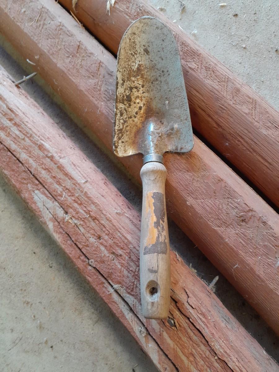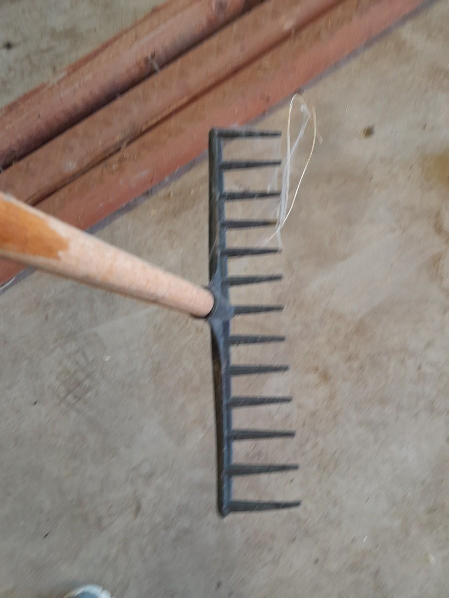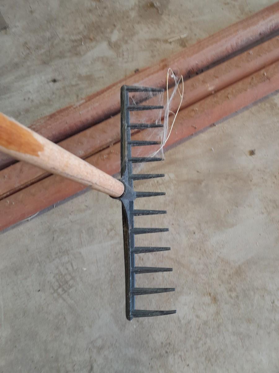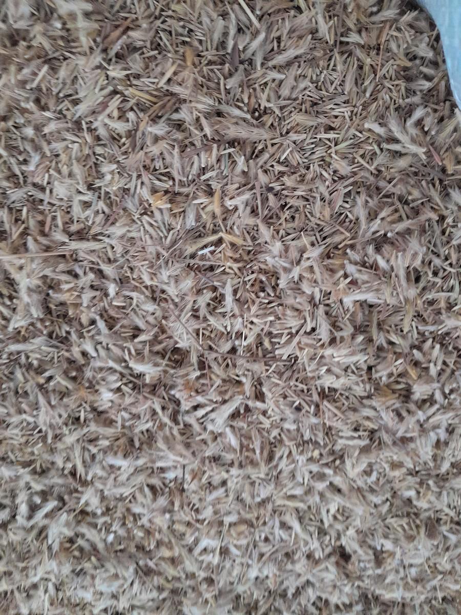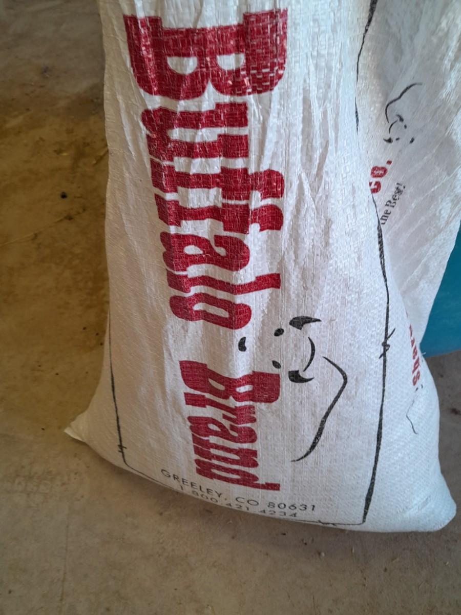 TWO PARTIAL BAGS OF UNKNOWN GRASS? SEED, LARGE BLUE BARREL FOR STORAGE, PLASTIC RAKE, AND THREE 3"X8' LANDSCAPE TIMBERS