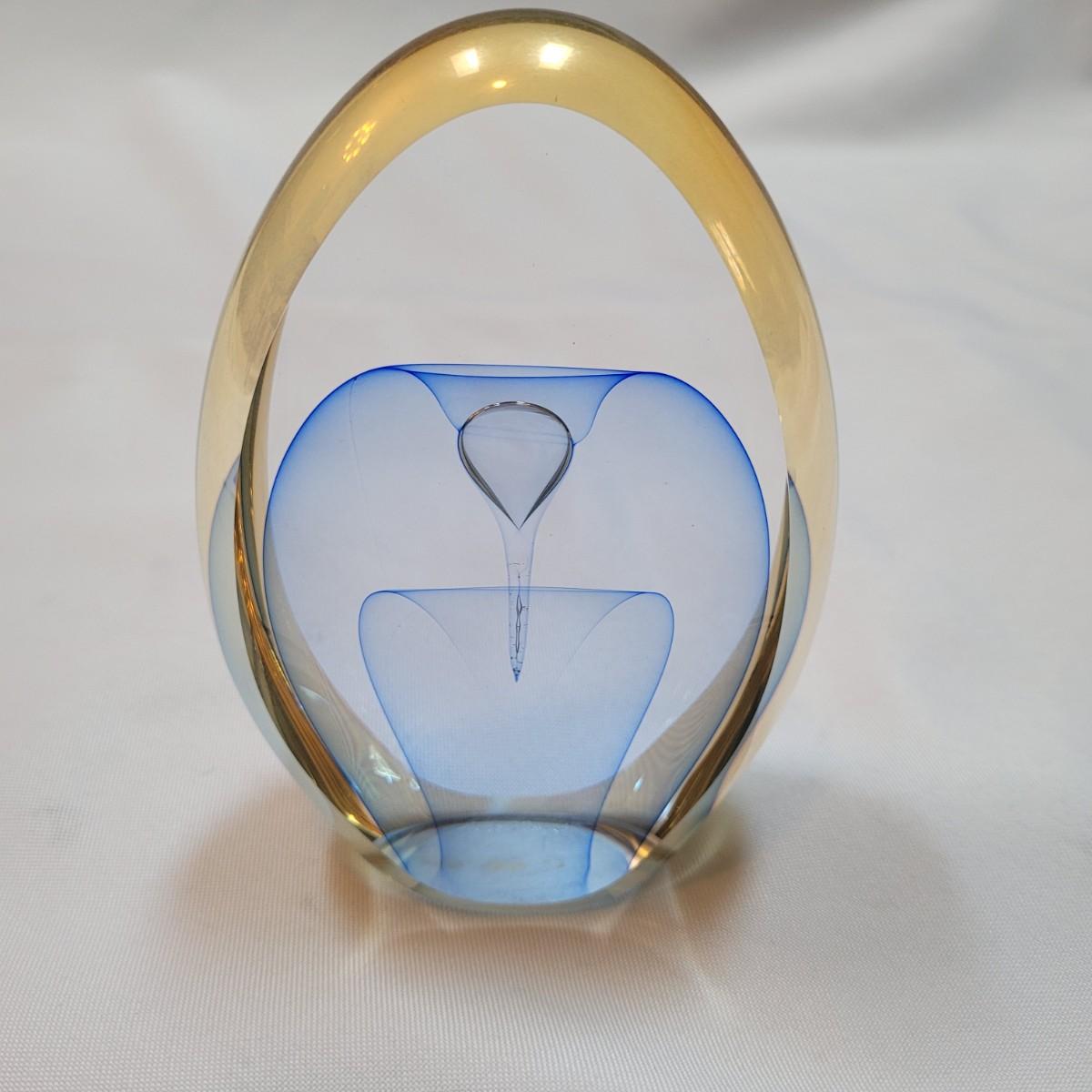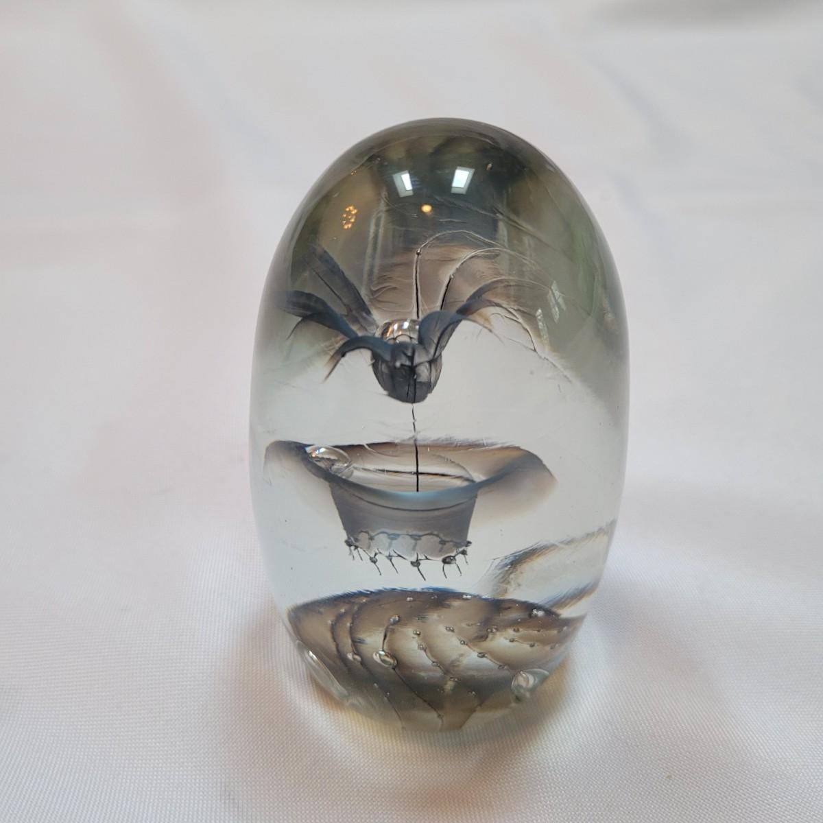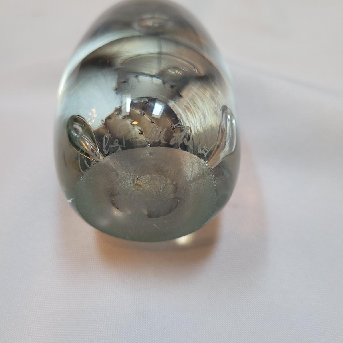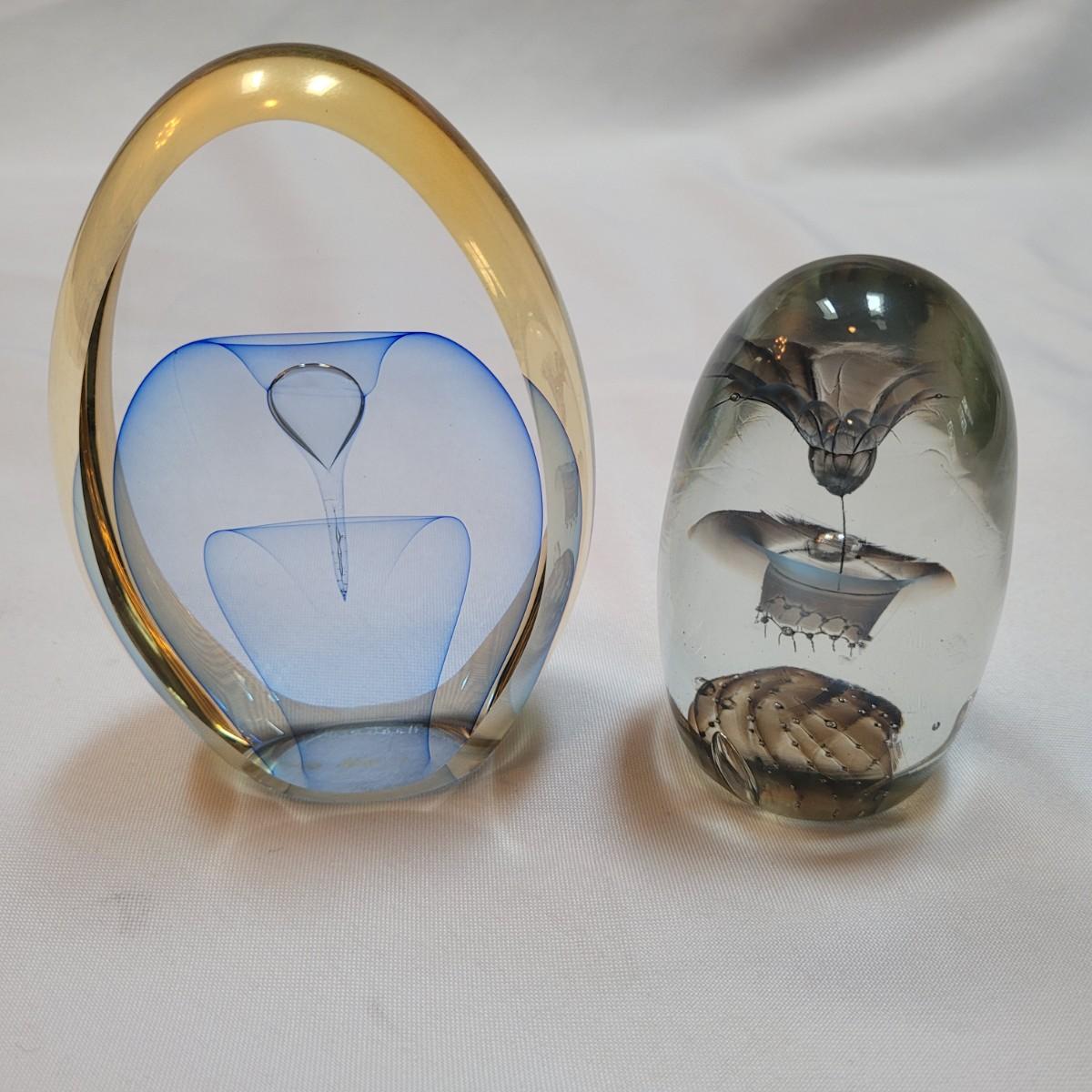 Two glass sculptures or paperweights that appear to be signed by the artists. The first is an egg shaped transparent piece with accents of blue done by artist Ed Nesteruk. It measures 3.5" x 1.5" x 5"H. The second piece is also egg shaped clear and features notes of gray glass depicting floral designs on the inside done by artist Pavel Molnar. This piece measures 2.5" x 2.5" x 4"H.