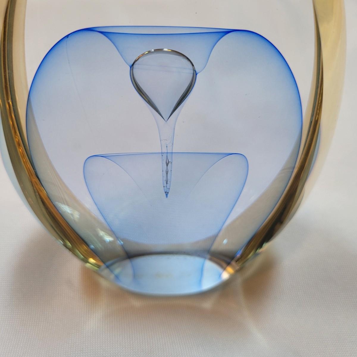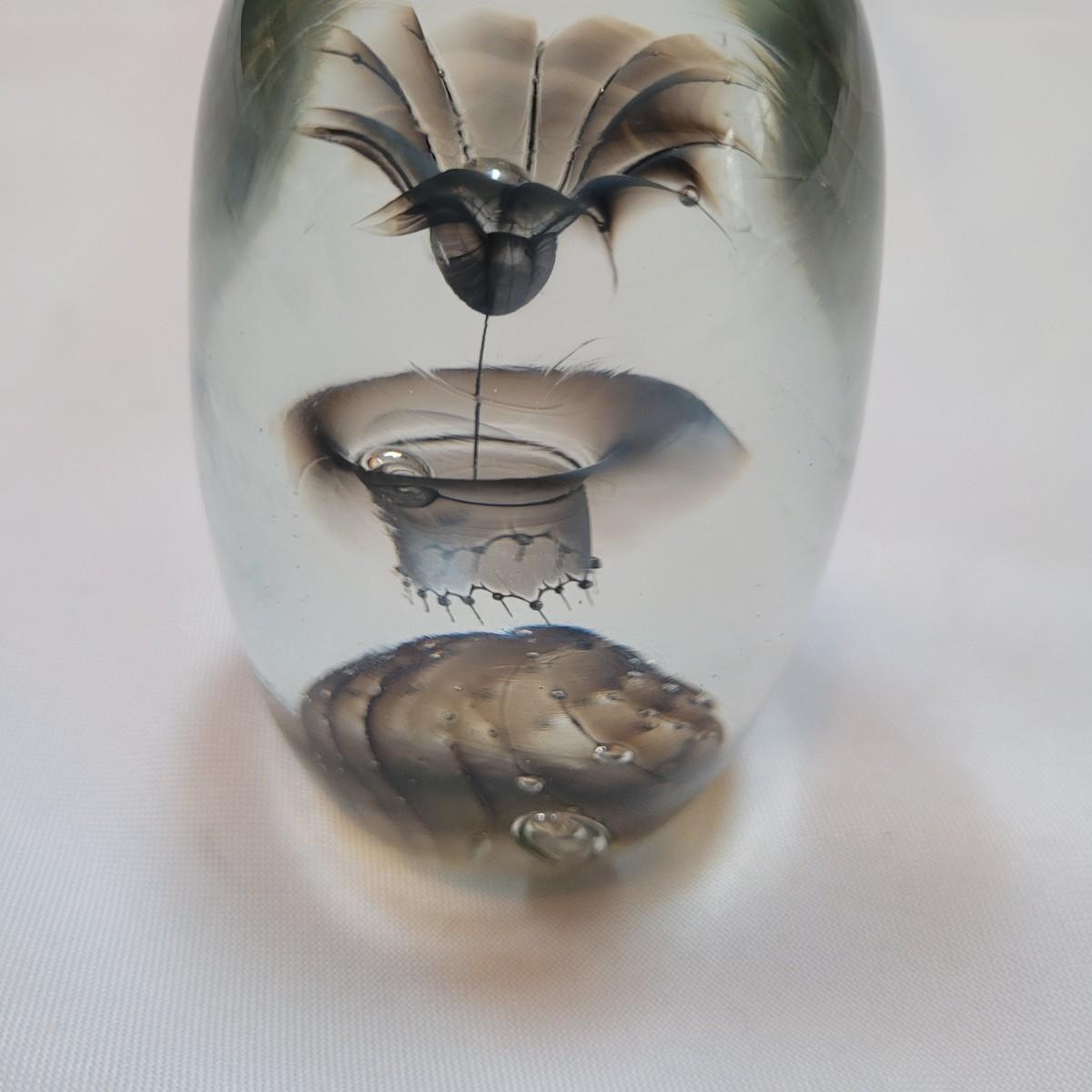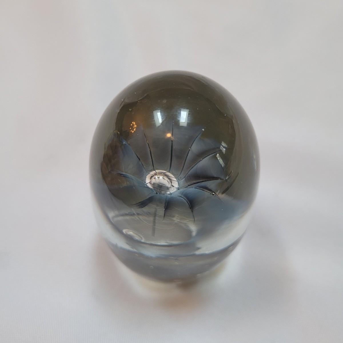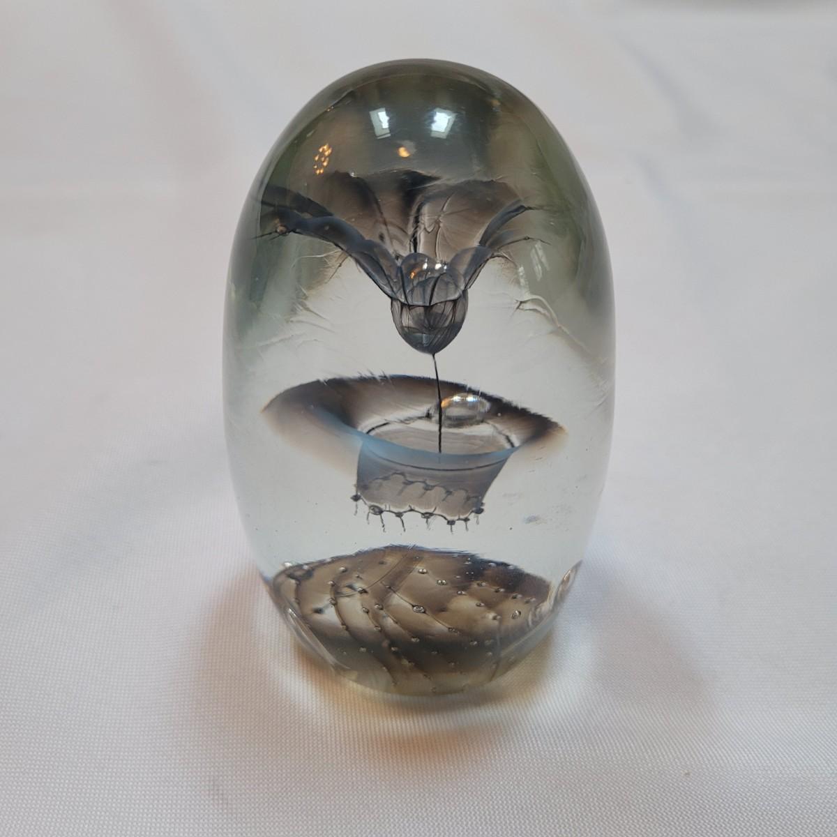 Two glass sculptures or paperweights that appear to be signed by the artists. The first is an egg shaped transparent piece with accents of blue done by artist Ed Nesteruk. It measures 3.5" x 1.5" x 5"H. The second piece is also egg shaped clear and features notes of gray glass depicting floral designs on the inside done by artist Pavel Molnar. This piece measures 2.5" x 2.5" x 4"H.
