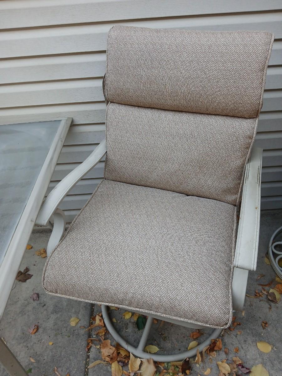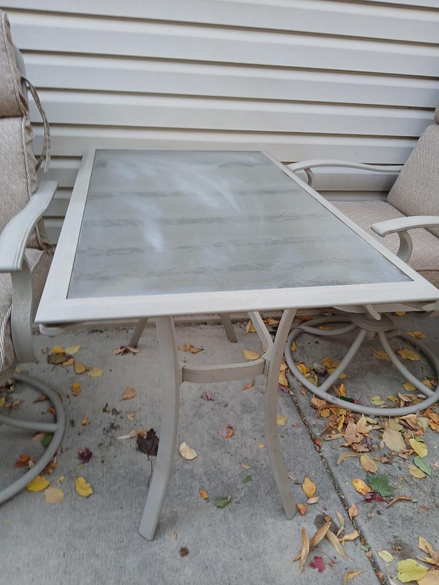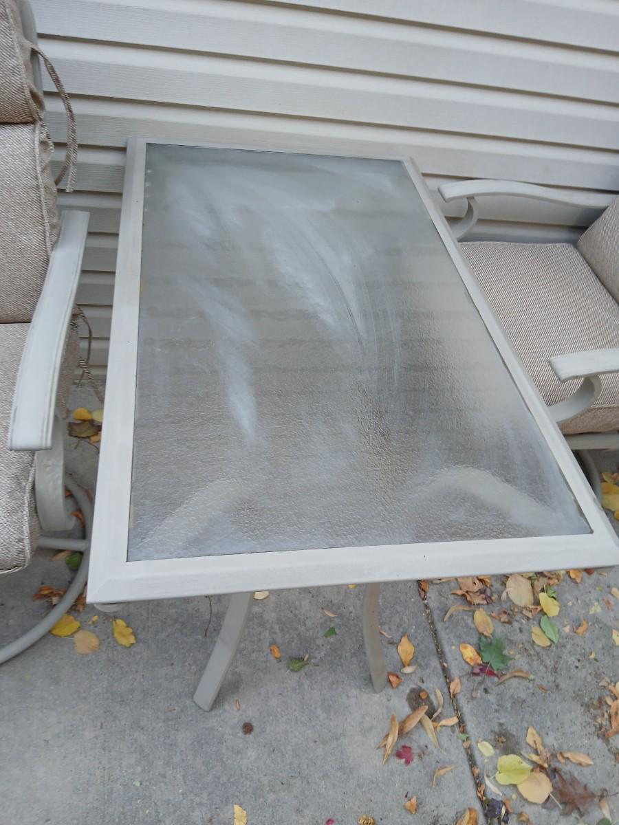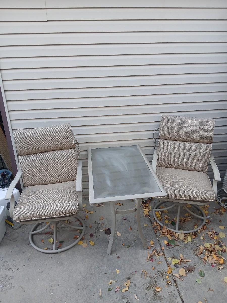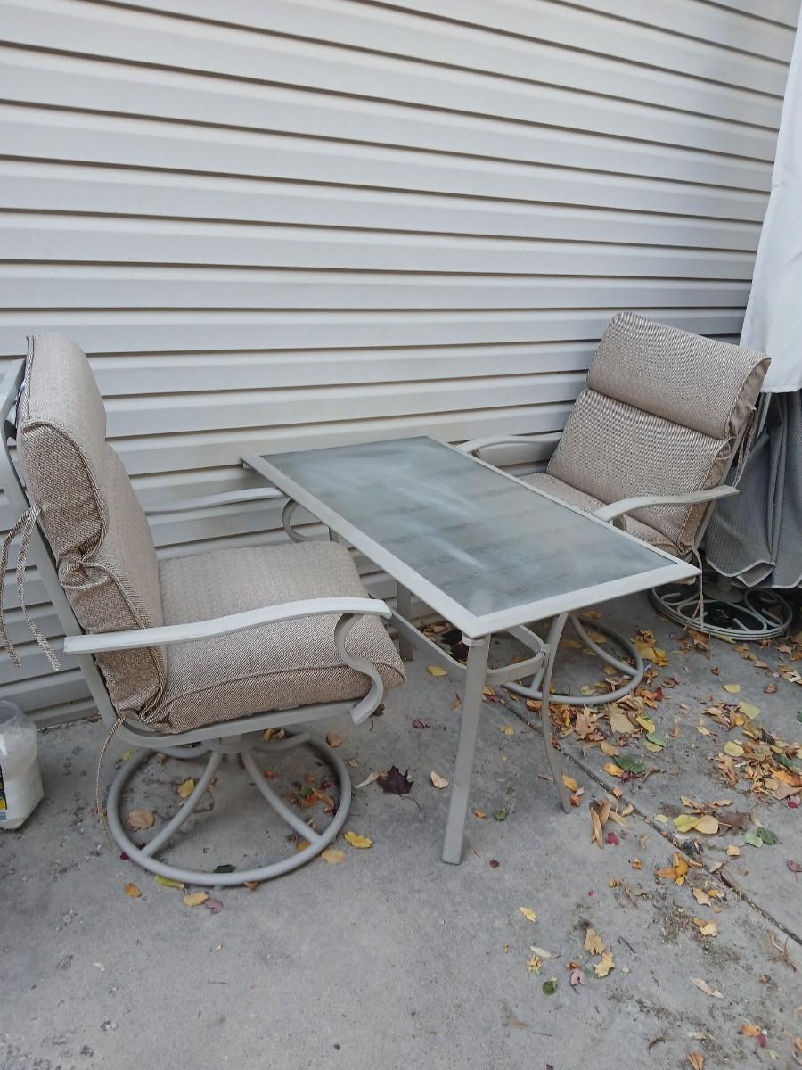Two patio chairs and cushions with small glass topped patio table