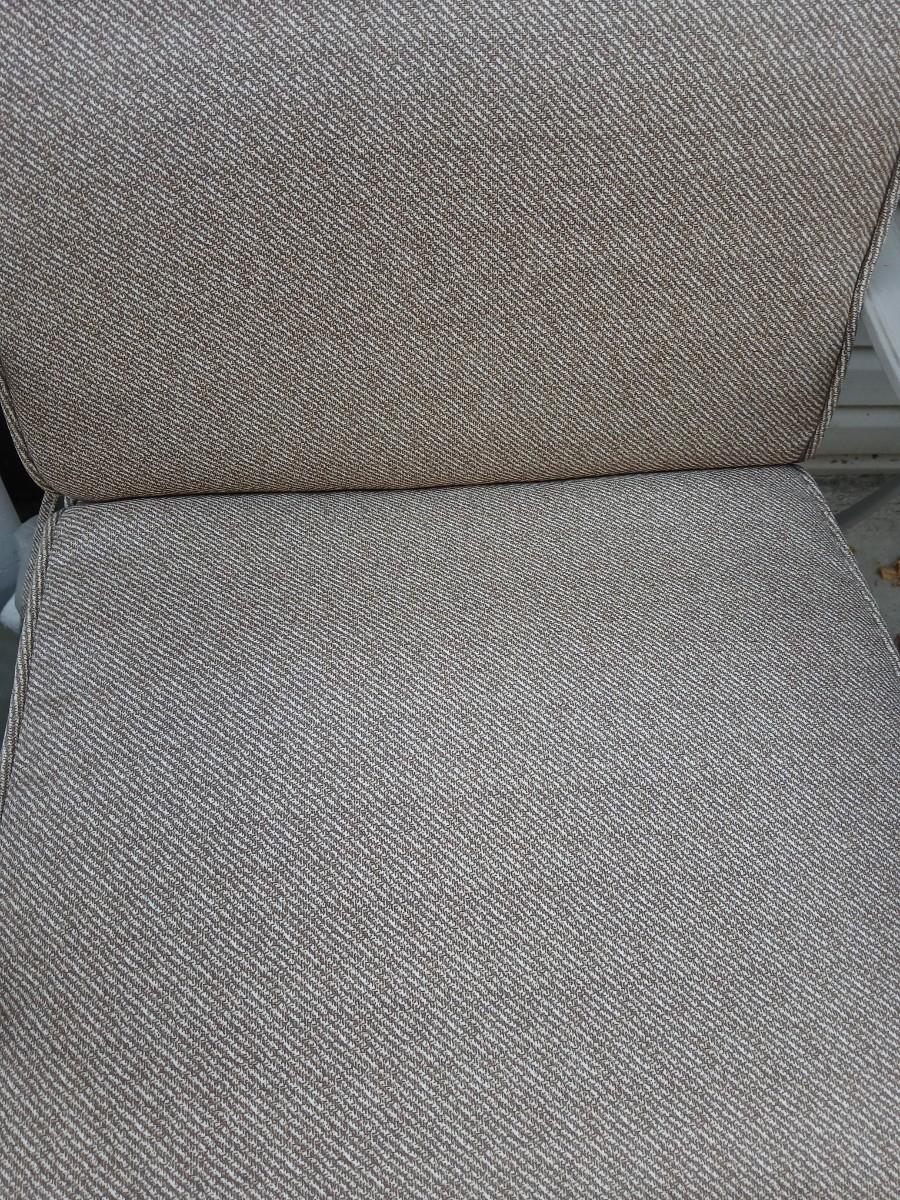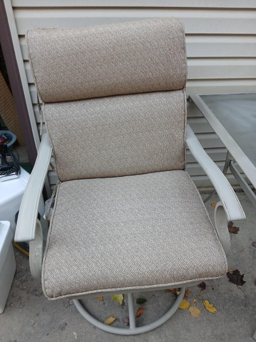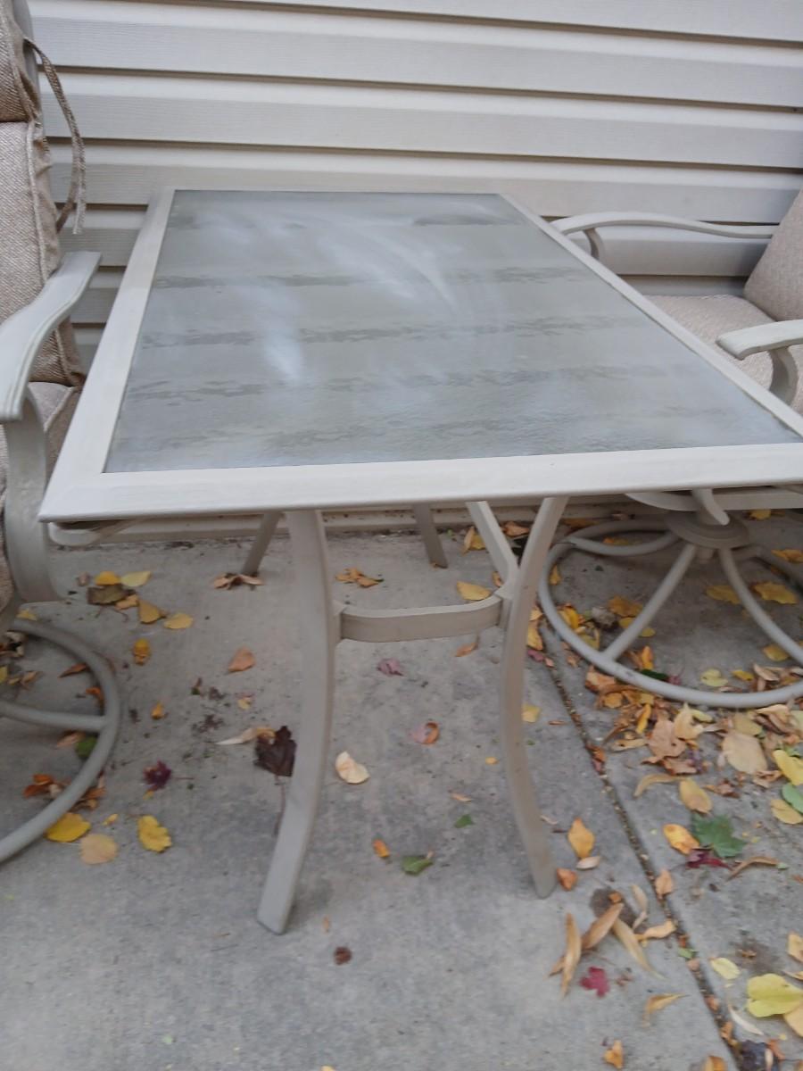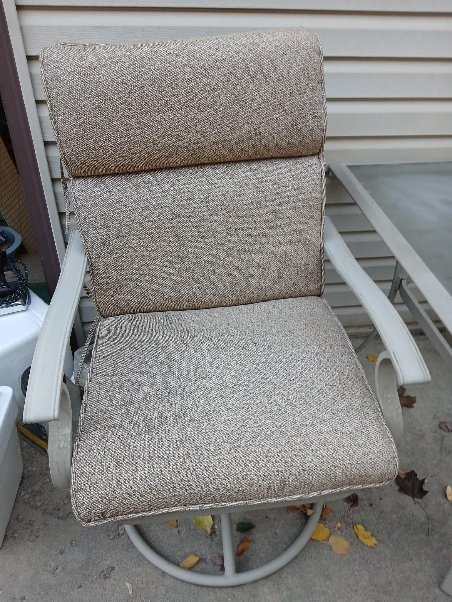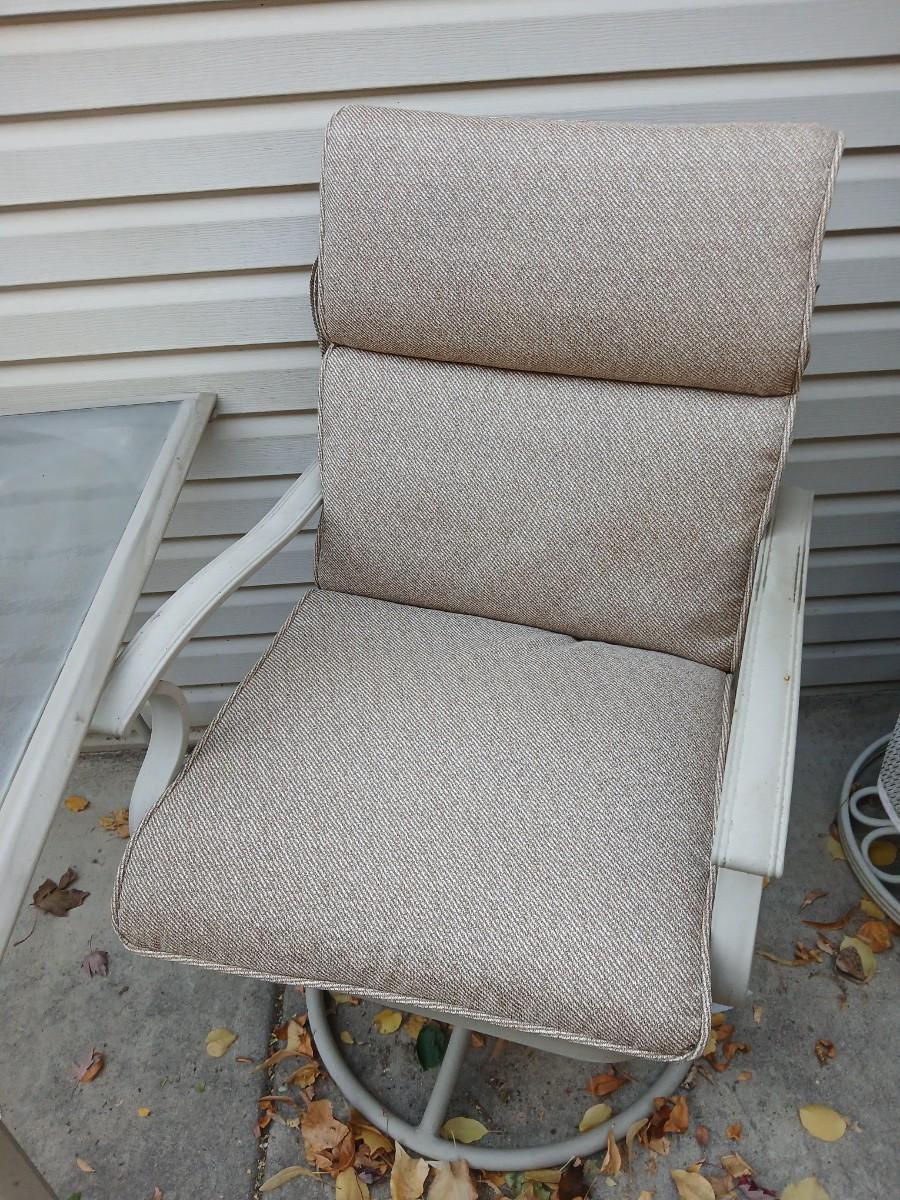 Two patio chairs and cushions with small glass topped patio table