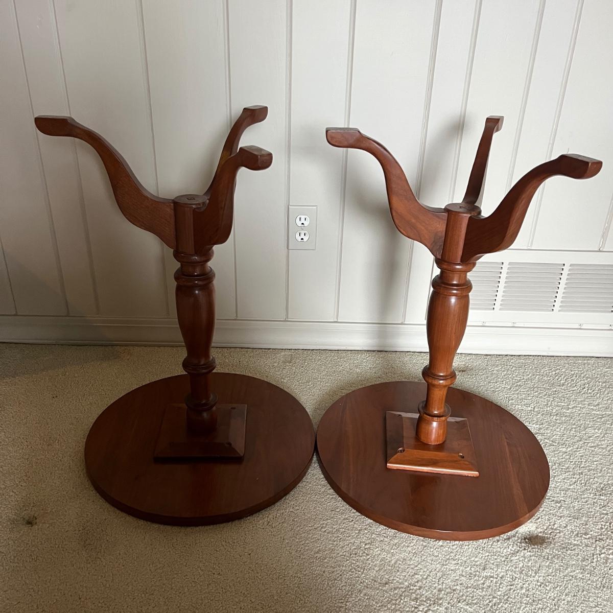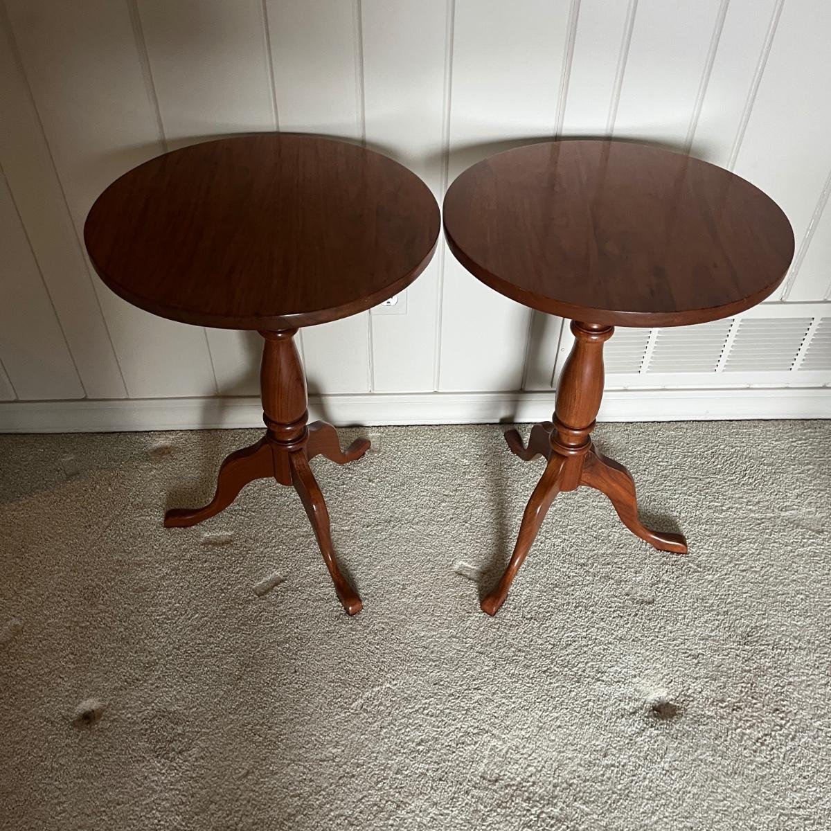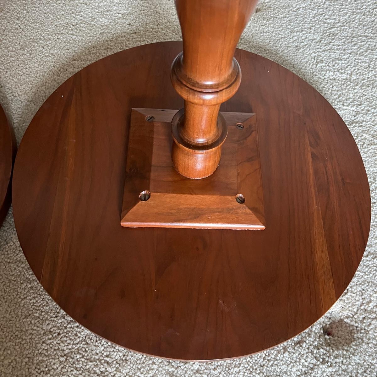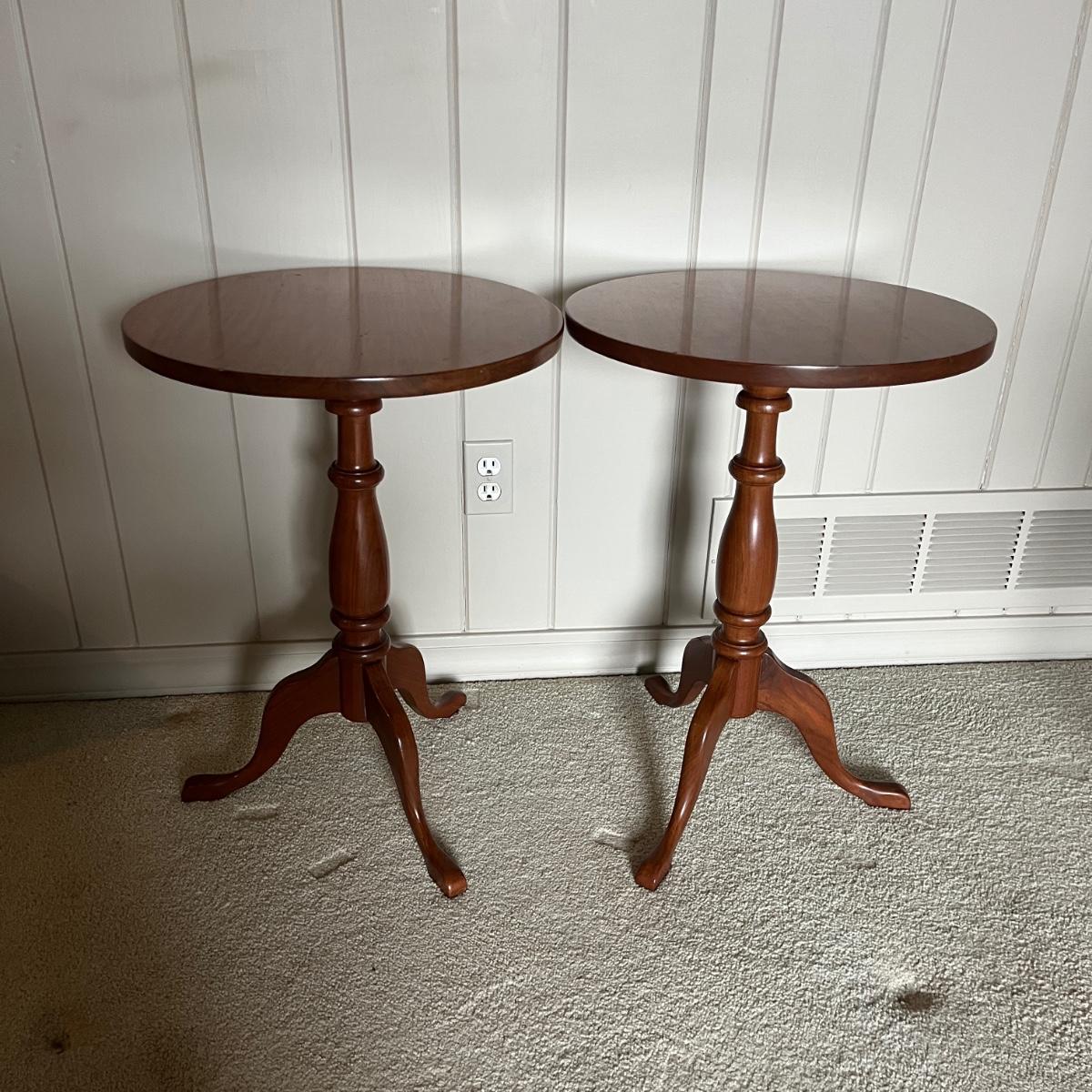 Lot includes two solid wood pedestal side tables that measure 18”D x 25.5”H.