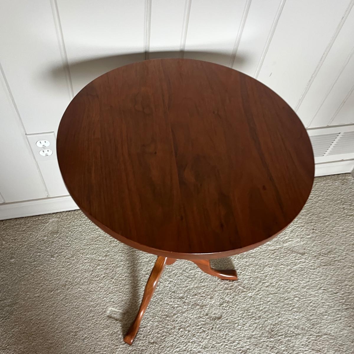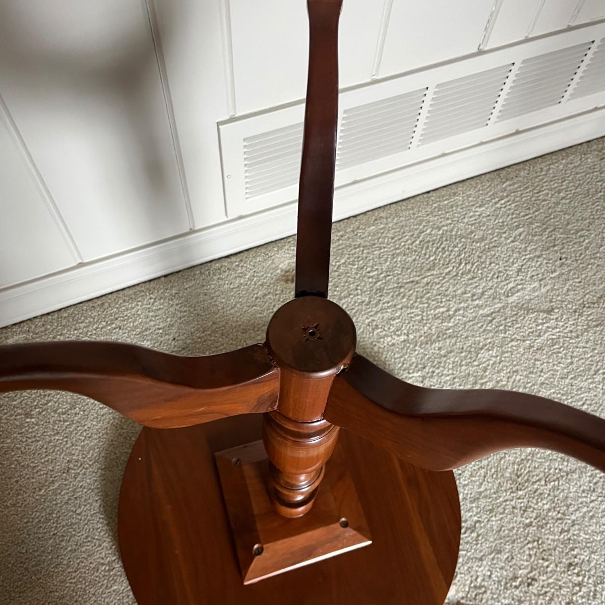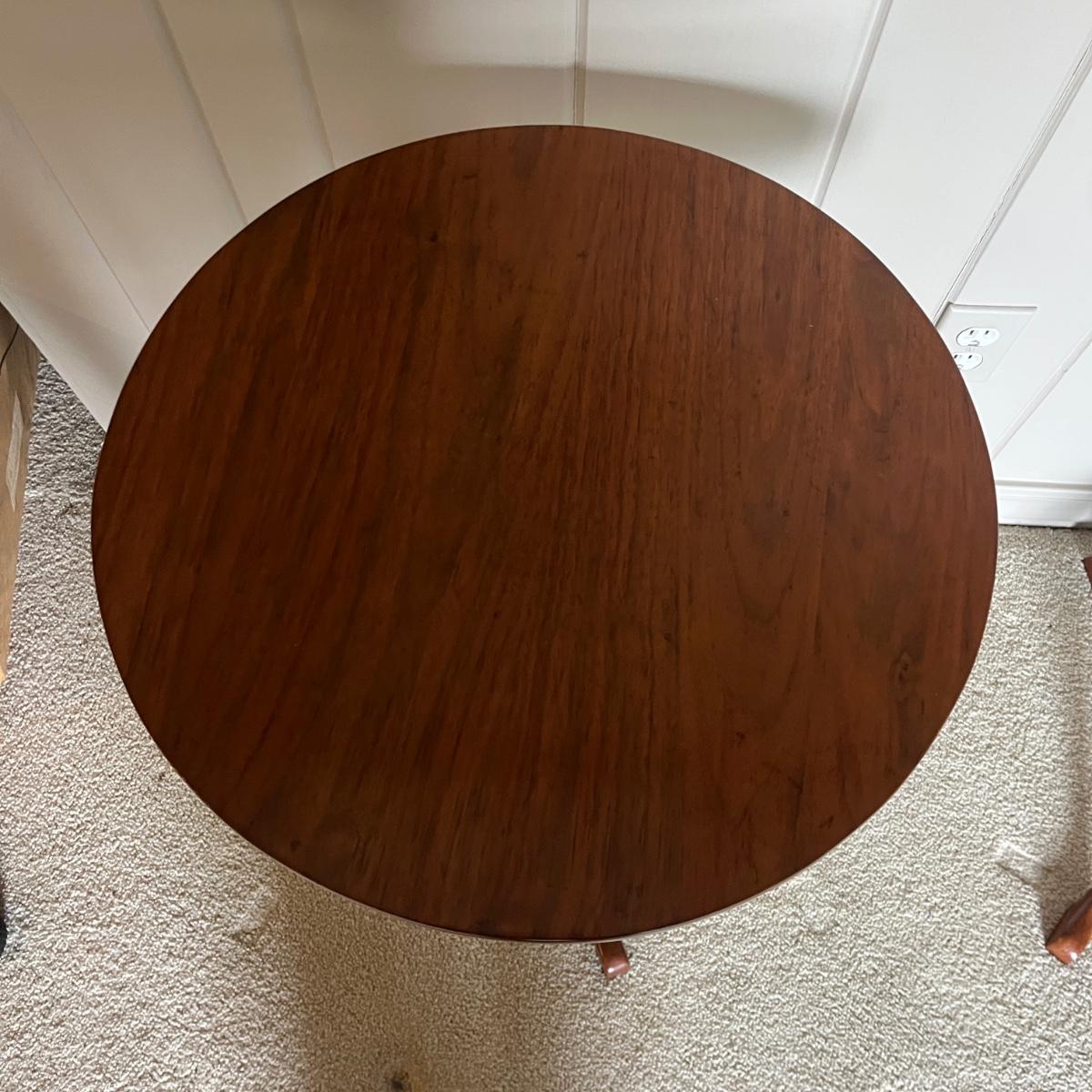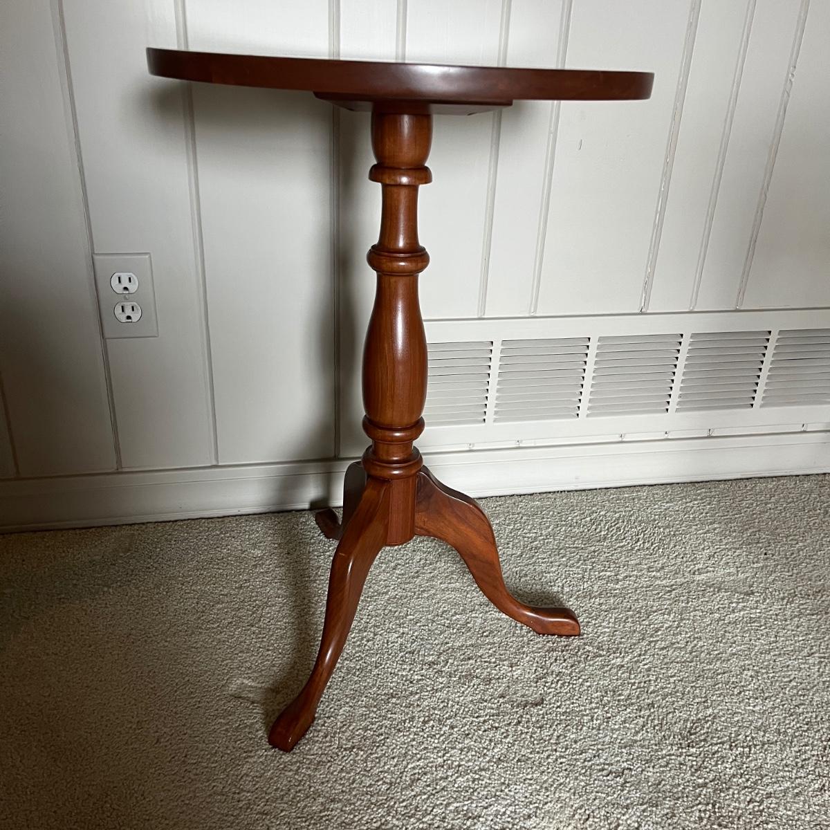 Lot includes two solid wood pedestal side tables that measure 18”D x 25.5”H.
