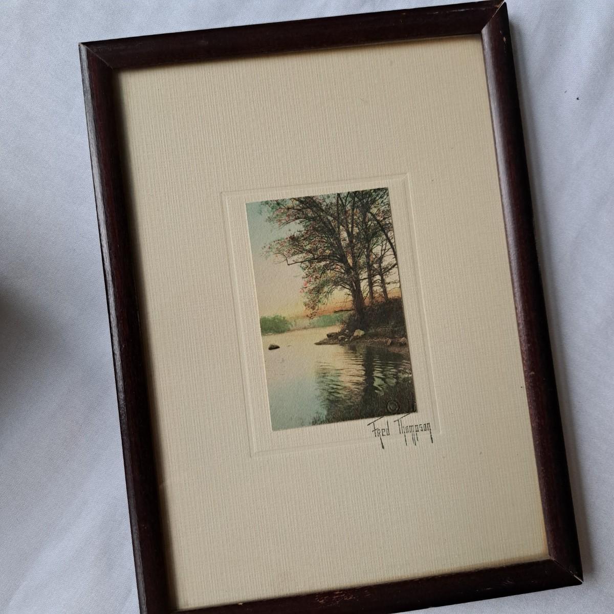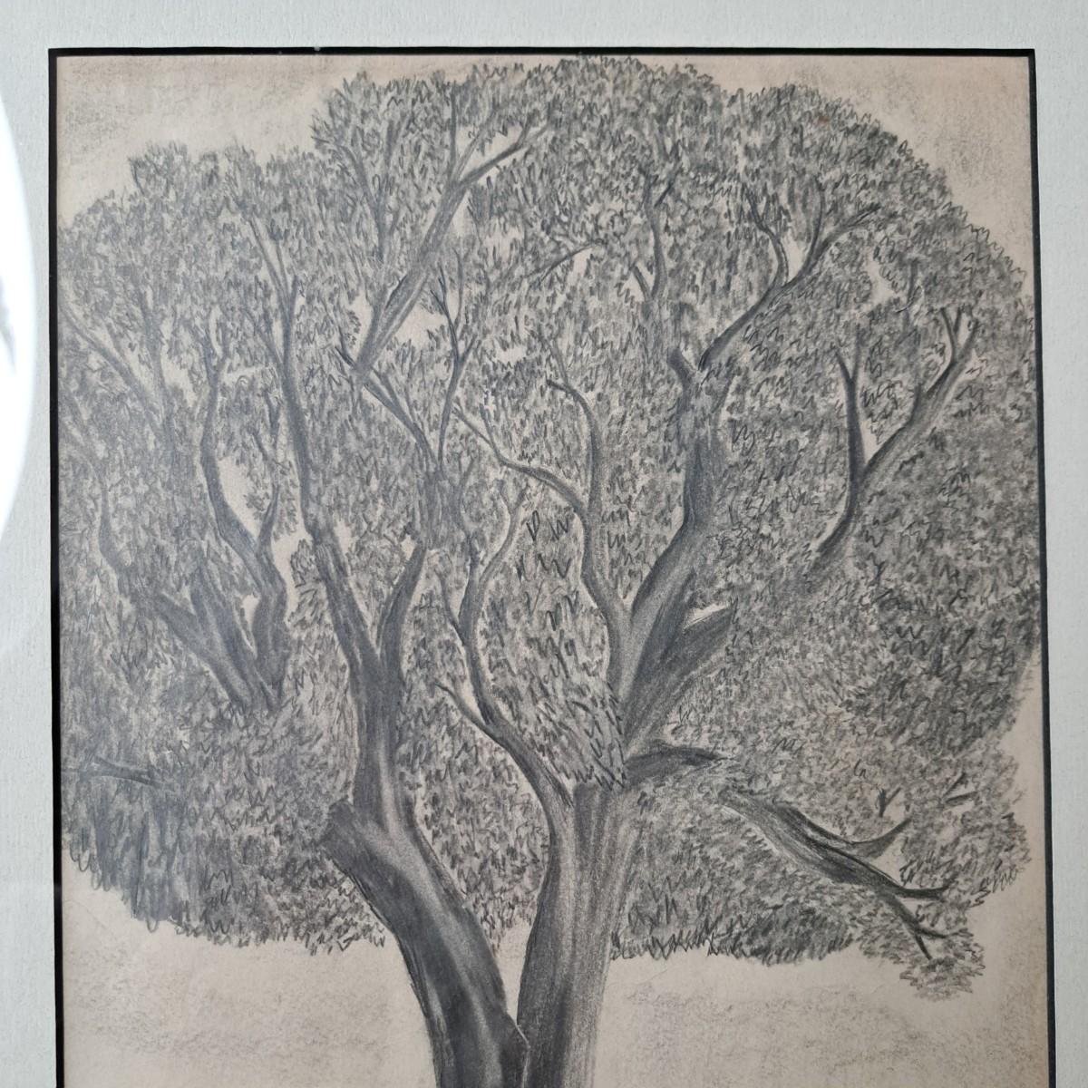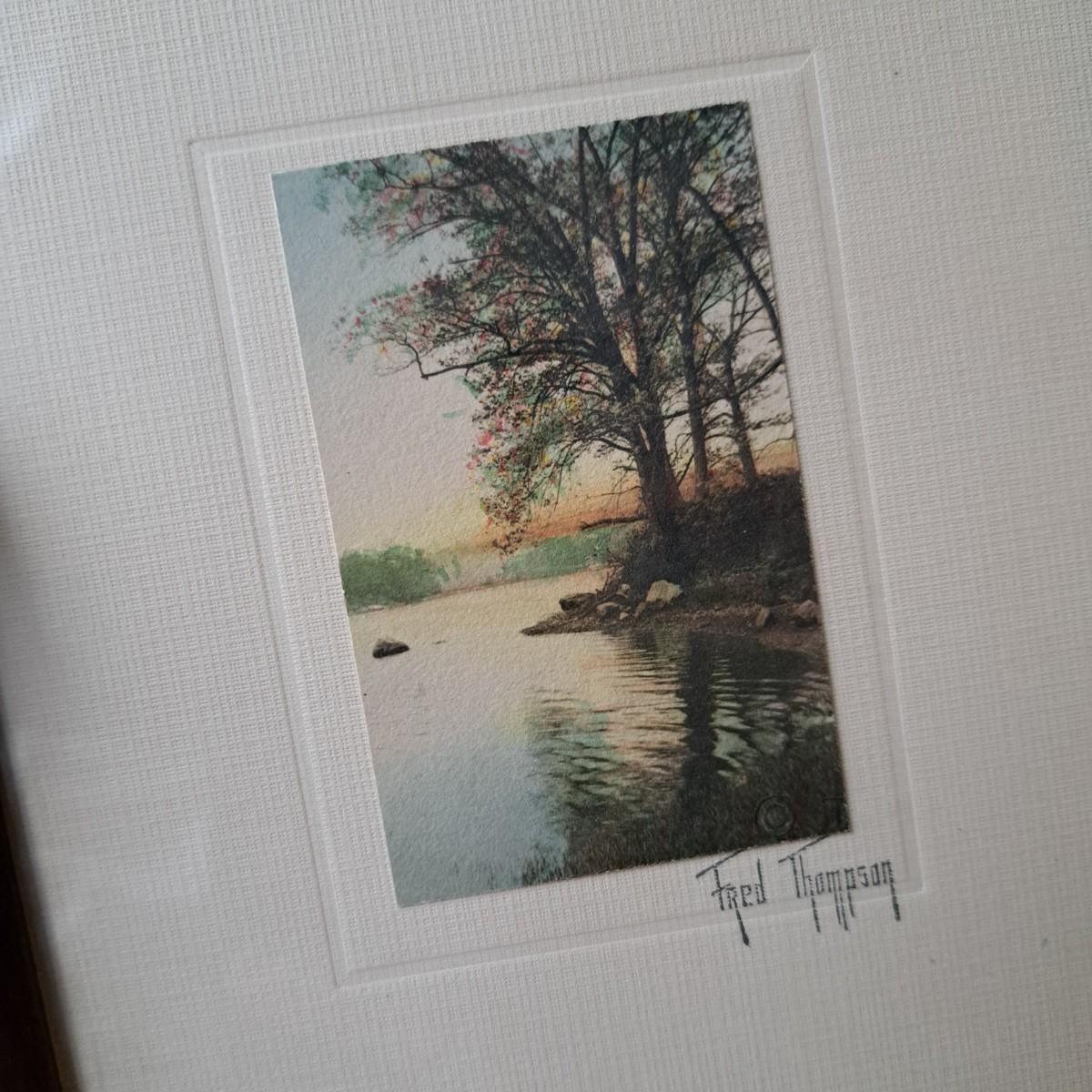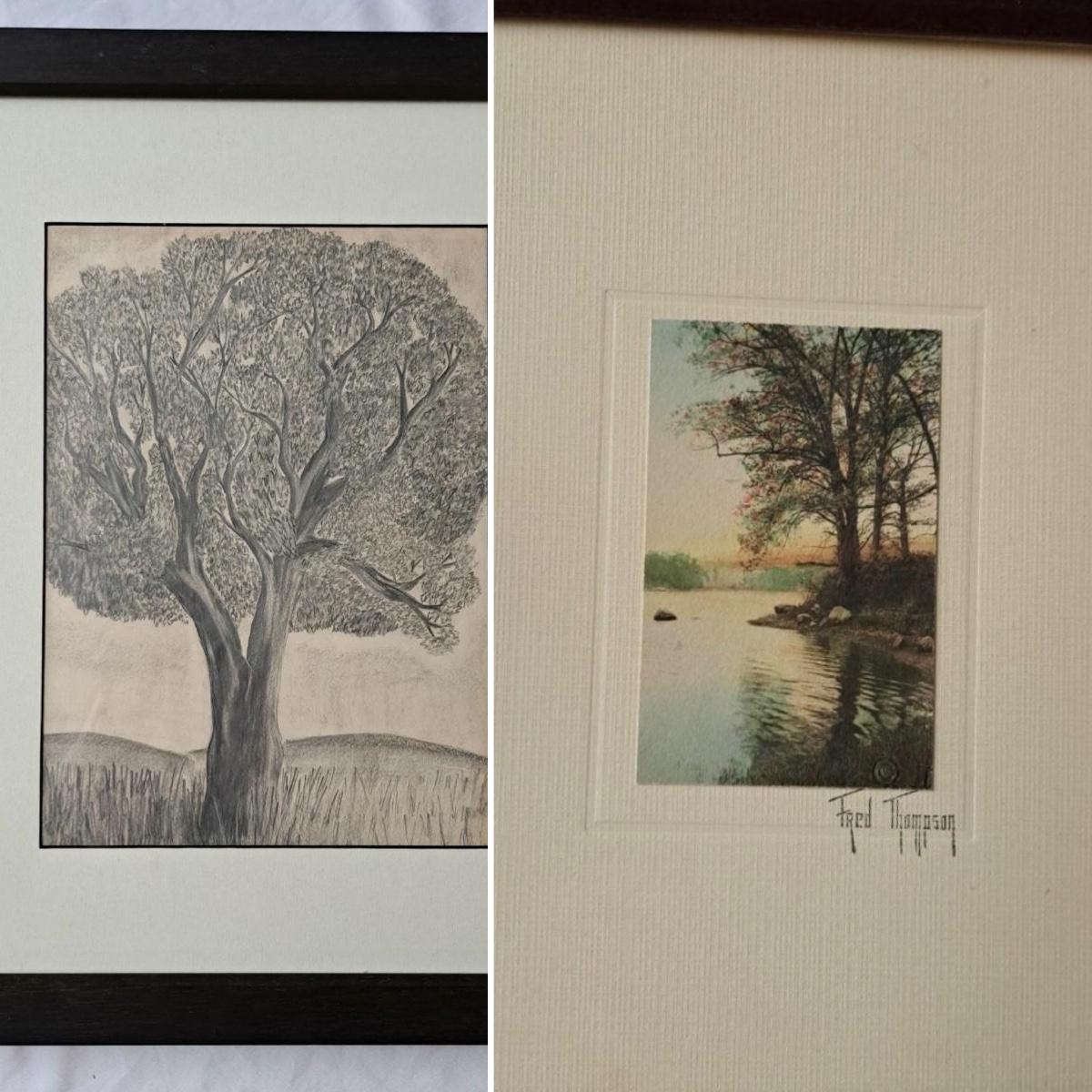 This lot consists of two images of trees. The first is a miniature hand-tinted photograph, 5.5" x 7.5," by photographer Frederick H. Thompson (1844-1909). It depicts a single tree at the edge of a rocky, rippled shore against a pink sky. The approximate size of photograph is 1.75" x 2.75"H. It bears the artist's signature in what appears to be pencil in lower right corner. There is also what appears to be a platemark on the edge of the corner of the photograph which is mounted on a linen mat set in a narrow wooden frame under glass. The second piece is an original drawing of a tree in pencil, 15" x 18.5"H, set in a wooden frame under plexi-glass and is unsigned. Shipping available. Shipping can be costly. We suggest contacting our preferred local shipping provider, Postage Express, with dimensions and getting an estimate before bidding: (828) 255-9250 or shipping@postageexpressnc.com.