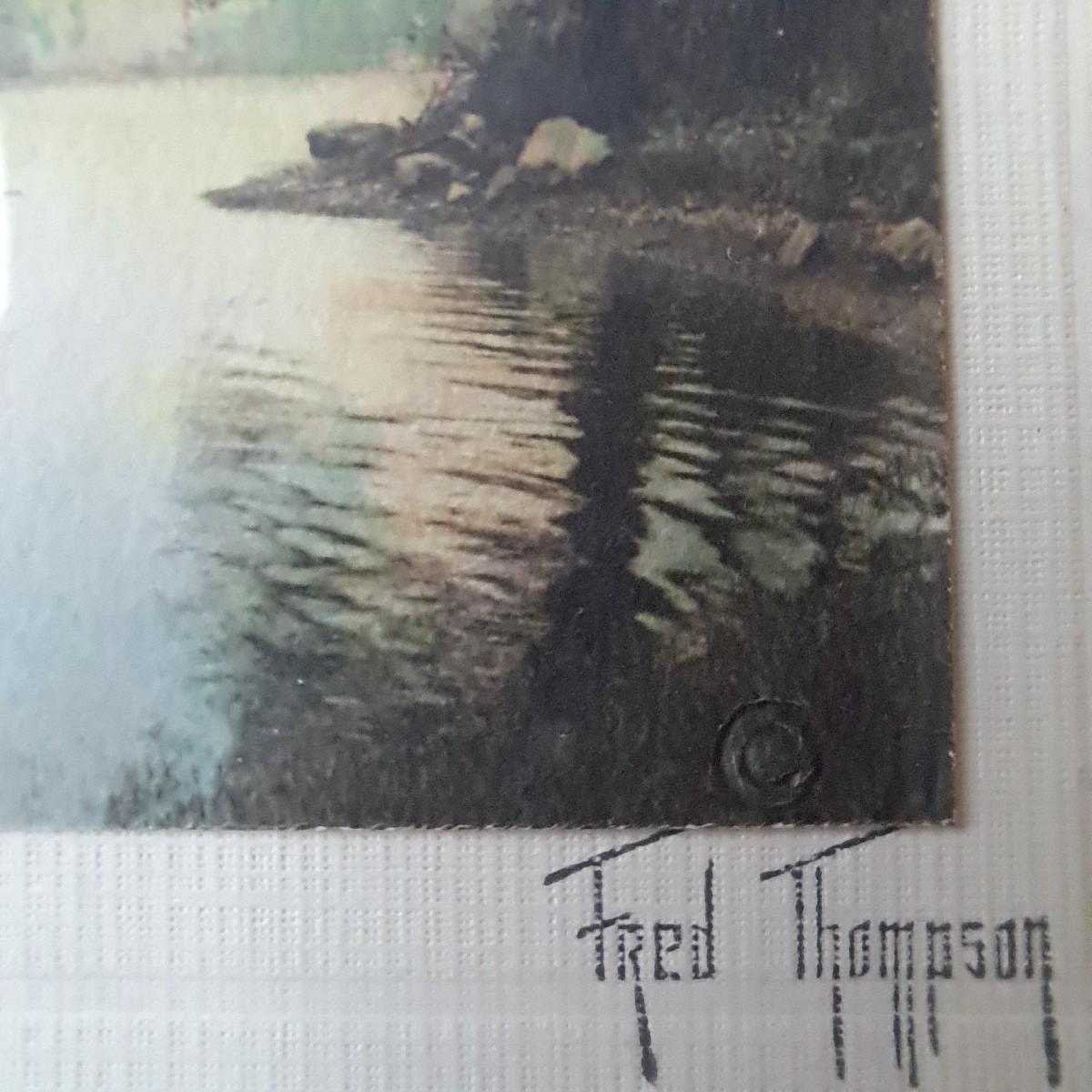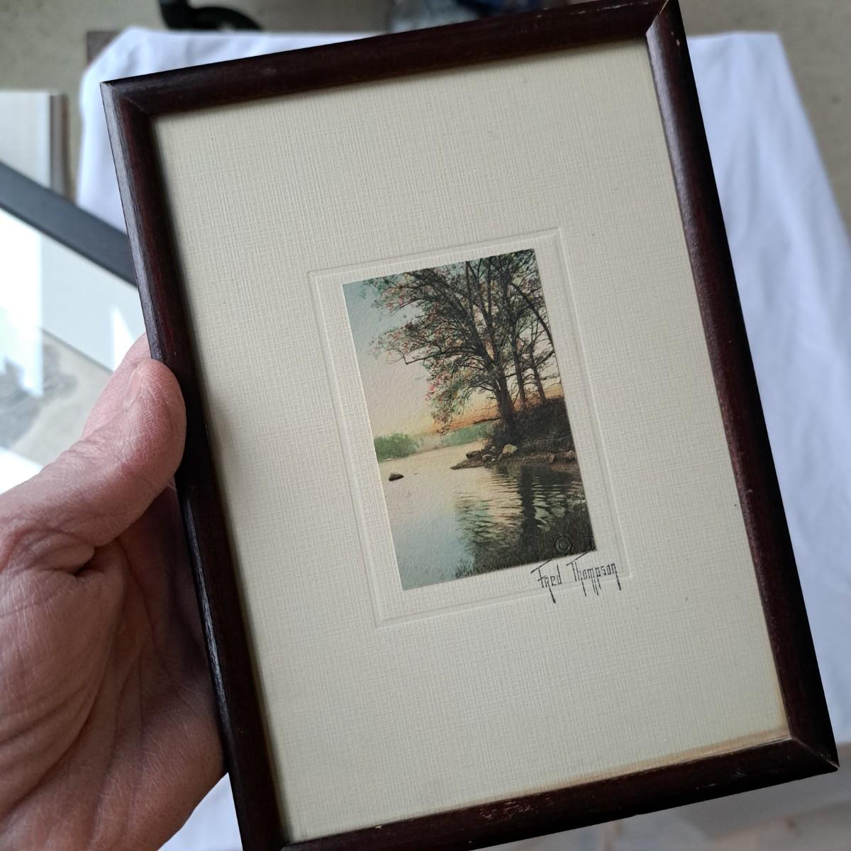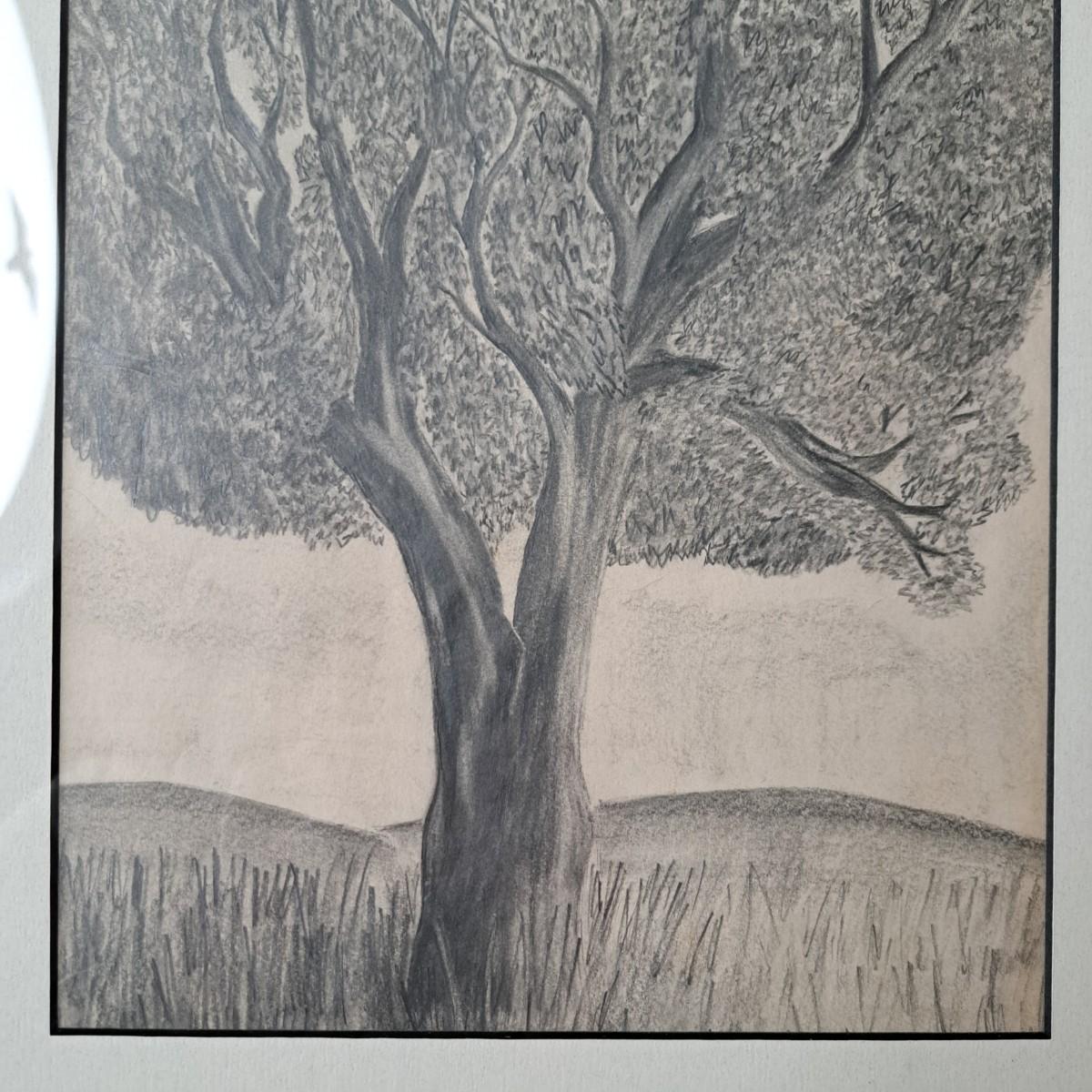 This lot consists of two images of trees. The first is a miniature hand-tinted photograph, 5.5" x 7.5," by photographer Frederick H. Thompson (1844-1909). It depicts a single tree at the edge of a rocky, rippled shore against a pink sky. The approximate size of photograph is 1.75" x 2.75"H. It bears the artist's signature in what appears to be pencil in lower right corner. There is also what appears to be a platemark on the edge of the corner of the photograph which is mounted on a linen mat set in a narrow wooden frame under glass. The second piece is an original drawing of a tree in pencil, 15" x 18.5"H, set in a wooden frame under plexi-glass and is unsigned. Shipping available. Shipping can be costly. We suggest contacting our preferred local shipping provider, Postage Express, with dimensions and getting an estimate before bidding: (828) 255-9250 or shipping@postageexpressnc.com.