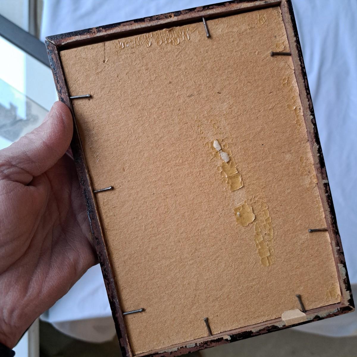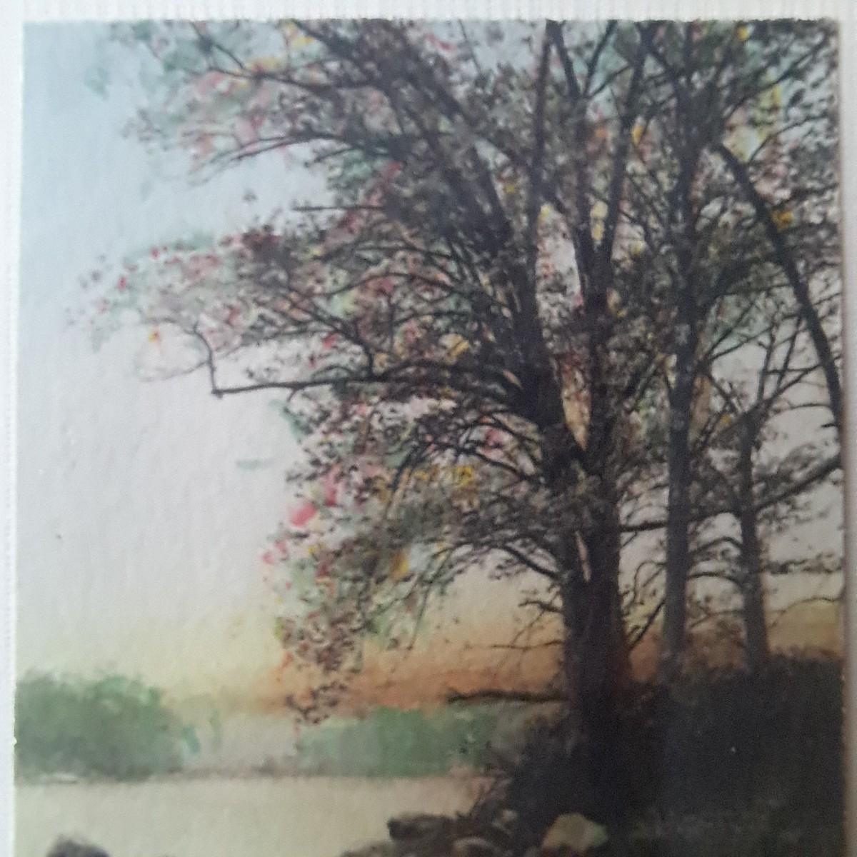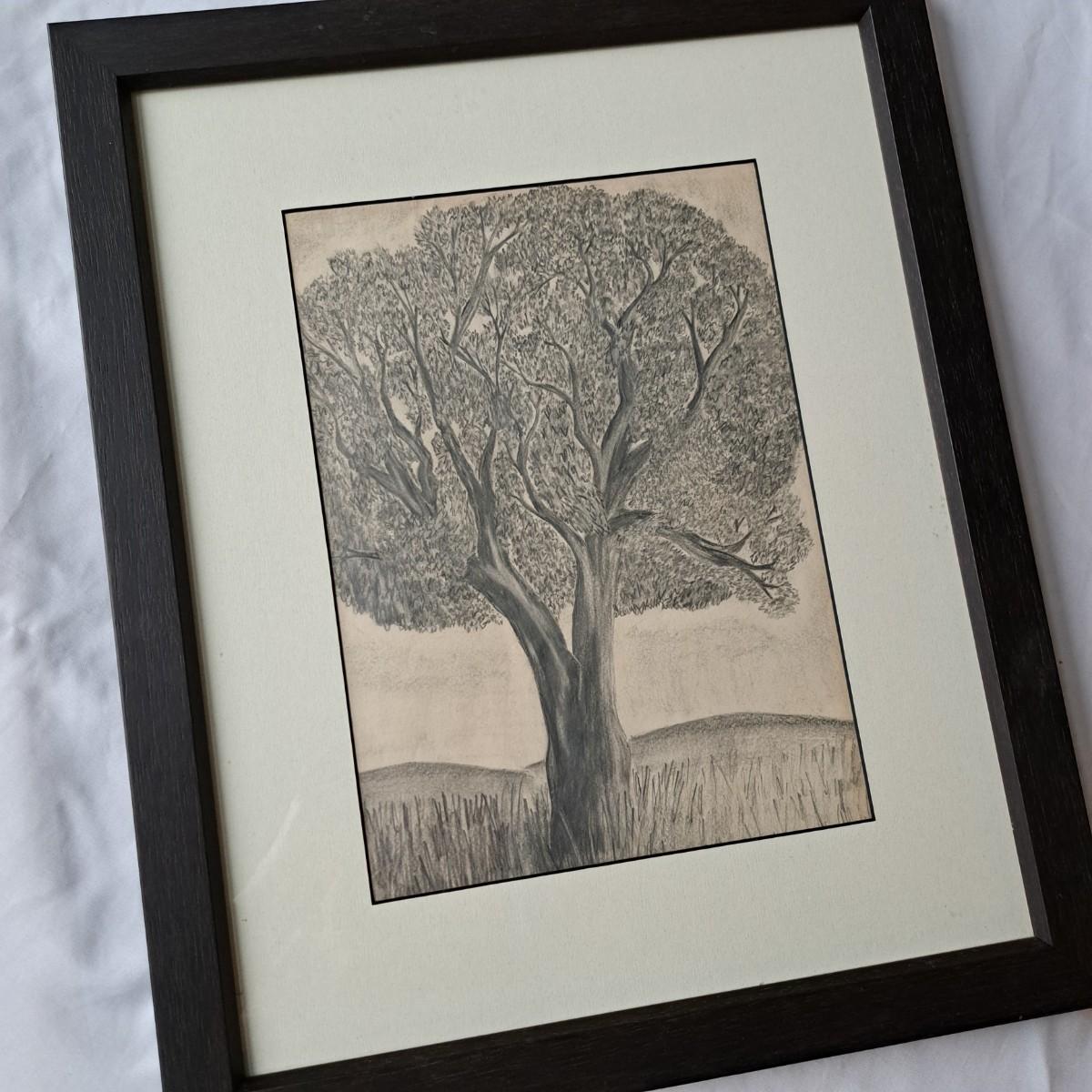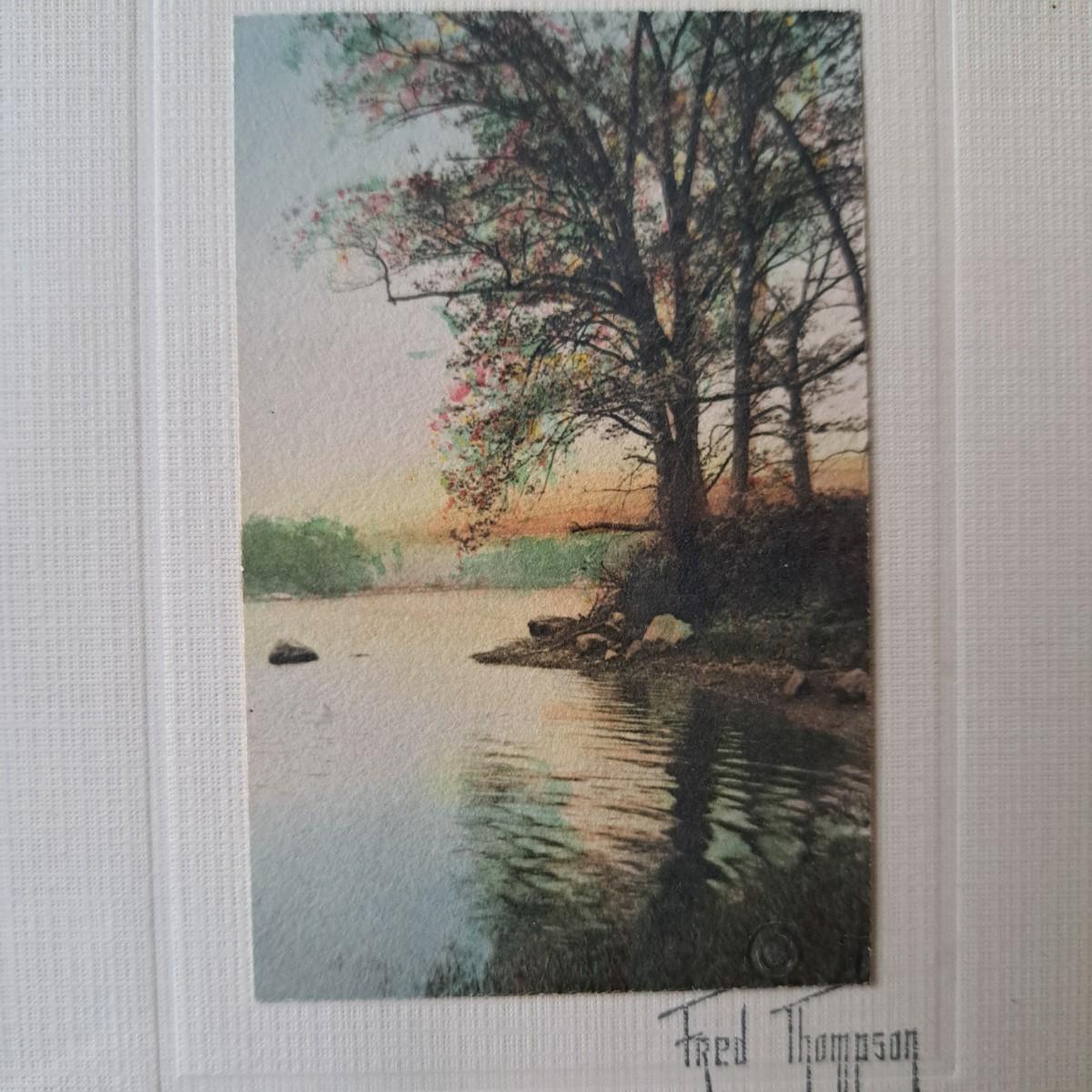 This lot consists of two images of trees. The first is a miniature hand-tinted photograph, 5.5" x 7.5," by photographer Frederick H. Thompson (1844-1909). It depicts a single tree at the edge of a rocky, rippled shore against a pink sky. The approximate size of photograph is 1.75" x 2.75"H. It bears the artist's signature in what appears to be pencil in lower right corner. There is also what appears to be a platemark on the edge of the corner of the photograph which is mounted on a linen mat set in a narrow wooden frame under glass. The second piece is an original drawing of a tree in pencil, 15" x 18.5"H, set in a wooden frame under plexi-glass and is unsigned. Shipping available. Shipping can be costly. We suggest contacting our preferred local shipping provider, Postage Express, with dimensions and getting an estimate before bidding: (828) 255-9250 or shipping@postageexpressnc.com.