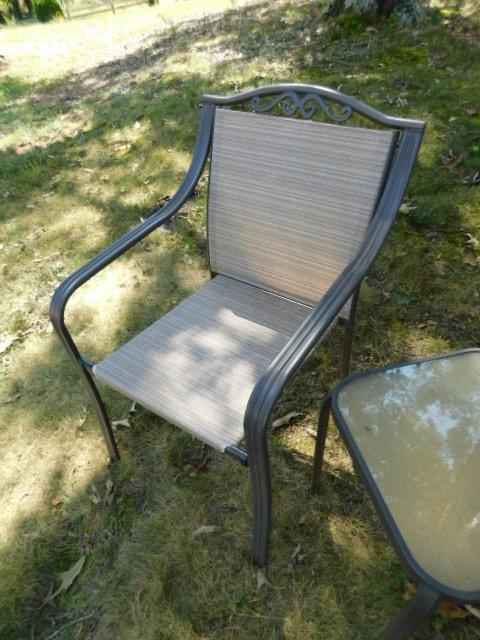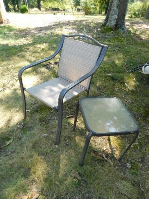 Two Piece Metal Frame and Fabric Seat/Back Patio Chair and Glass Top Side Table