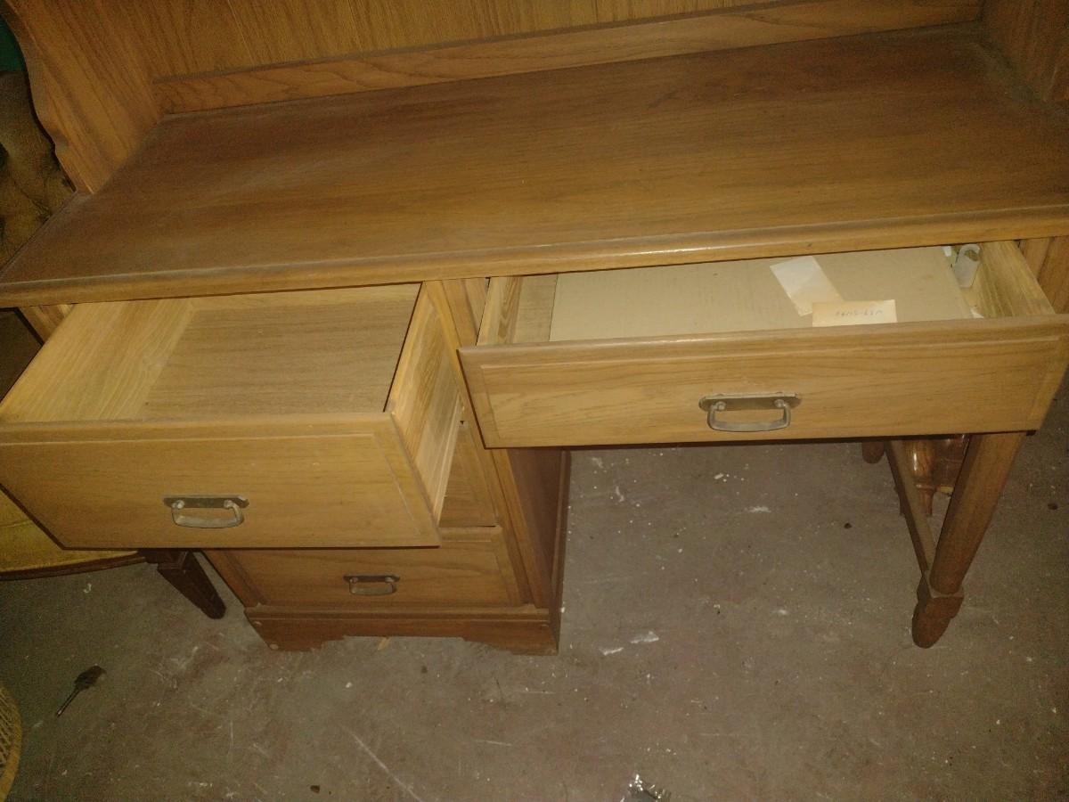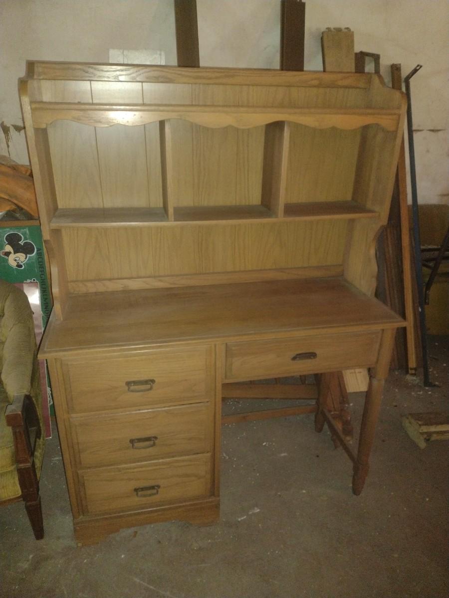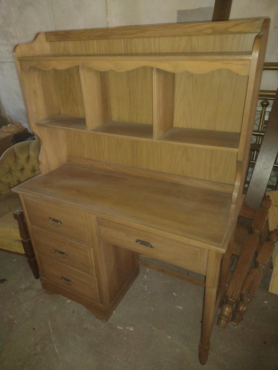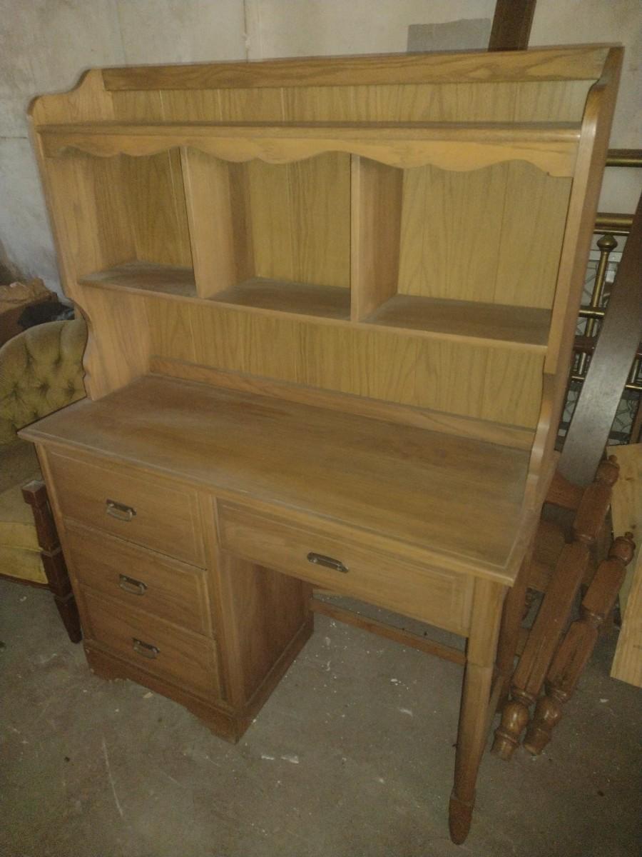 Two Piece Oak Finish Knee Hole Desk with Hutch Top. Upstairs item. Bring assistance to remove from building. Needs cleaning.