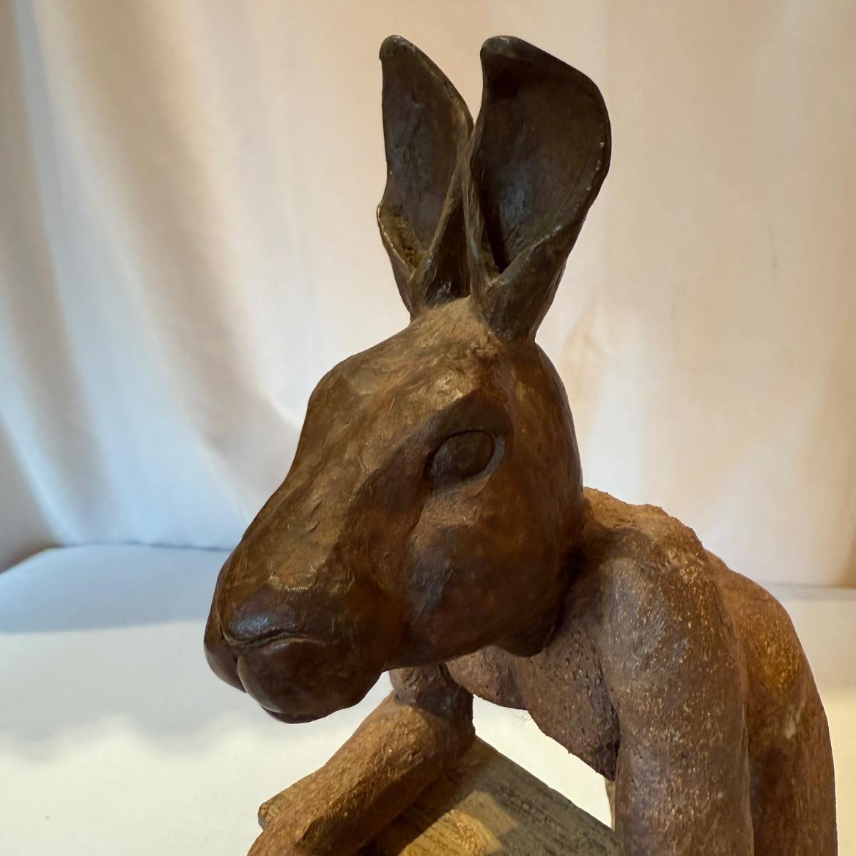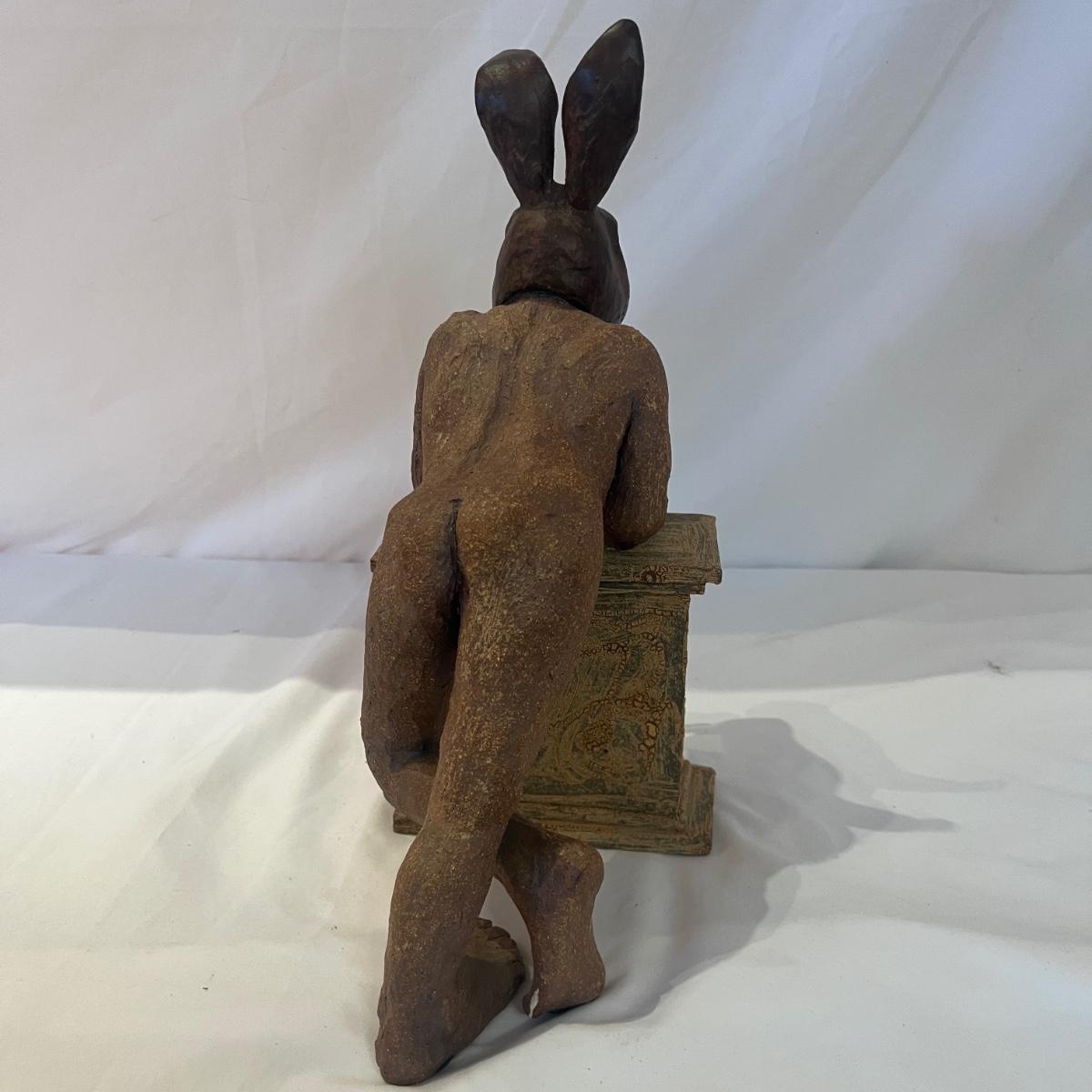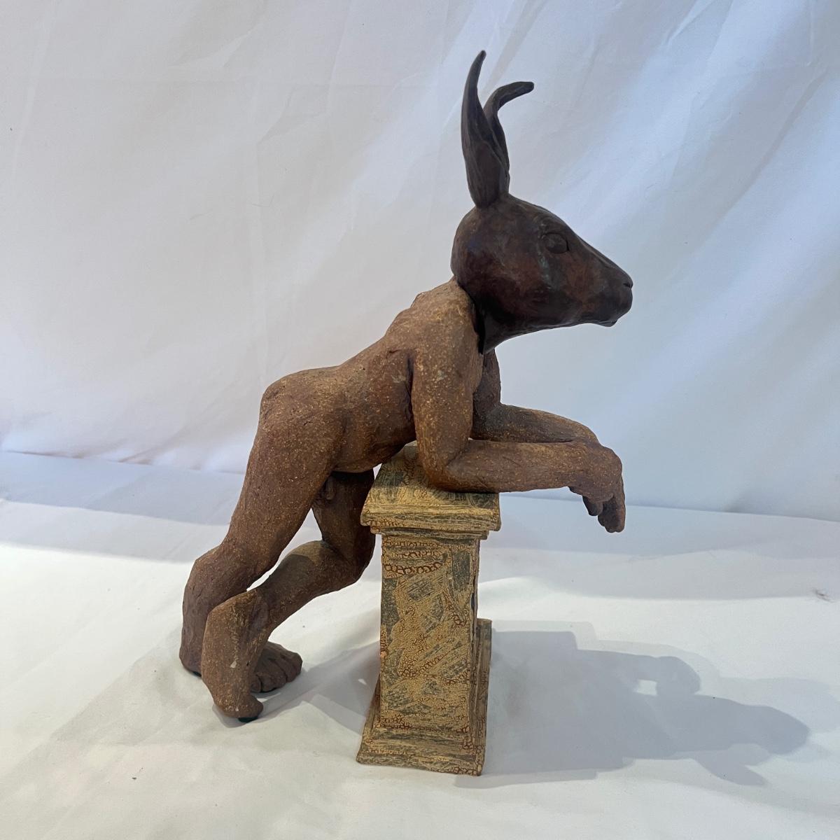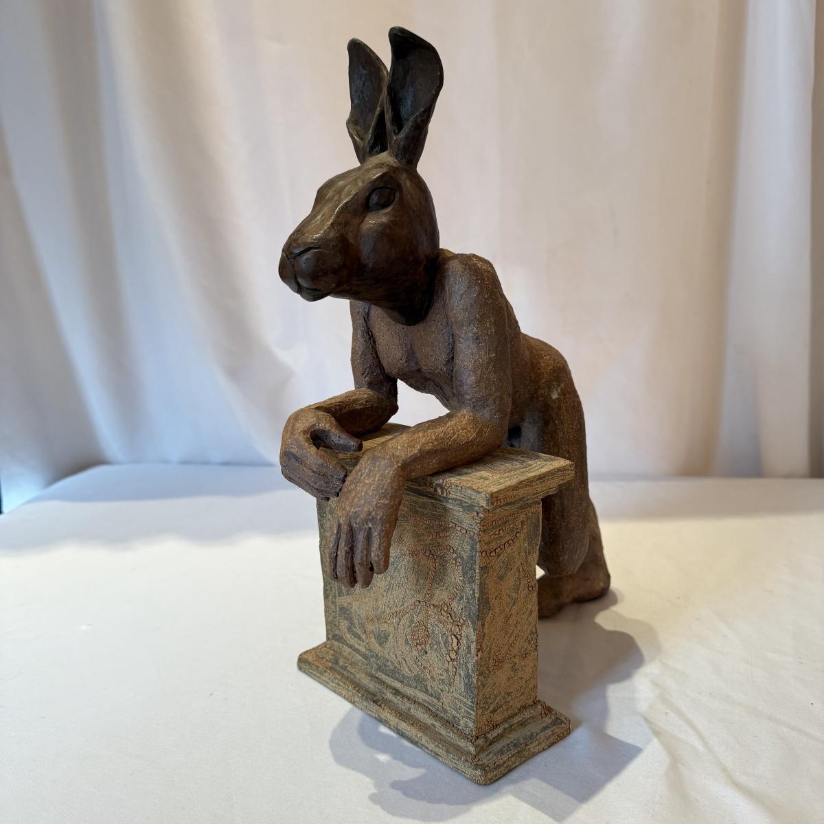 This piece of art is two pieces that both appear to be pottery. One piece is a rabbit head on a man’s body and the other is a lectern. Both pieces together measure 10” x 5.5” x 13”H.