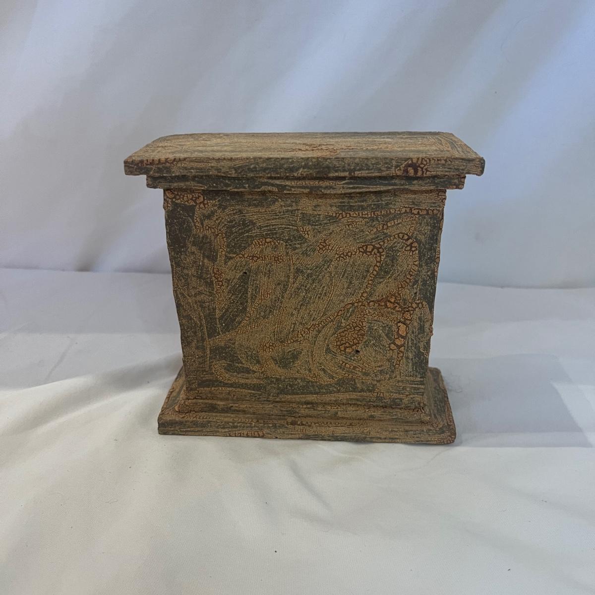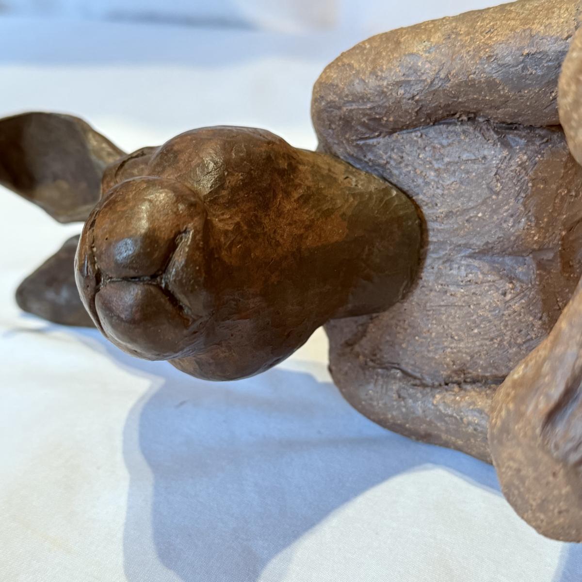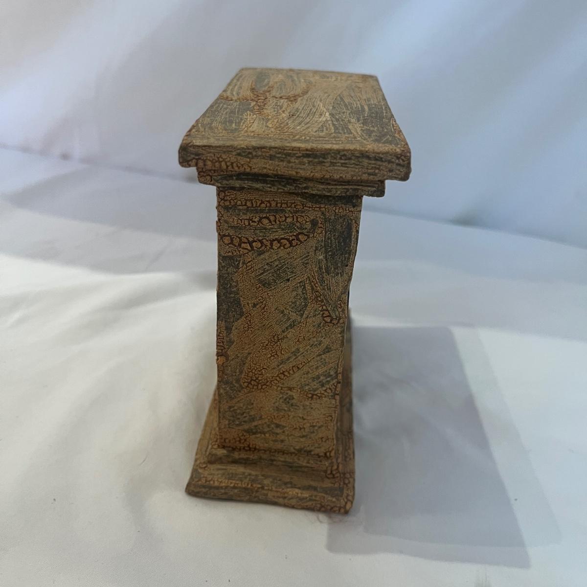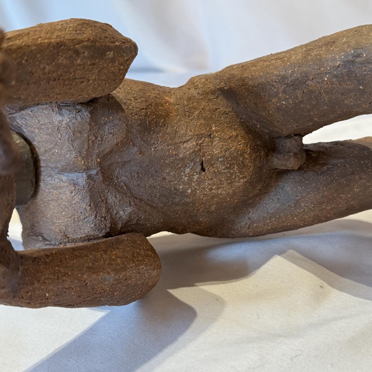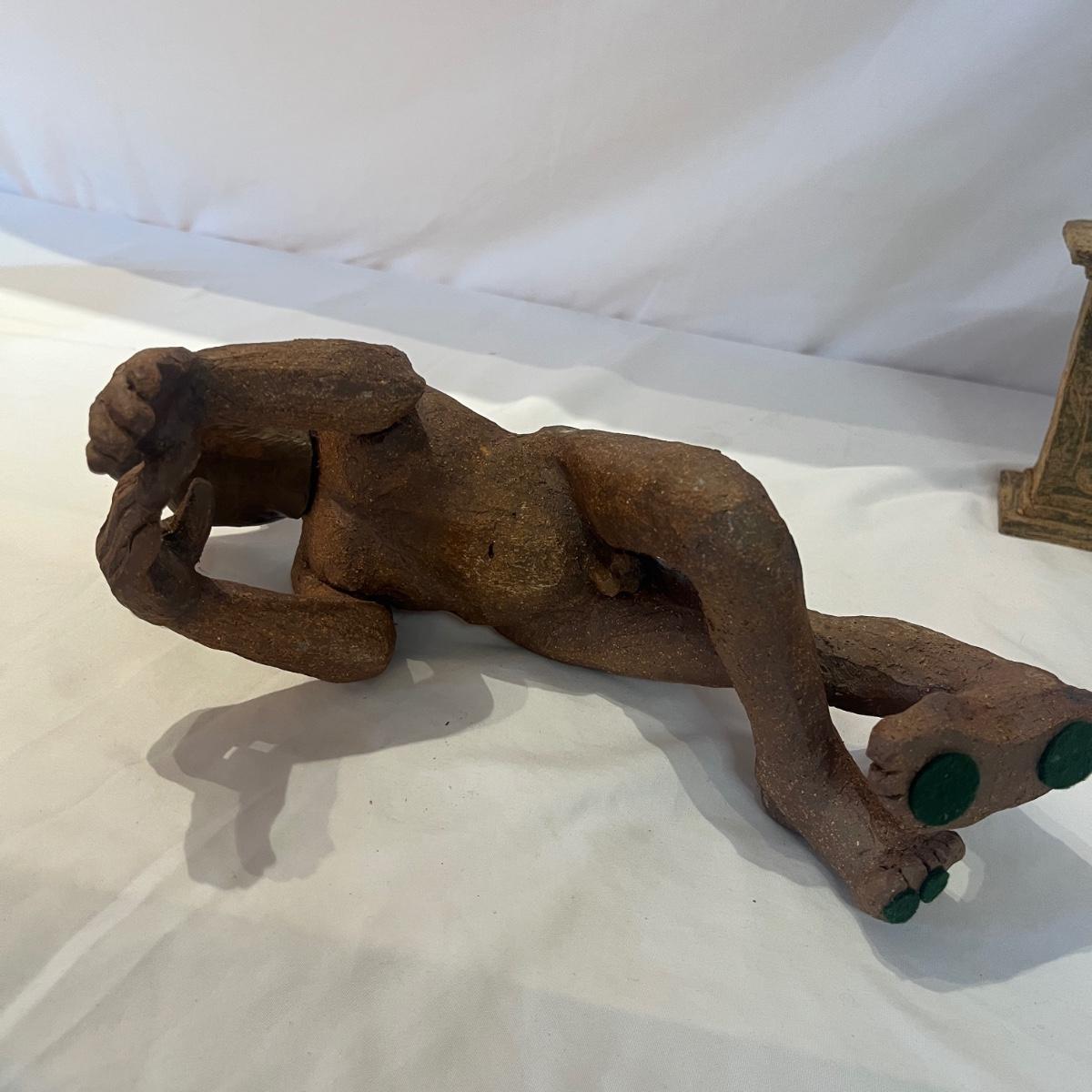 This piece of art is two pieces that both appear to be pottery. One piece is a rabbit head on a man’s body and the other is a lectern. Both pieces together measure 10” x 5.5” x 13”H.
