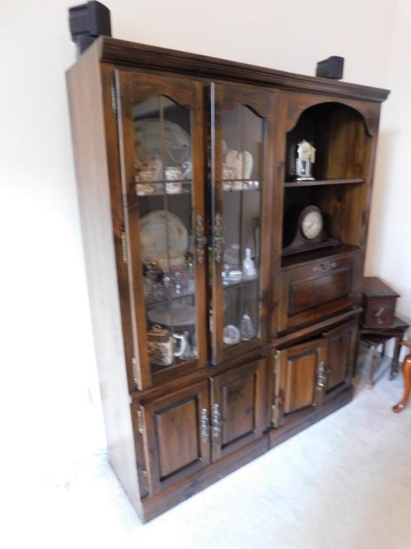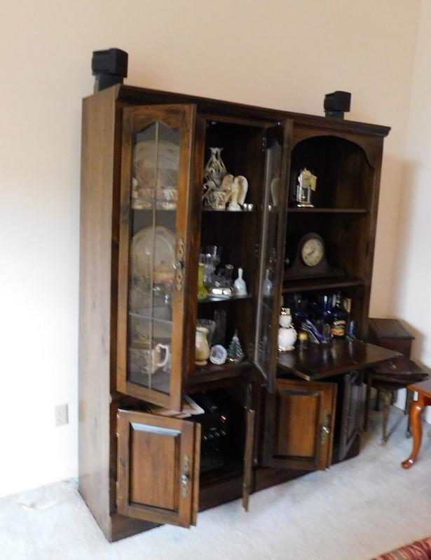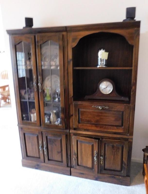 Two Piece Wall Hutch with Glass Doors and Open Book Shelf comes in two pieces. In good condition. Shelf lower door needs adjustment to remain closed. Contents not included.