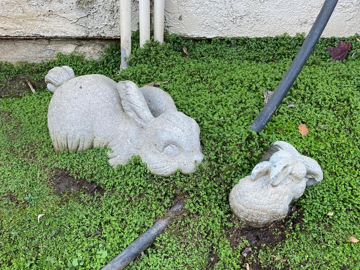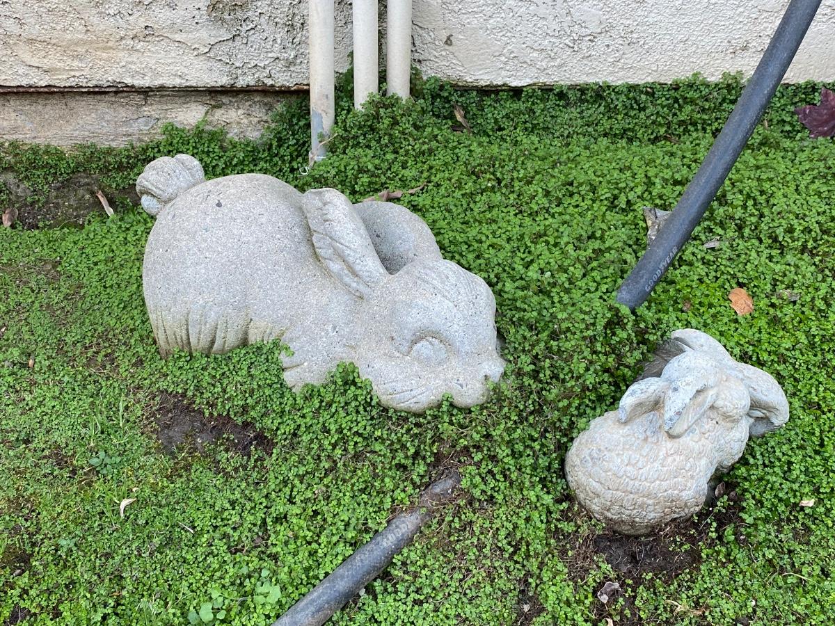 Cute pair of concrete bunny rabbit statues. Heavy concrete. Weathered and partially buried from being the yard. Look to be in good condition.