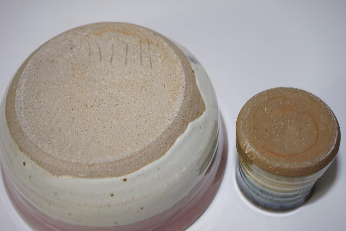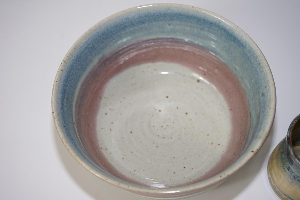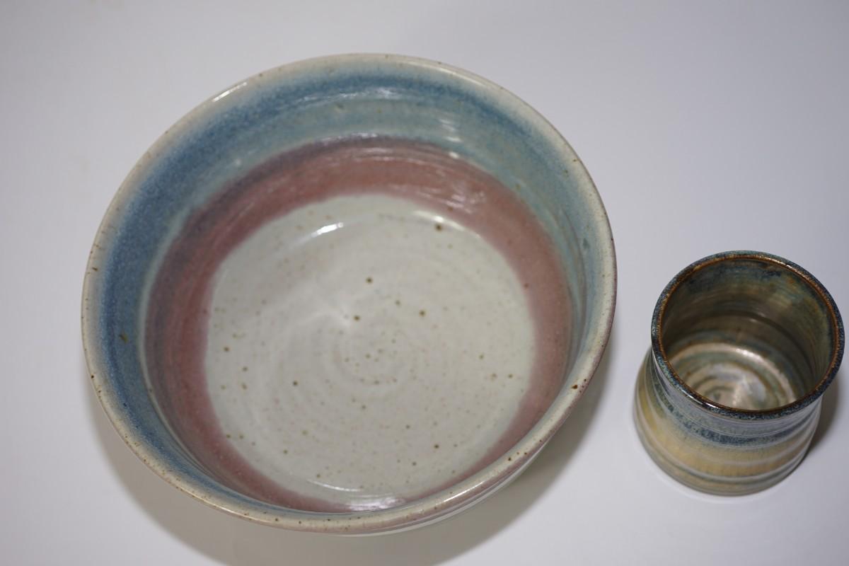 TWO PIECES OF HAND THROWN POTTERY BOWLS. PASTEL/ GLOSS GLAZE