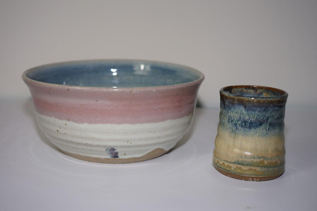 The smaller piece is a cup of earthtone high gloss glaze of brown , blue and cream color. 4' in height.