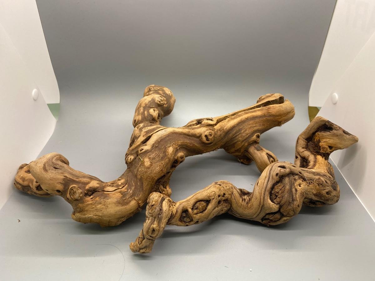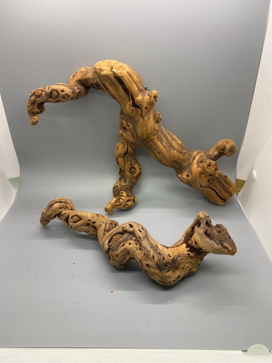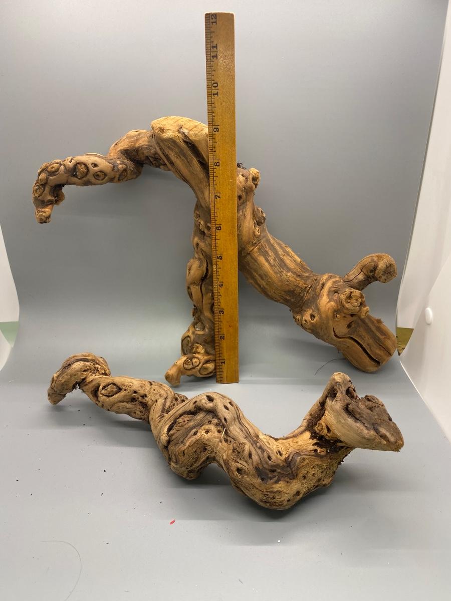 Two pieces of old twisted driftwood tree branches. In good condition. Great for display, crafts or reptile tanks. About 12" length.