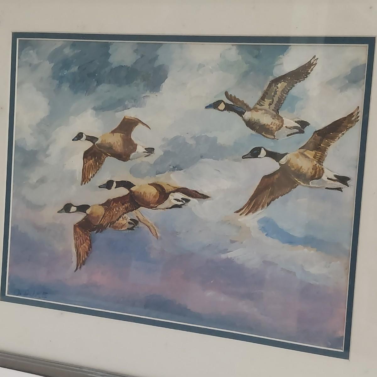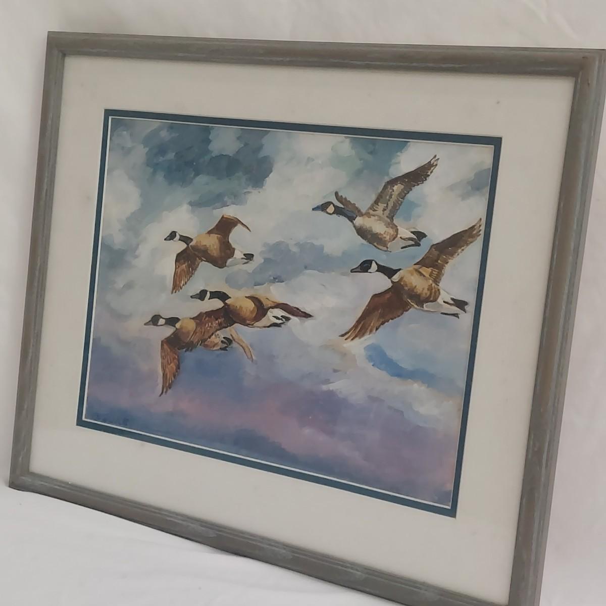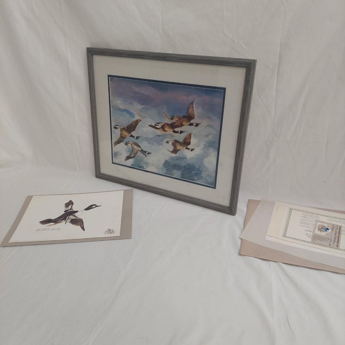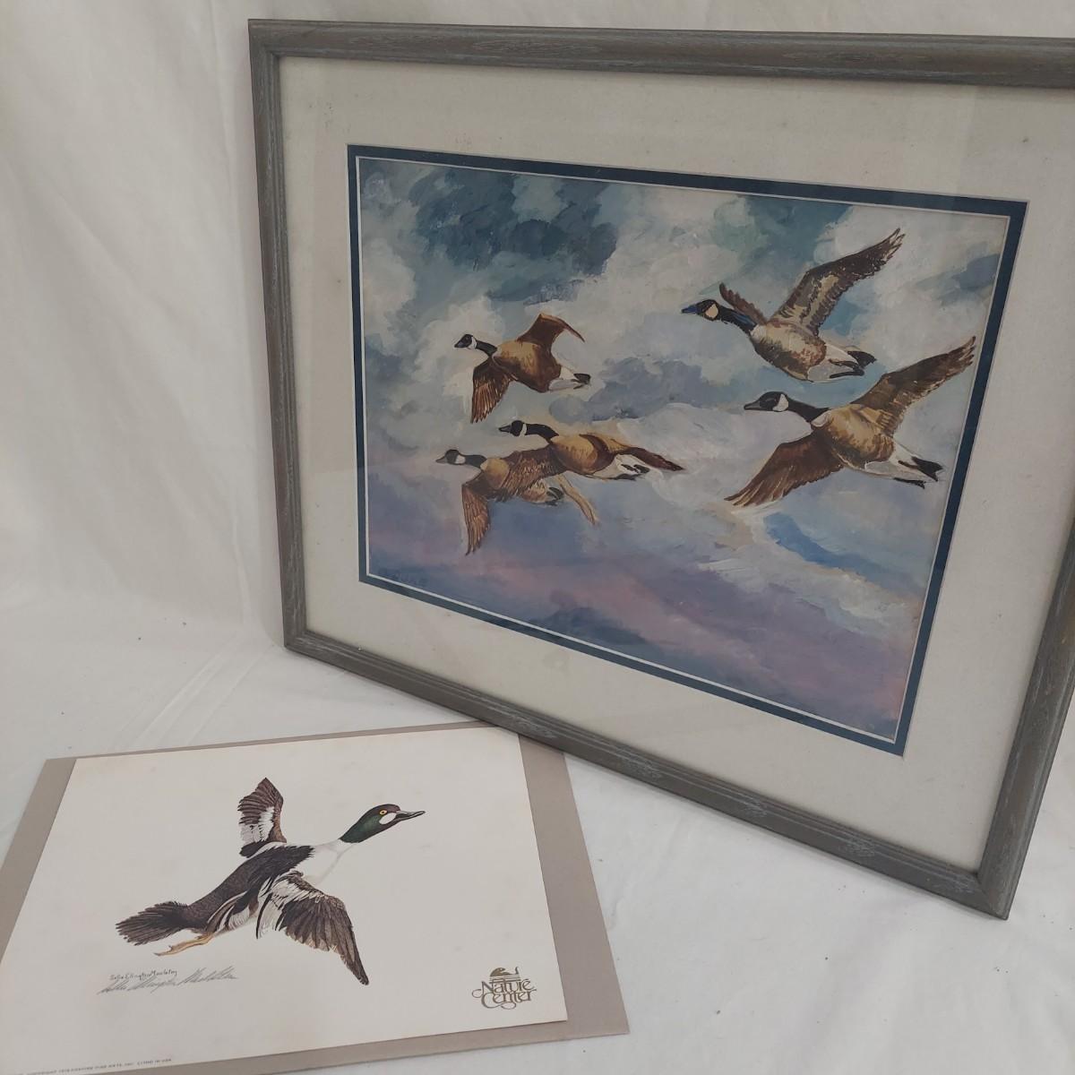 Lot includes framed goose art signed by O. Duke that appears to be a painting not a print. Frame is wood and measures 18” x 15"H. Also includes a signed and numbered print by Sallie Elizabeth Middleton. Some condition issues. Please see photos for details. The framed piece’s art is protected under glass. Shipping available. Shipping can be costly. We suggest contacting our preferred local shipping provider, Postage Express, with dimensions and getting an estimate before bidding: 828-255-9250 or shipping@postageexpressnc.com