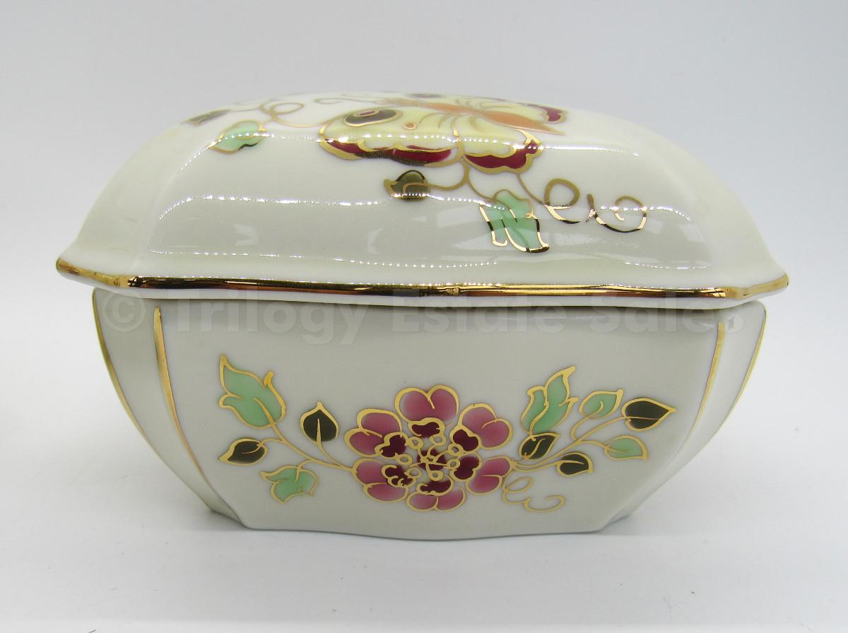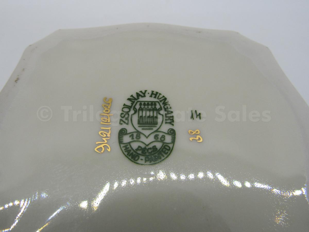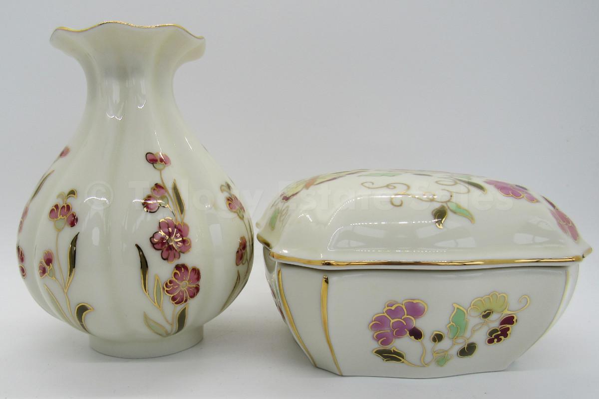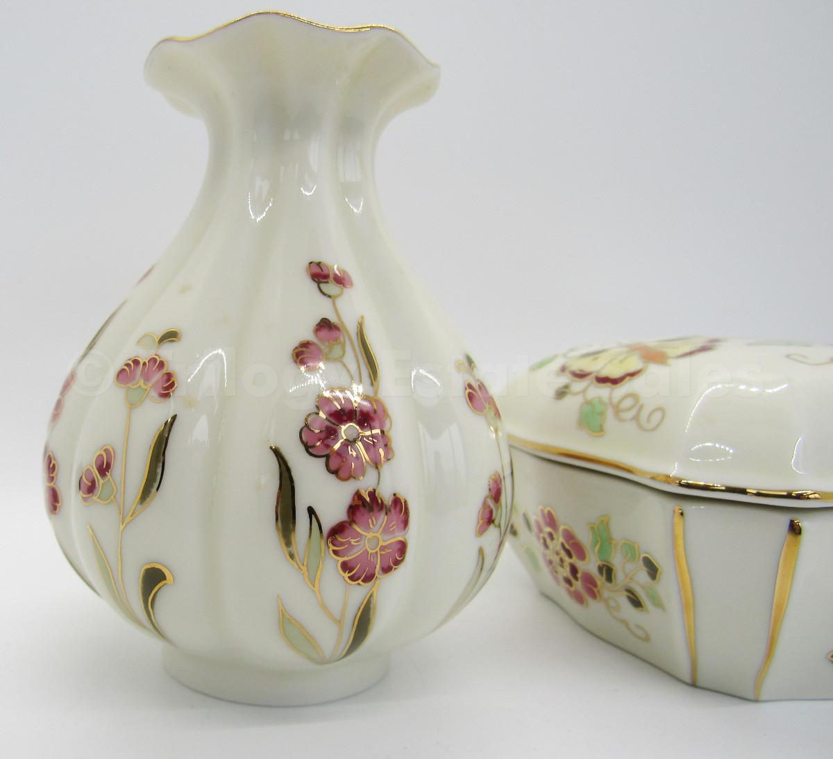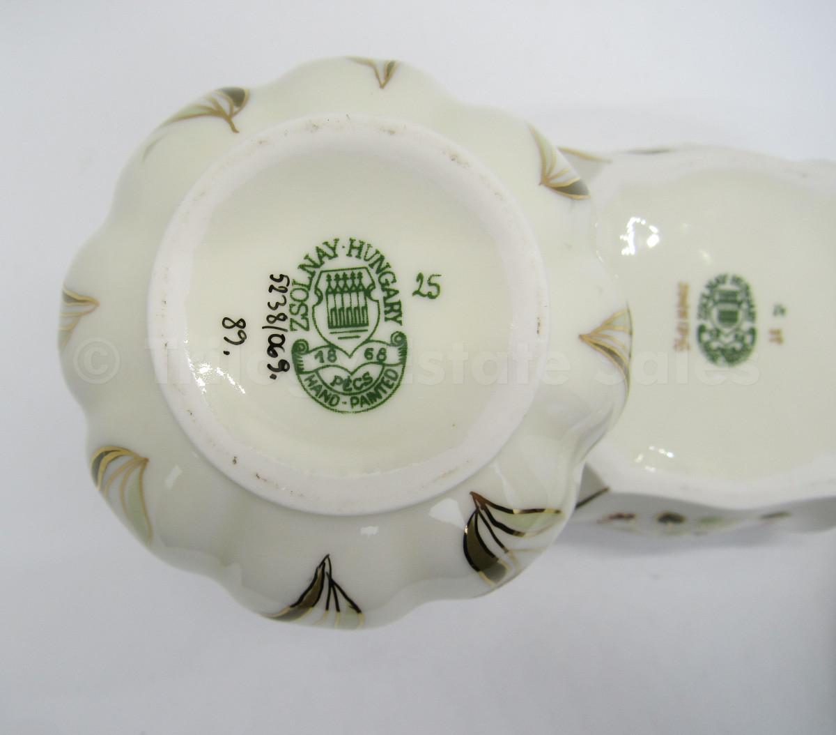 Two pieces of Zsolnay Hungary porcelain. Flowers with gold trim. covered dish and small vase.