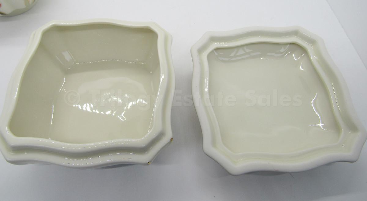 4” square x 2.5” tall; vase 4.5” x 3.75”