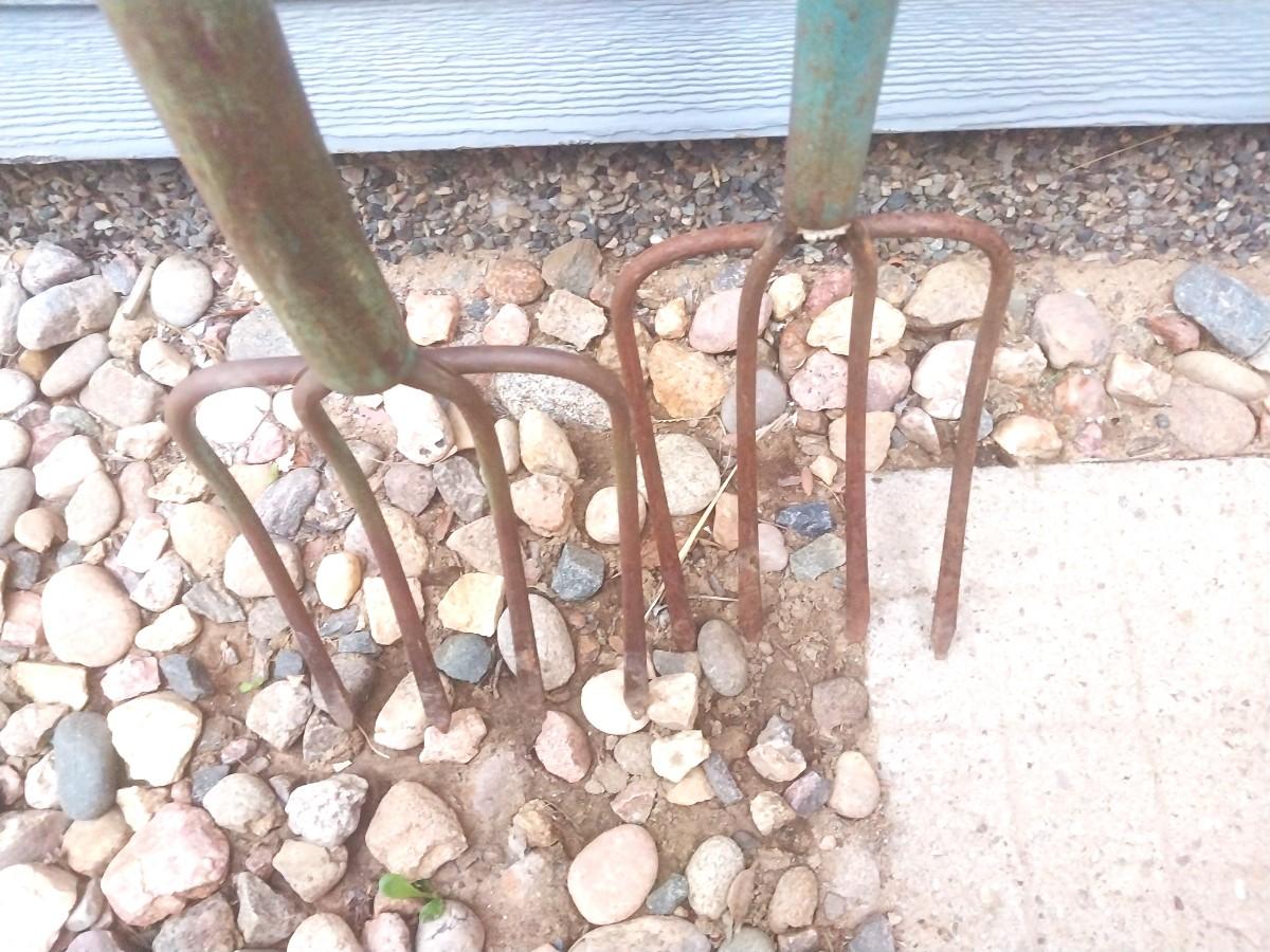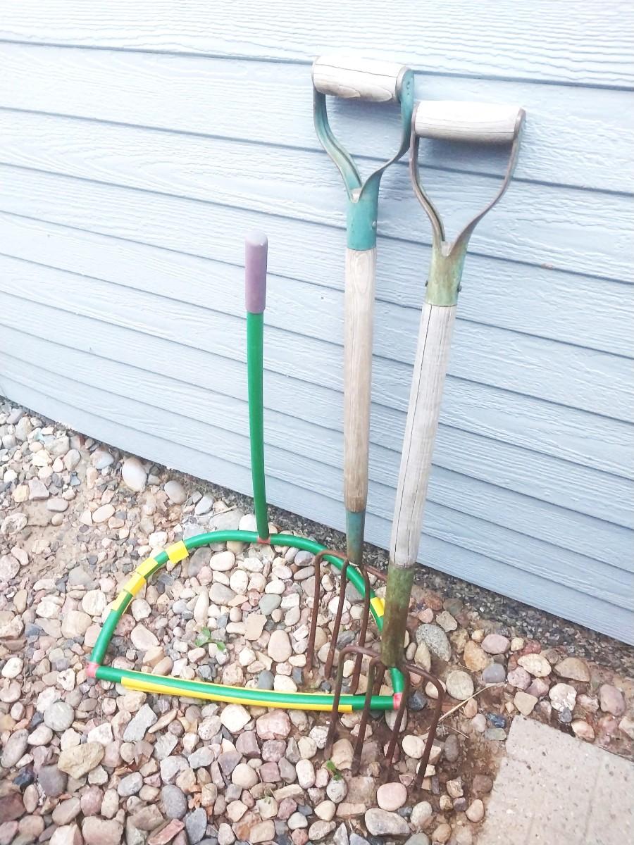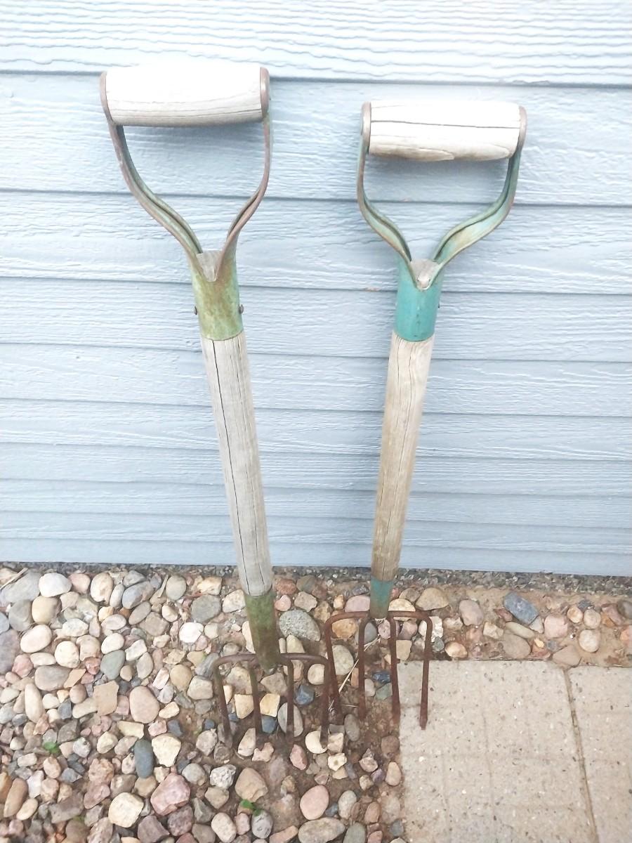 TWO PITCHFORKS AND FOLDING TRASHCAN MOVER