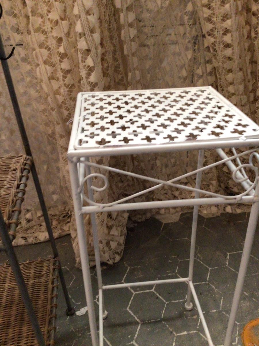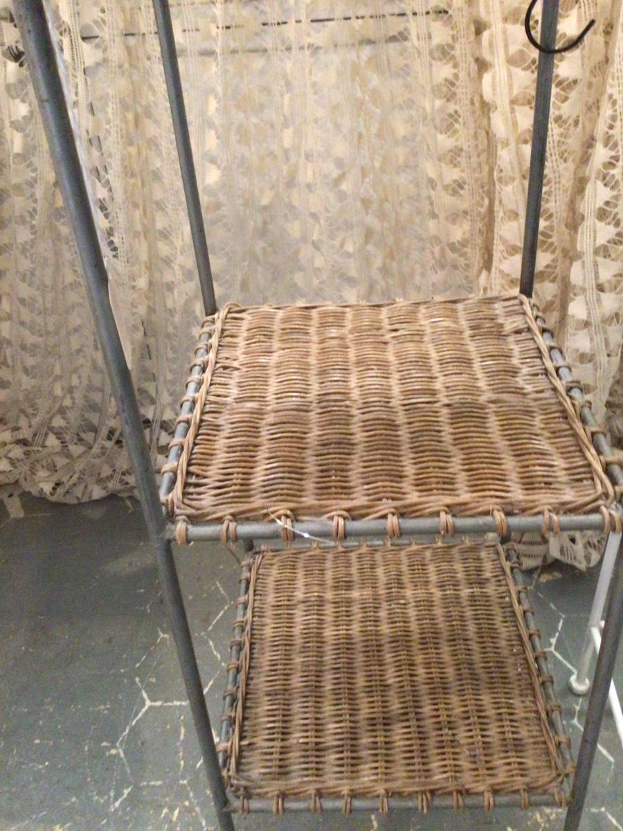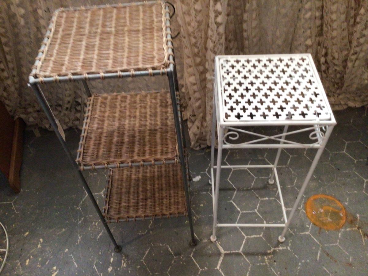 Two plant stands one has three wicker shelves with metal frame, the other is one metal shelf and stand.