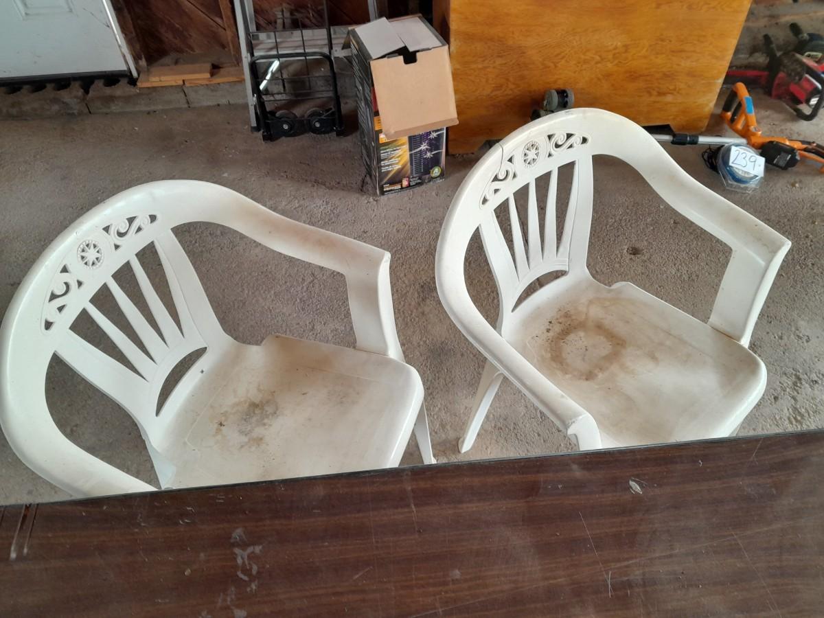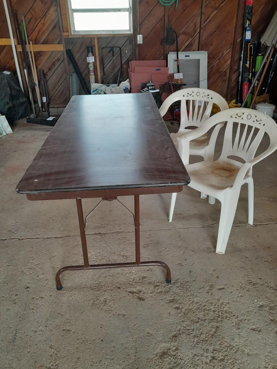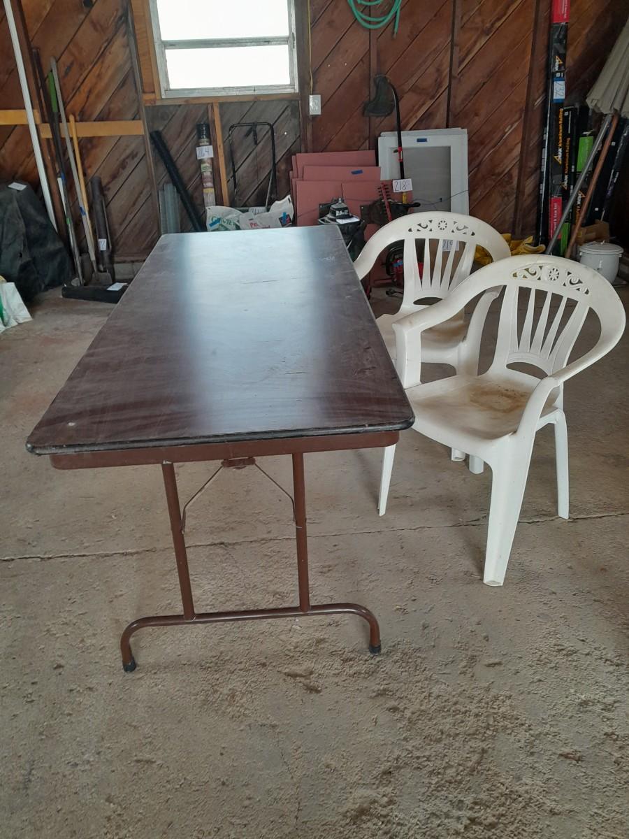 TWO PLASTIC CHAIRS AND A FOLDING TABLE (has saw cuts on top)