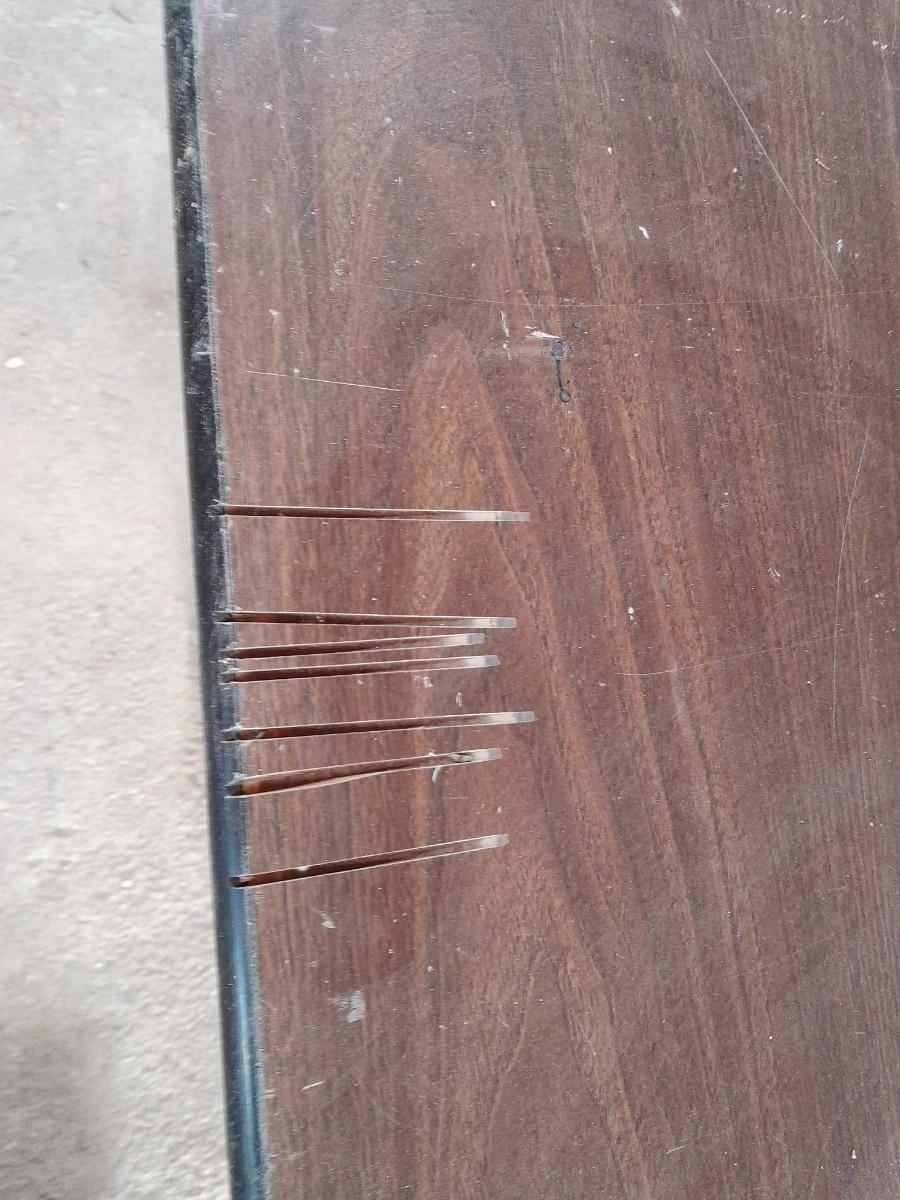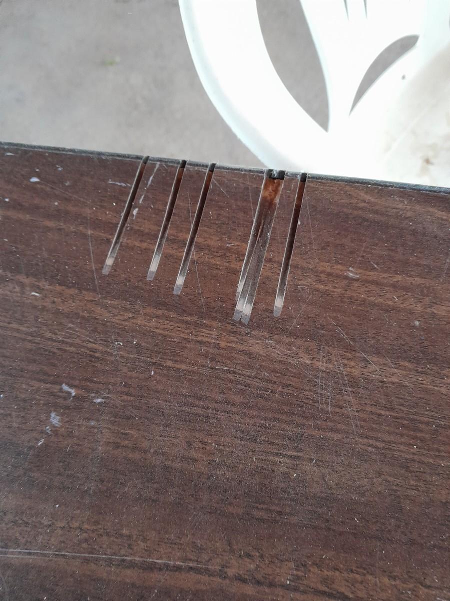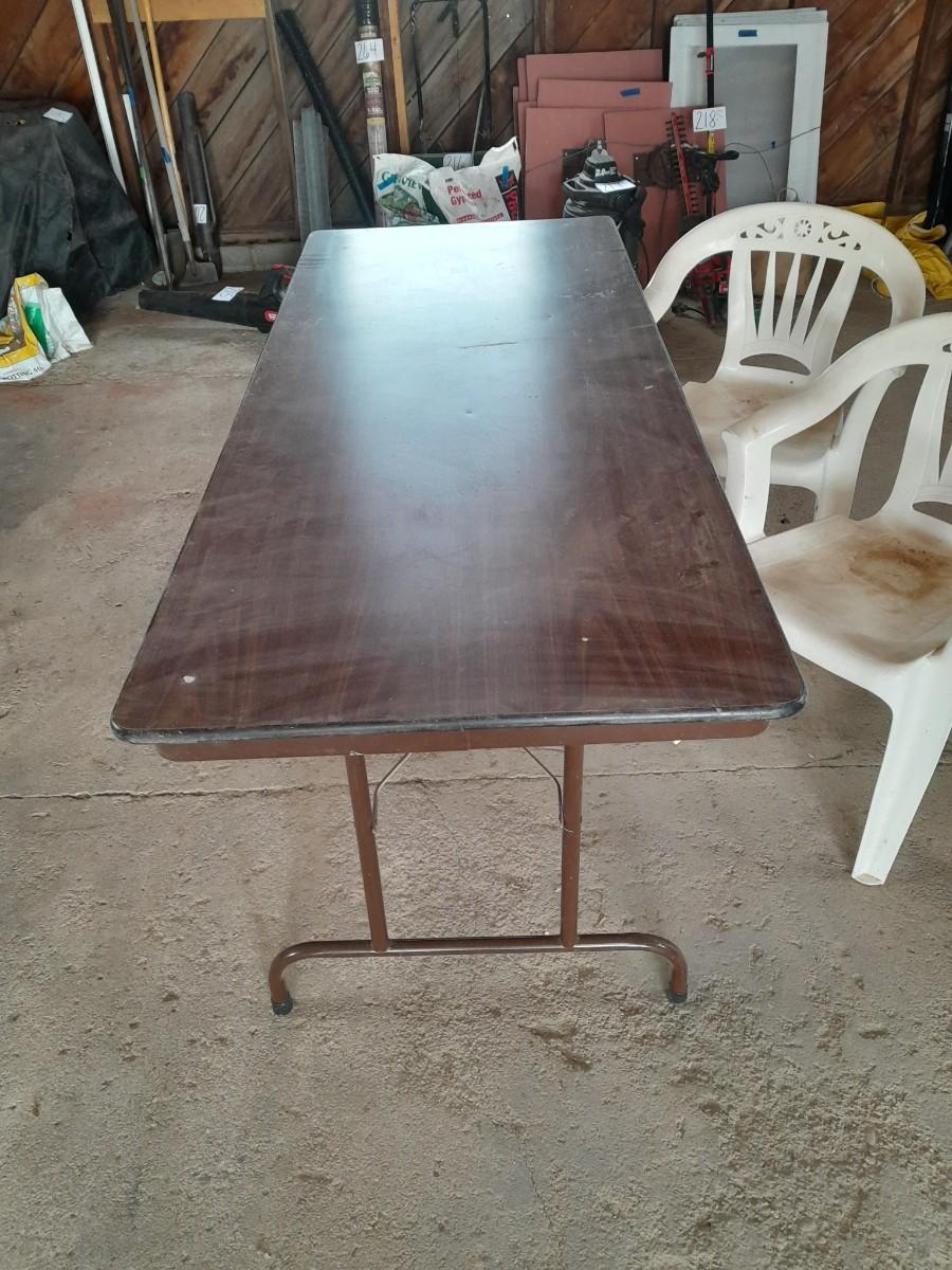 TWO PLASTIC CHAIRS AND A FOLDING TABLE (has saw cuts on top)