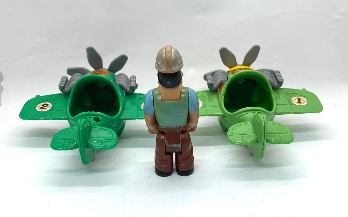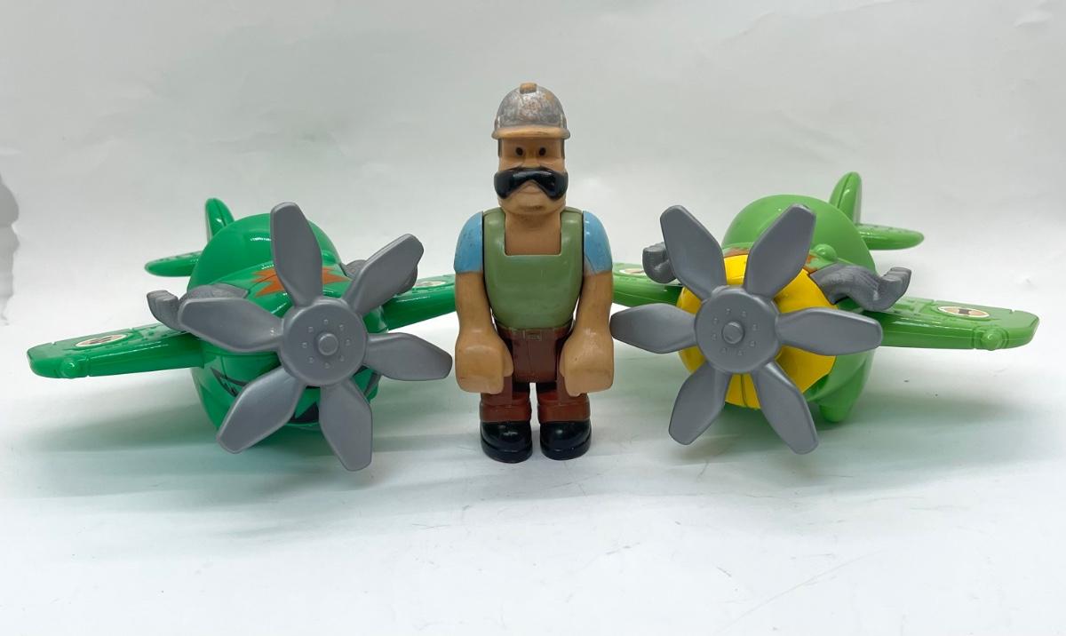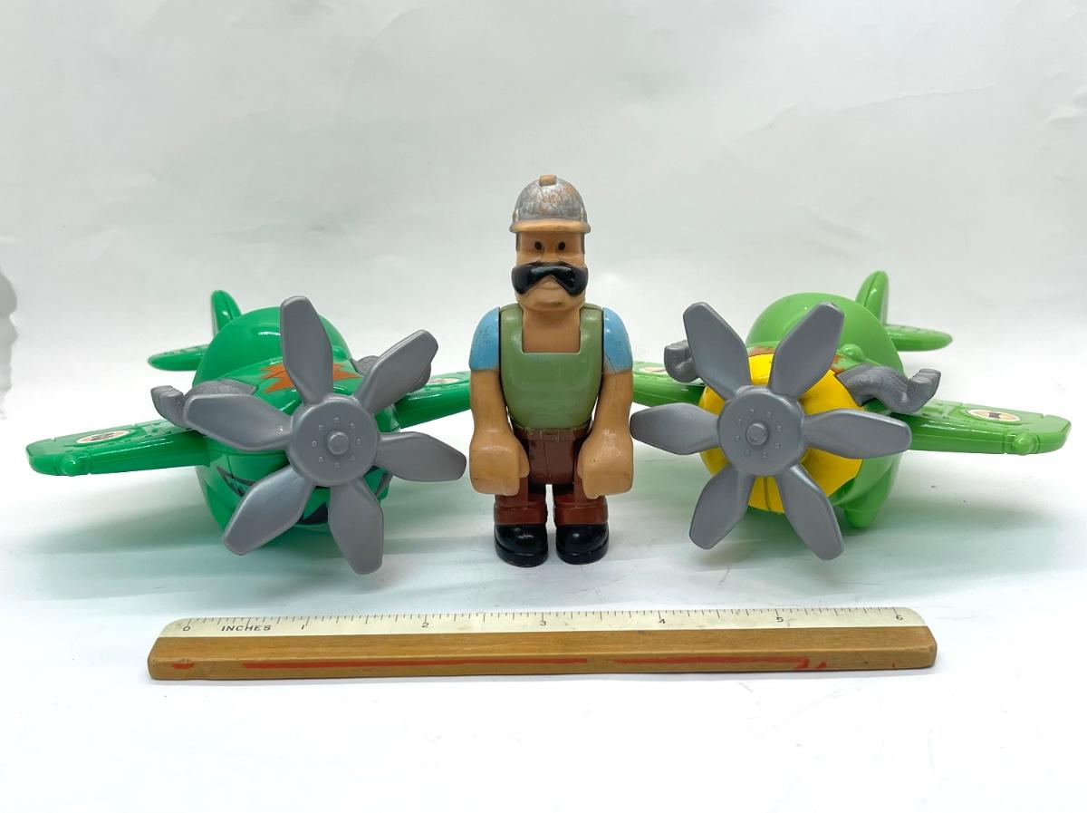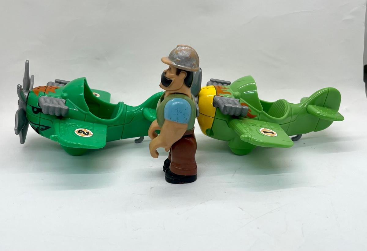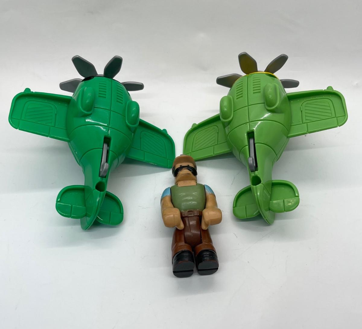 Two Plastic Toy airplanes with prop and 1 Imaginext construction worker