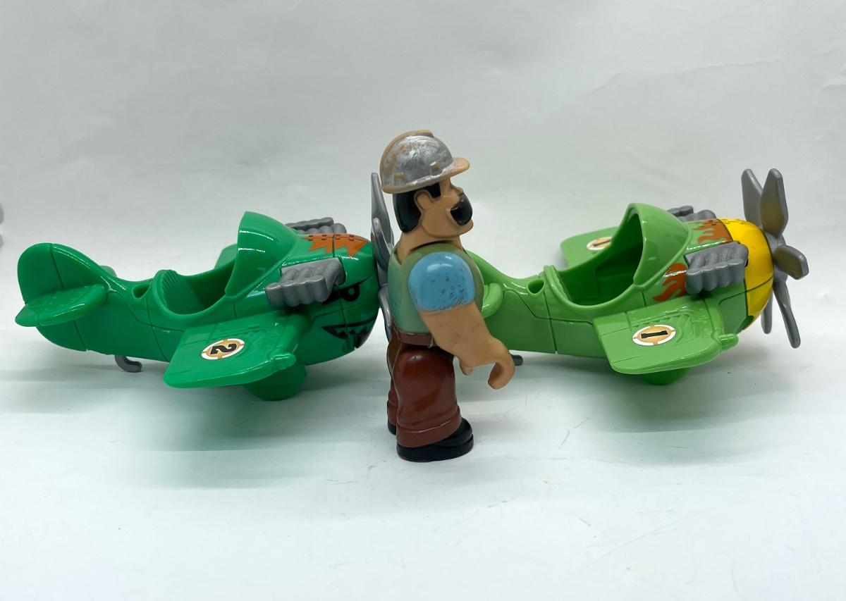 Two Plastic Toy airplanes with prop and 1 Imaginext construction worker