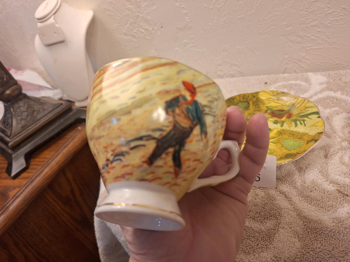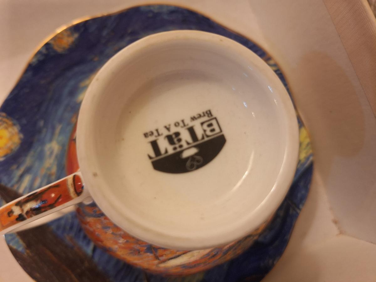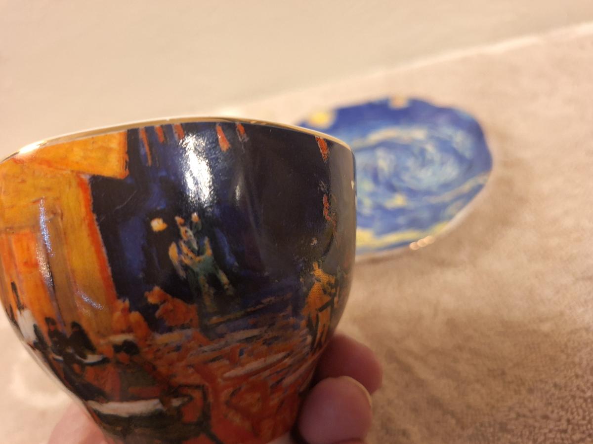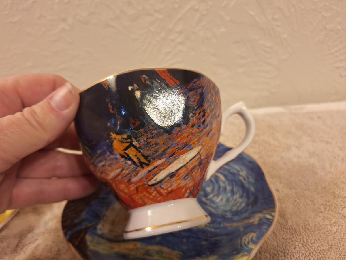 two porcelain teacups and saucers featuring prints of Vincent van Gogh paintings. The Sower and The Starry Night