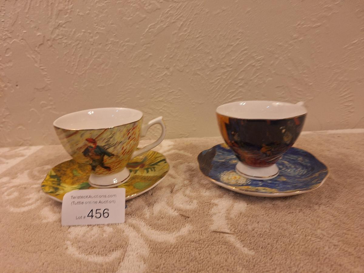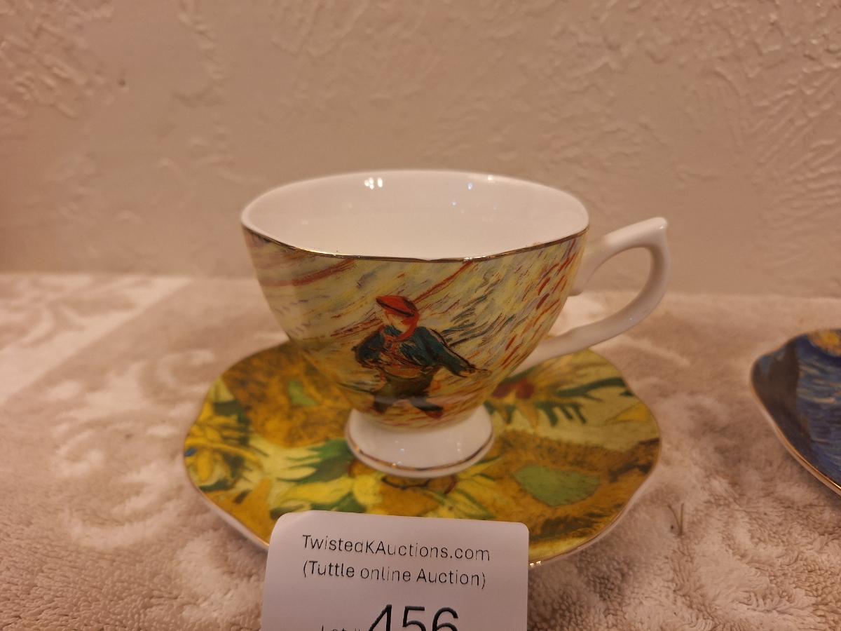 two porcelain teacups and saucers featuring prints of Vincent van Gogh paintings.   The Sower and The Starry Night