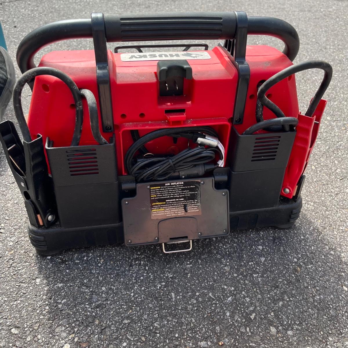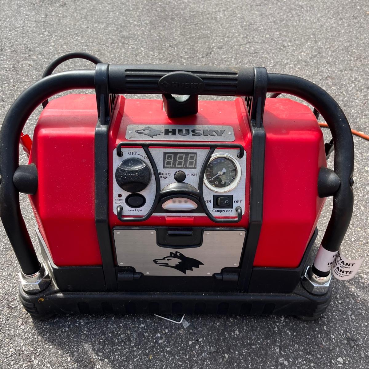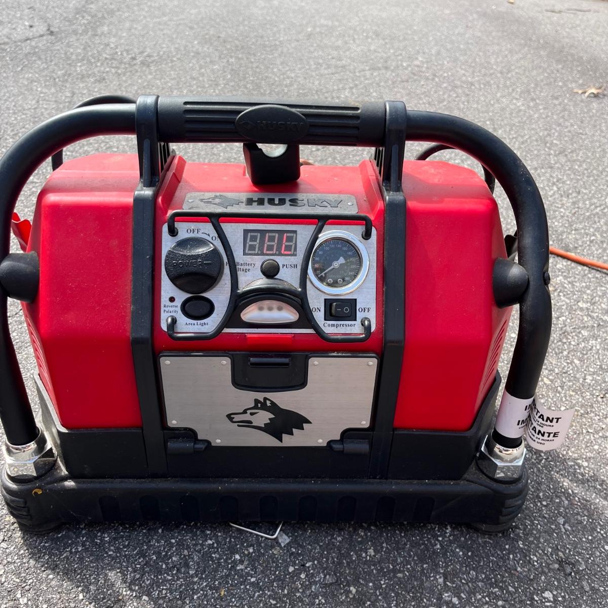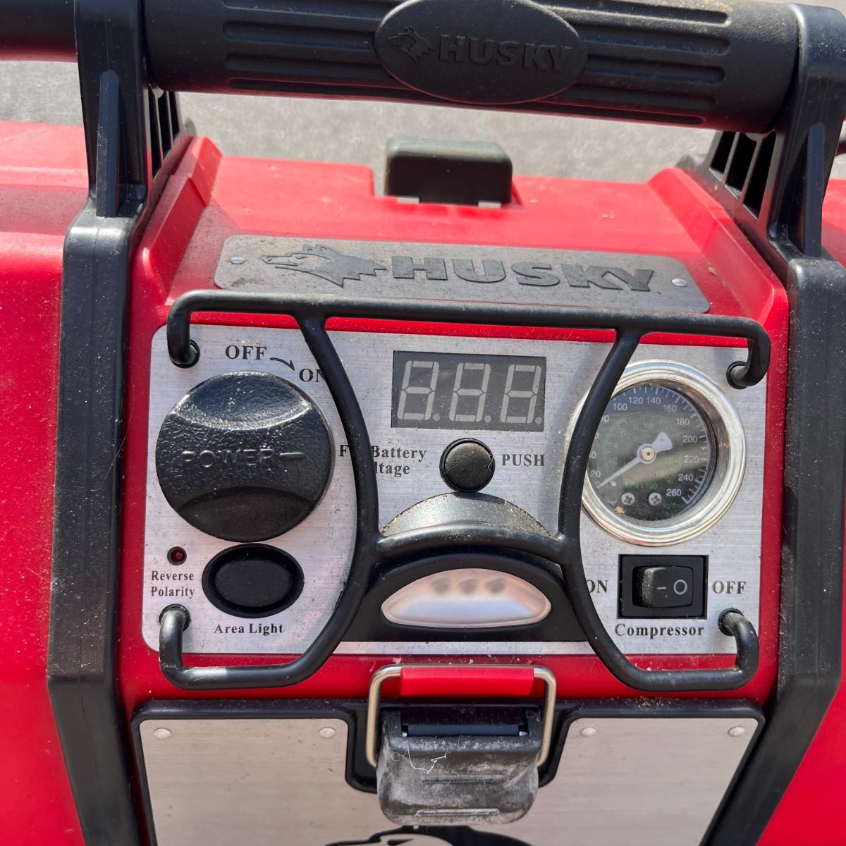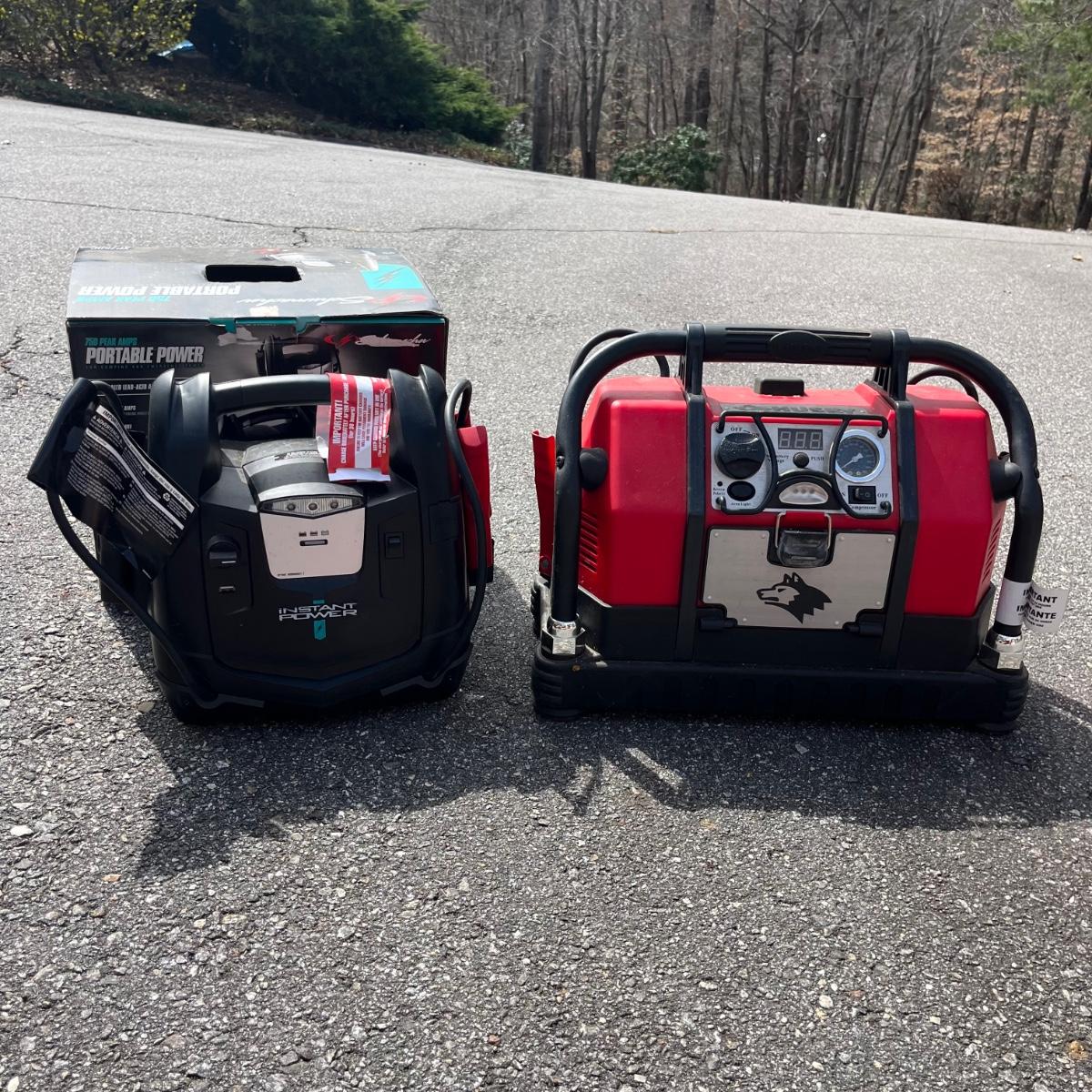 Lot includes a Schumacher portable power system and a Husky portable power system. Both systems powered on when plugged in.