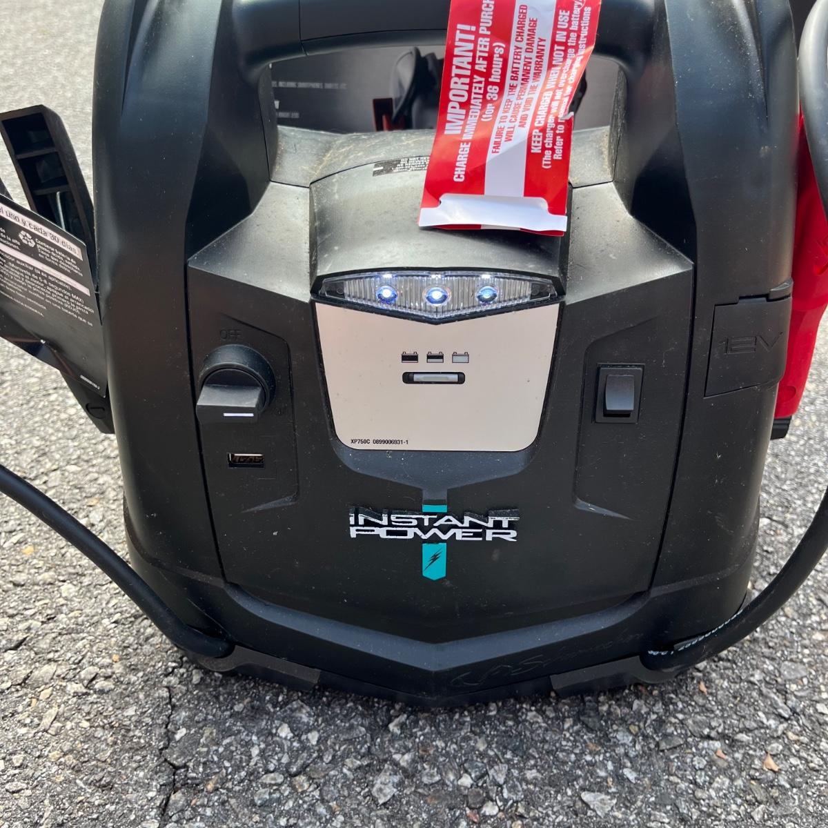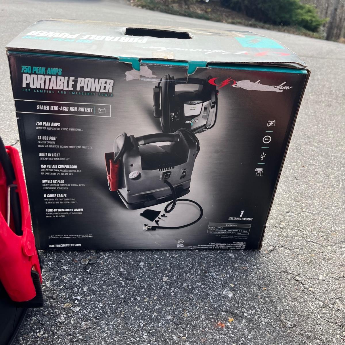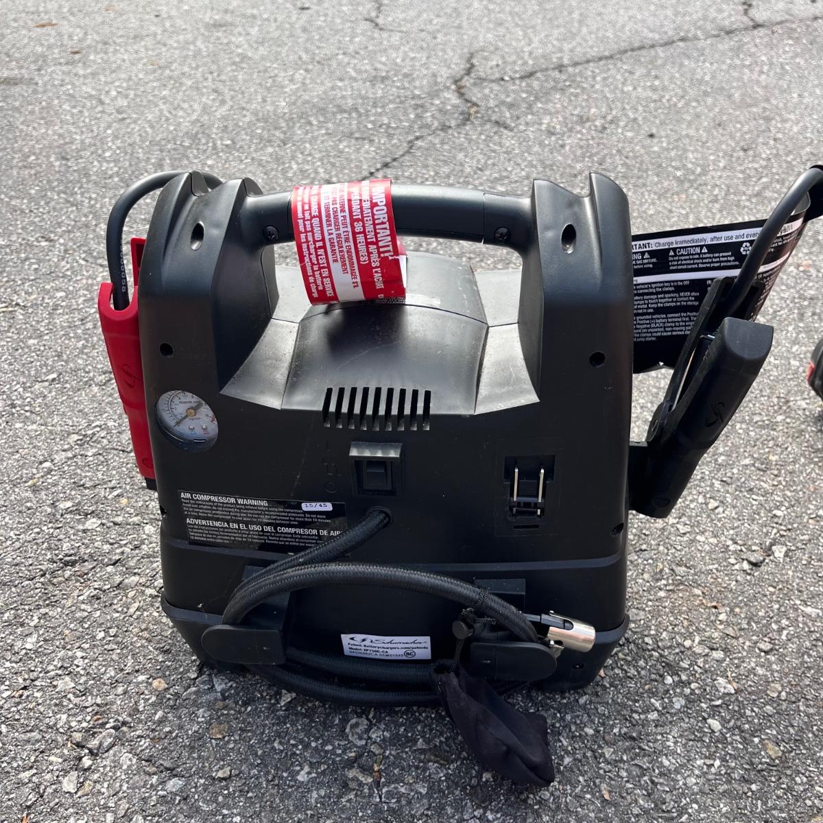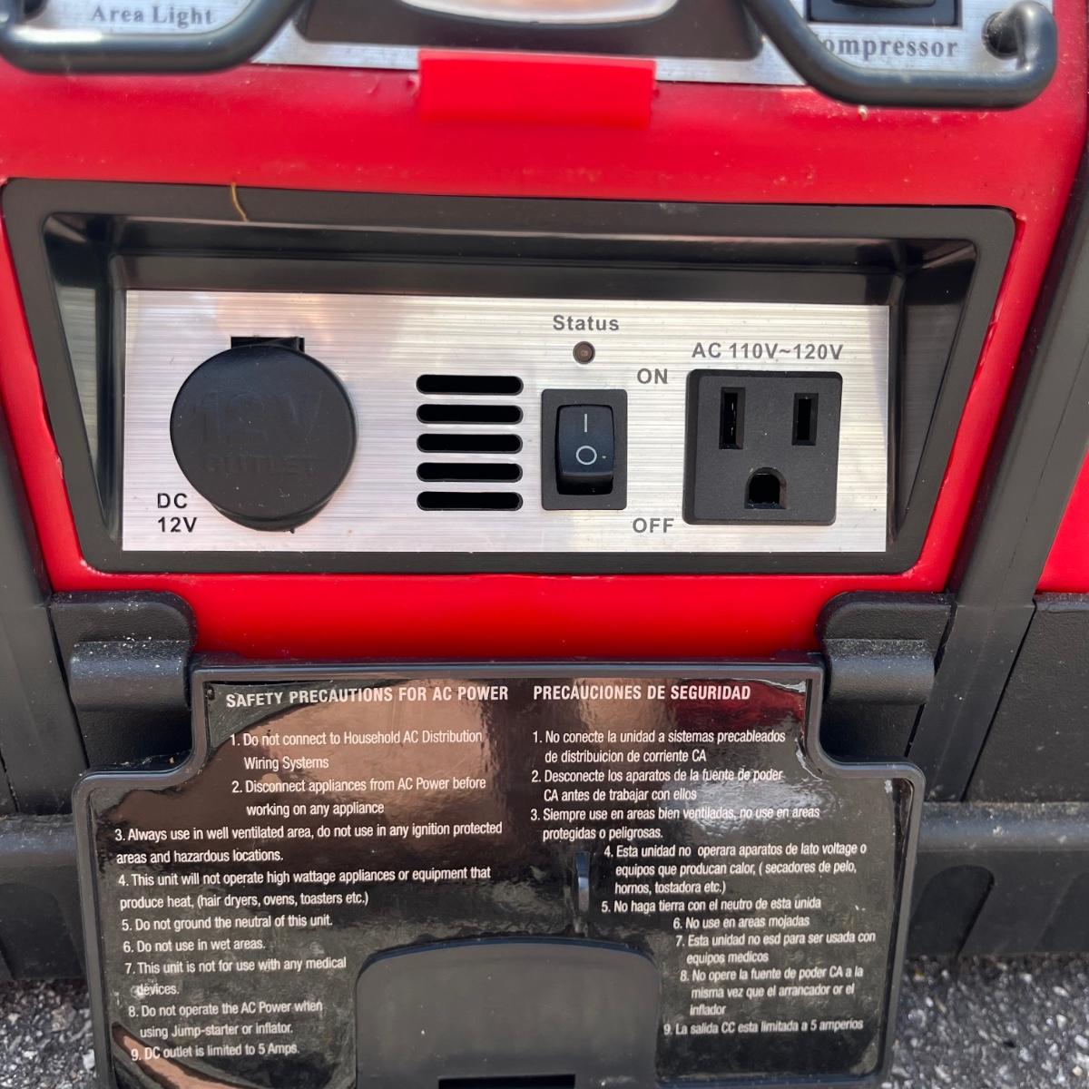 Lot includes a Schumacher portable power system and a Husky portable power system. Both systems powered on when plugged in.