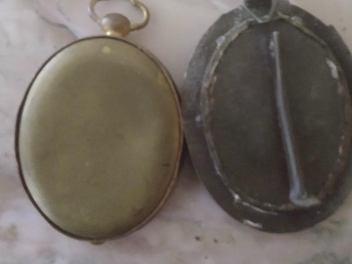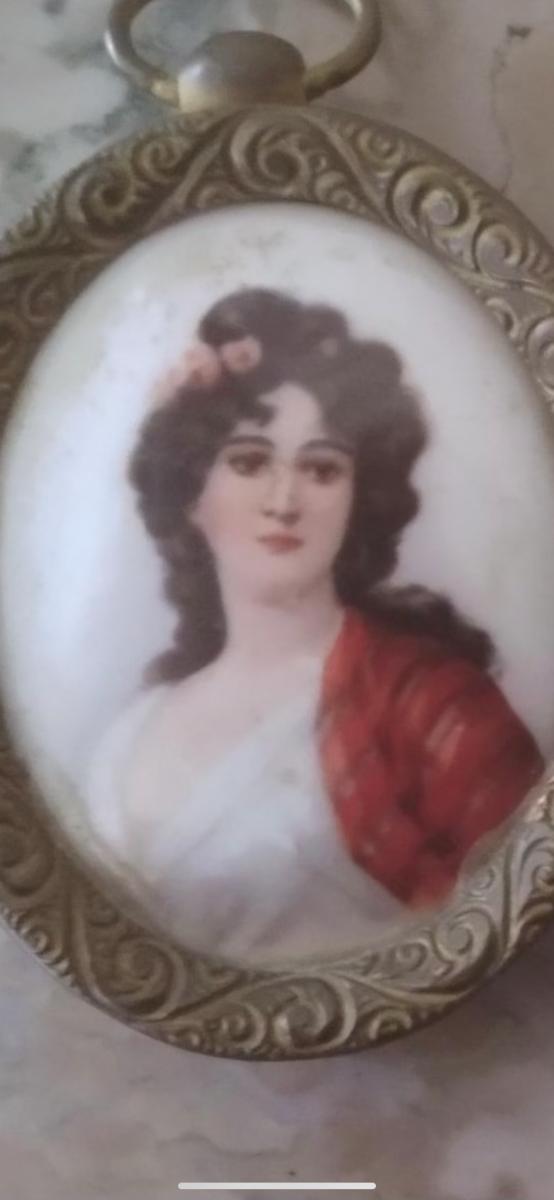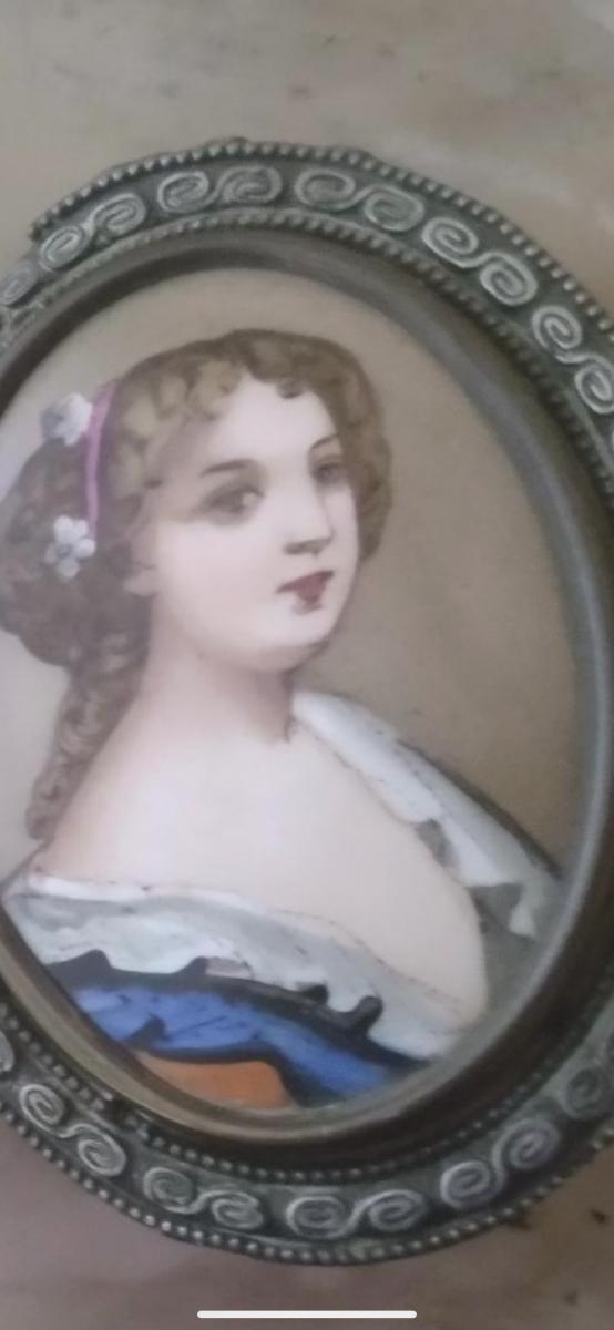 Mid 19th century. Hand painted on porcelain discs, each in stamped brass frames, one frame slightly damaged, images of young women with flowers in their hair. They are approximately 1.5”x 3” each.