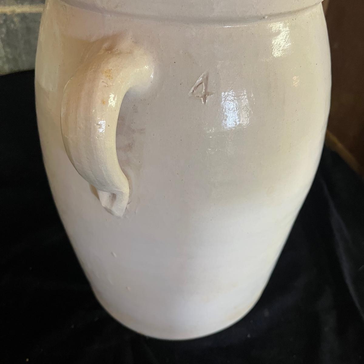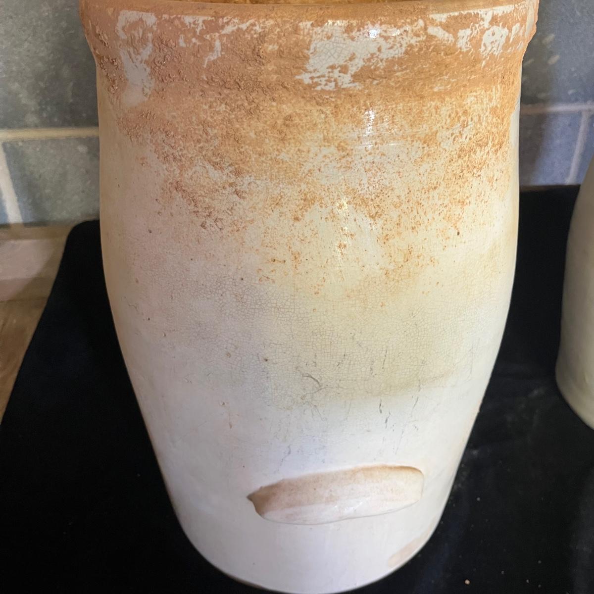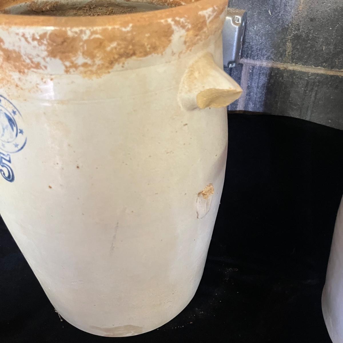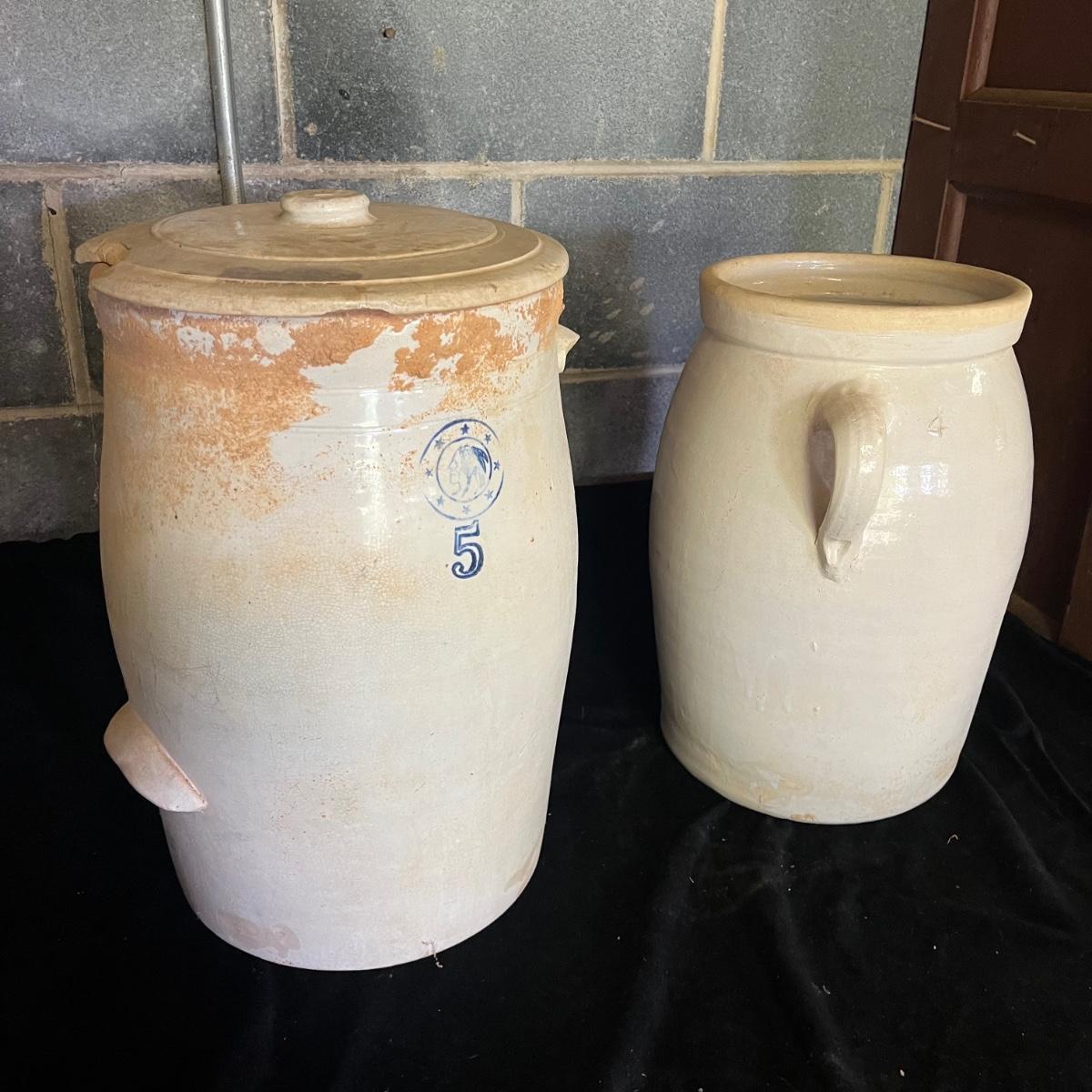 Lot includes a crock with the number four on the side and no other markings. Also includes a crock with number five on front and number three on lid, both lid and crock have damage and clay stuck to it, see pictures. Largest crock measures 11”D x 18”H.