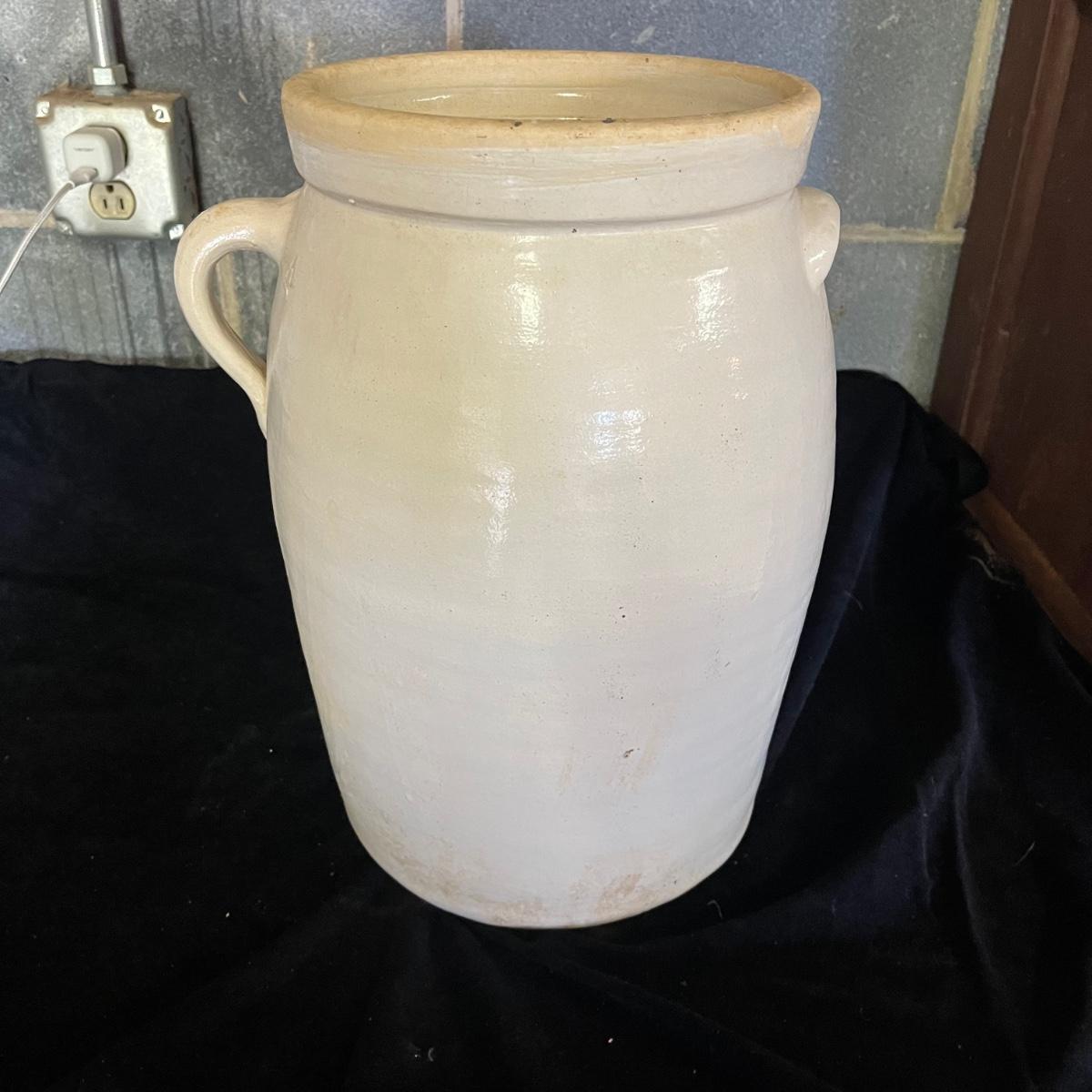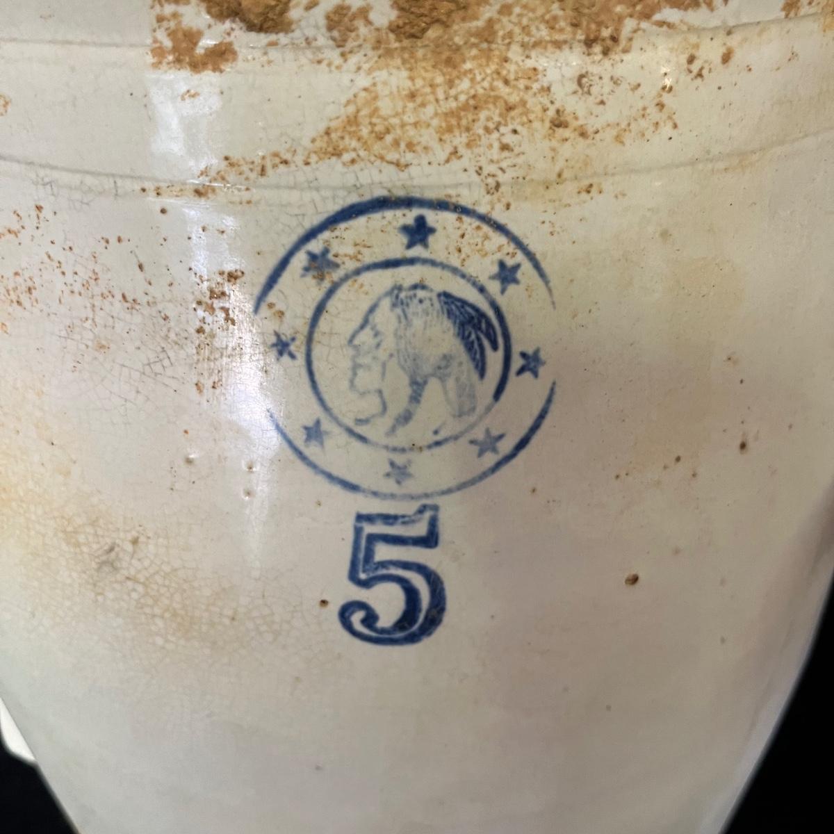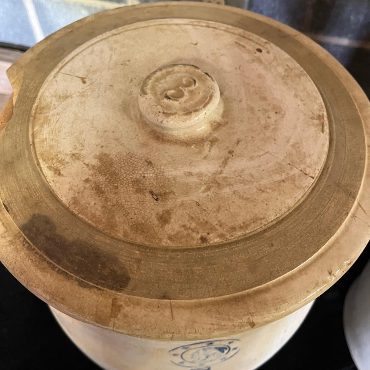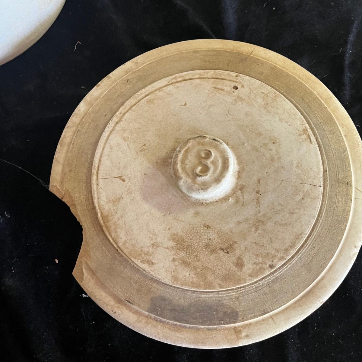 Lot includes a crock with the number four on the side and no other markings. Also includes a crock with number five on front and number three on lid, both lid and crock have damage and clay stuck to it, see pictures. Largest crock measures 11”D x 18”H.