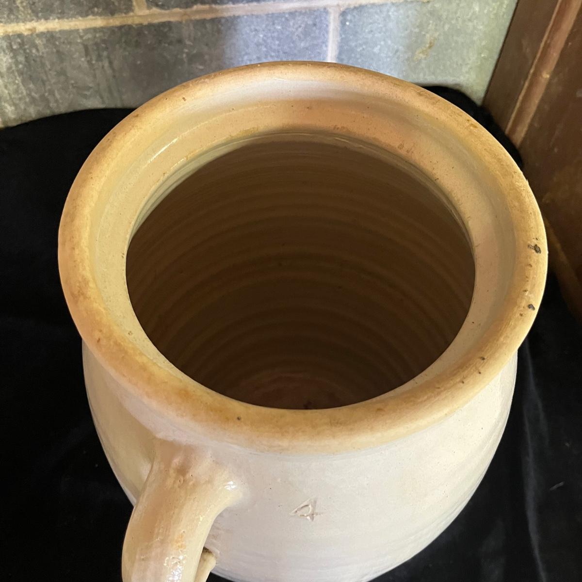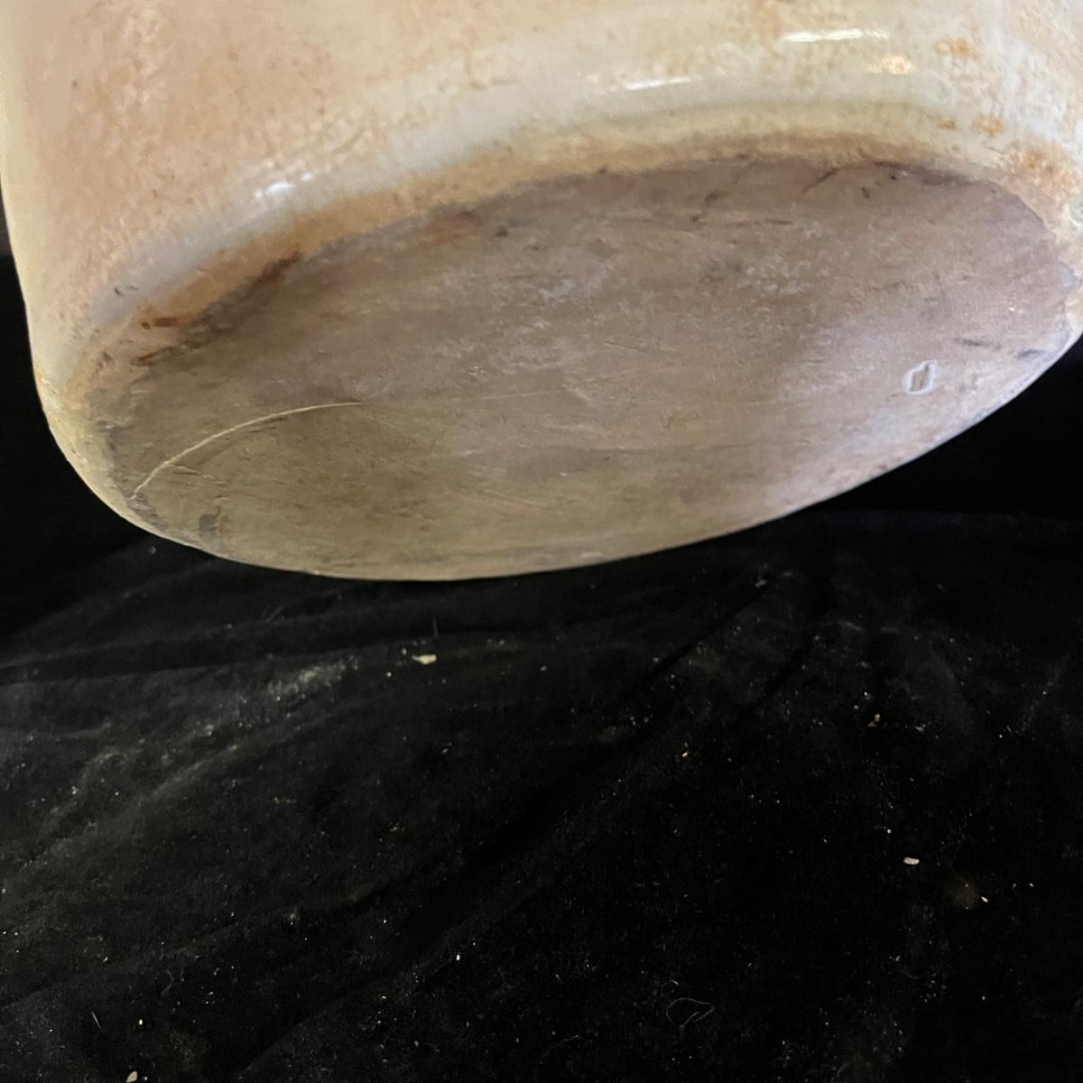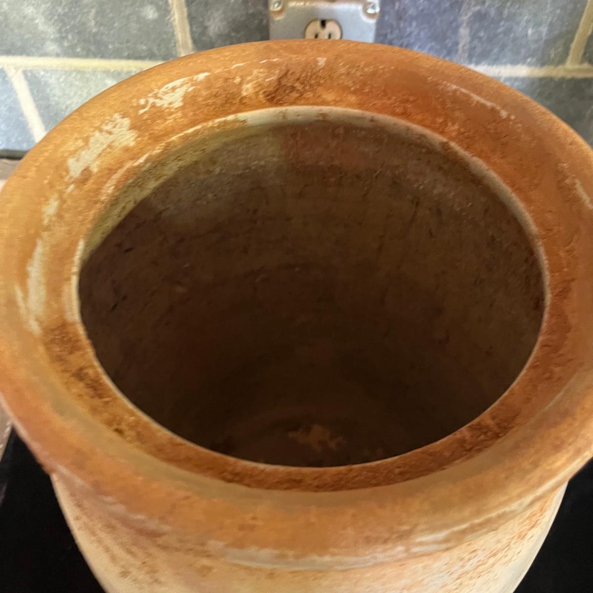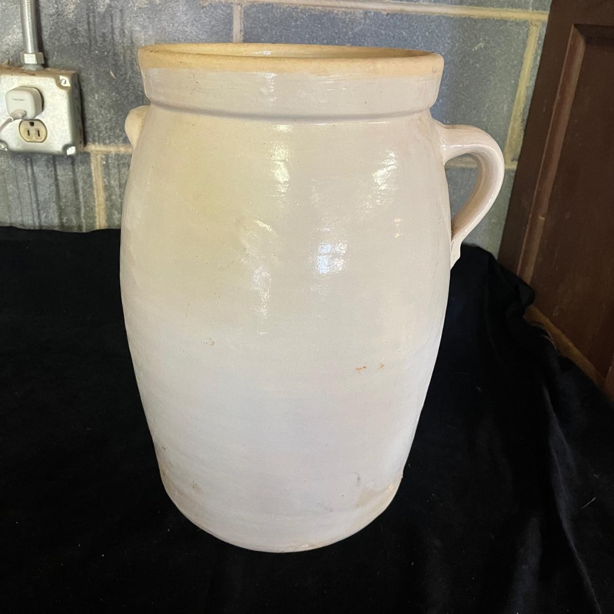 Lot includes a crock with the number four on the side and no other markings. Also includes a crock with number five on front and number three on lid, both lid and crock have damage and clay stuck to it, see pictures. Largest crock measures 11”D x 18”H.