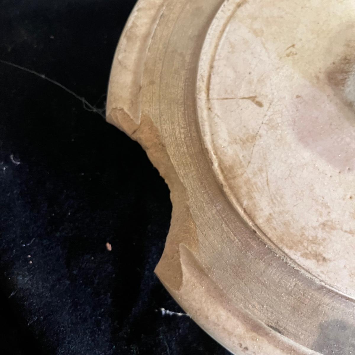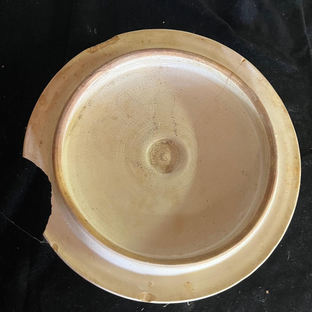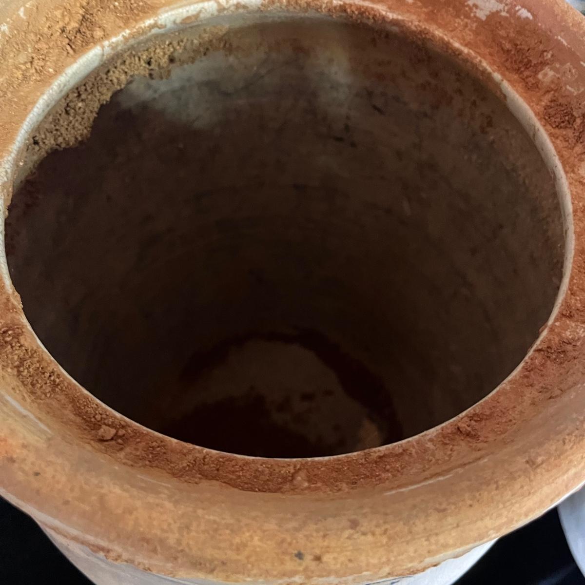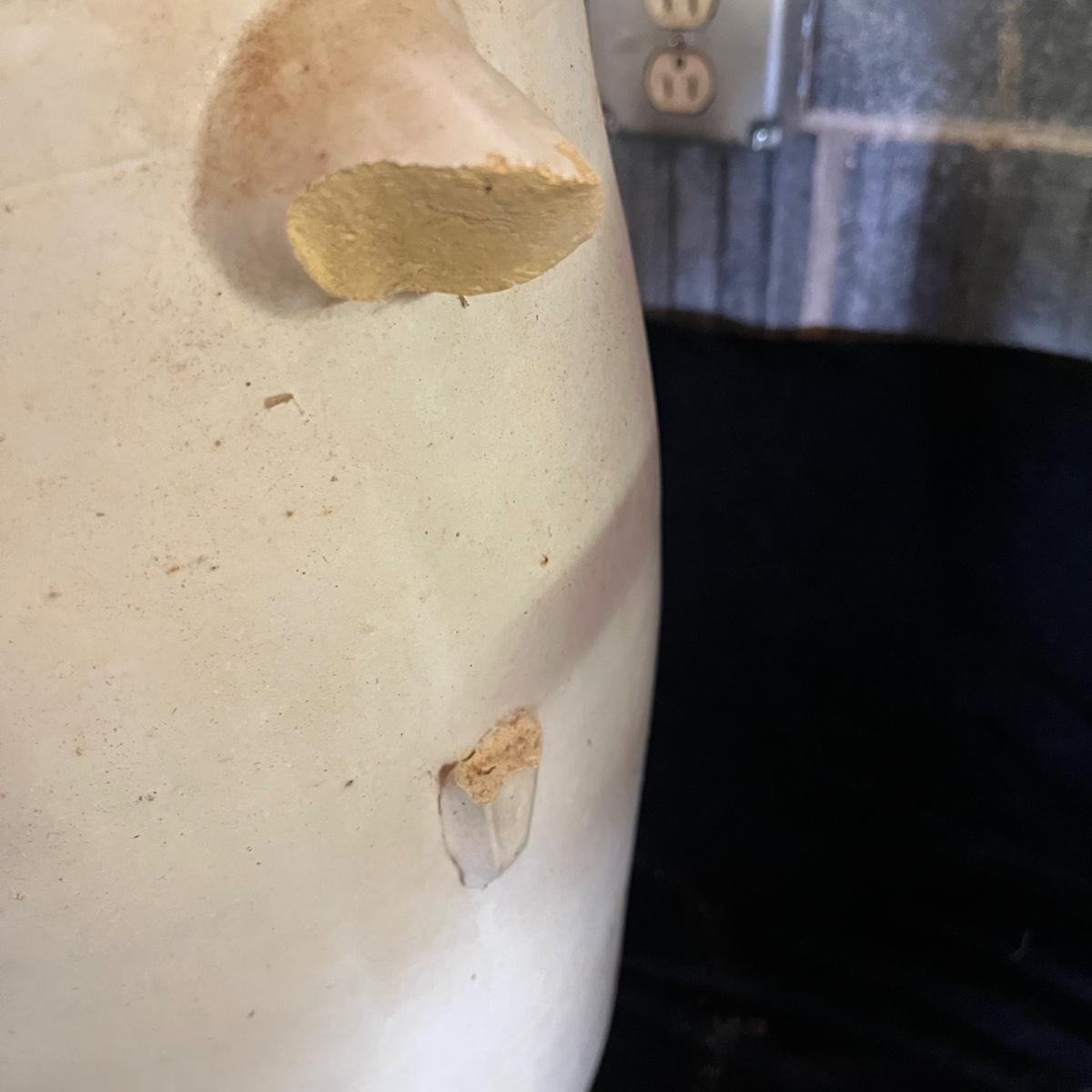 Lot includes a crock with the number four on the side and no other markings. Also includes a crock with number five on front and number three on lid, both lid and crock have damage and clay stuck to it, see pictures. Largest crock measures 11”D x 18”H.