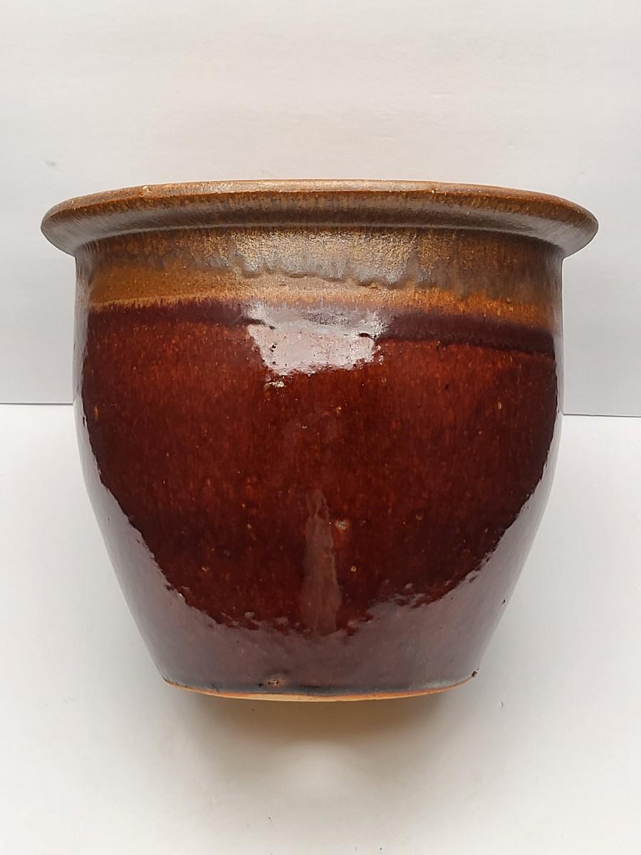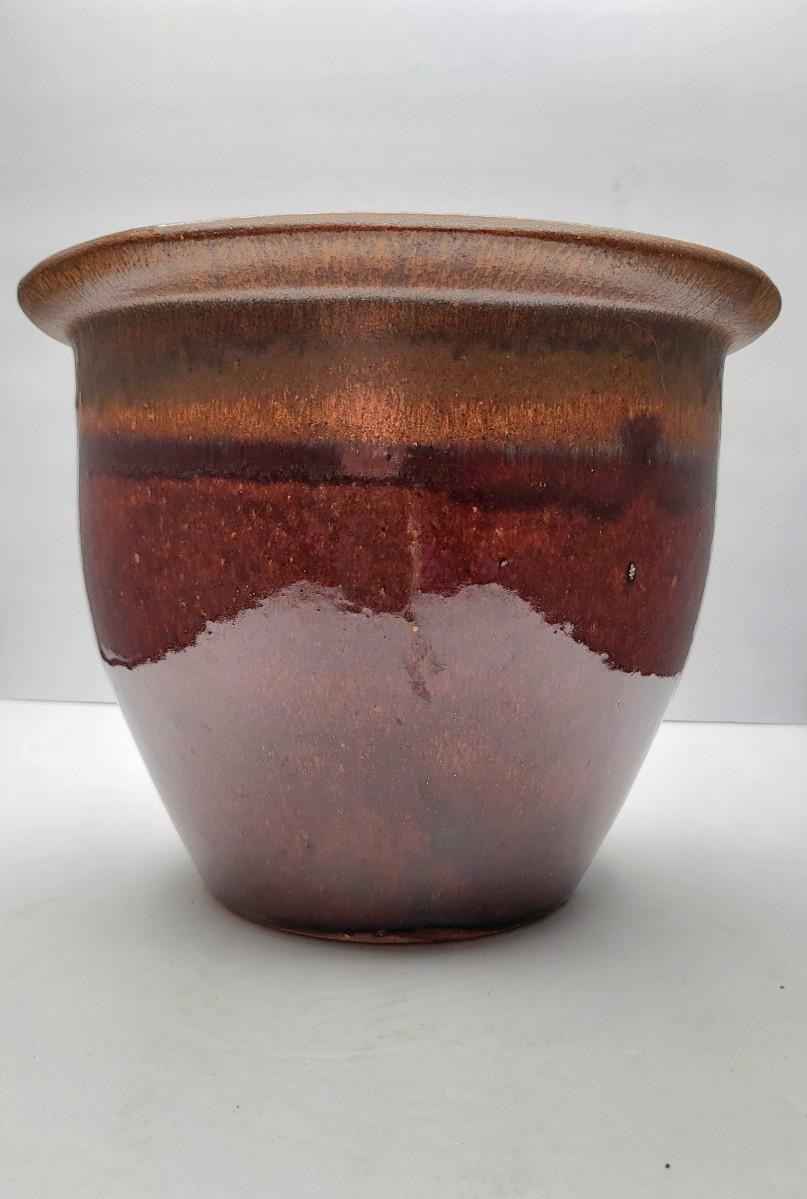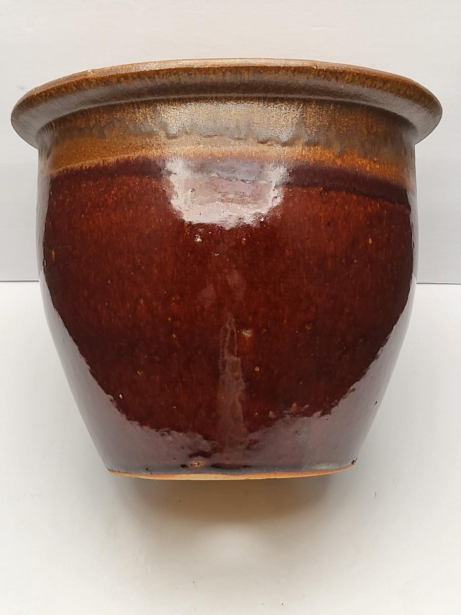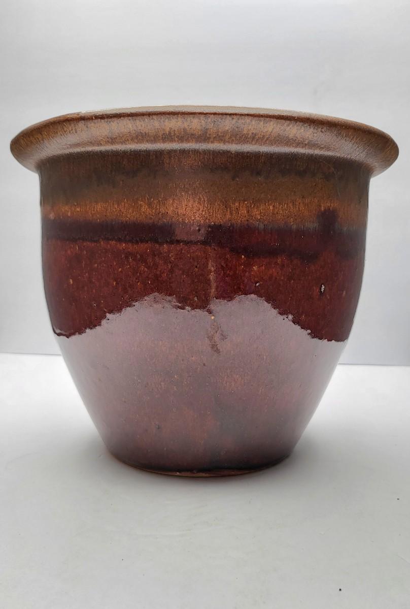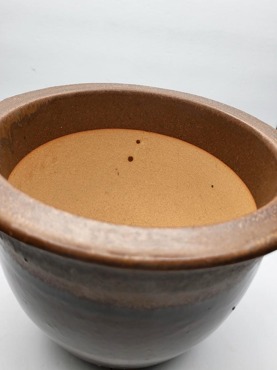 Brown glazed pot with drain hole, 9" wide x 7.5" tall.