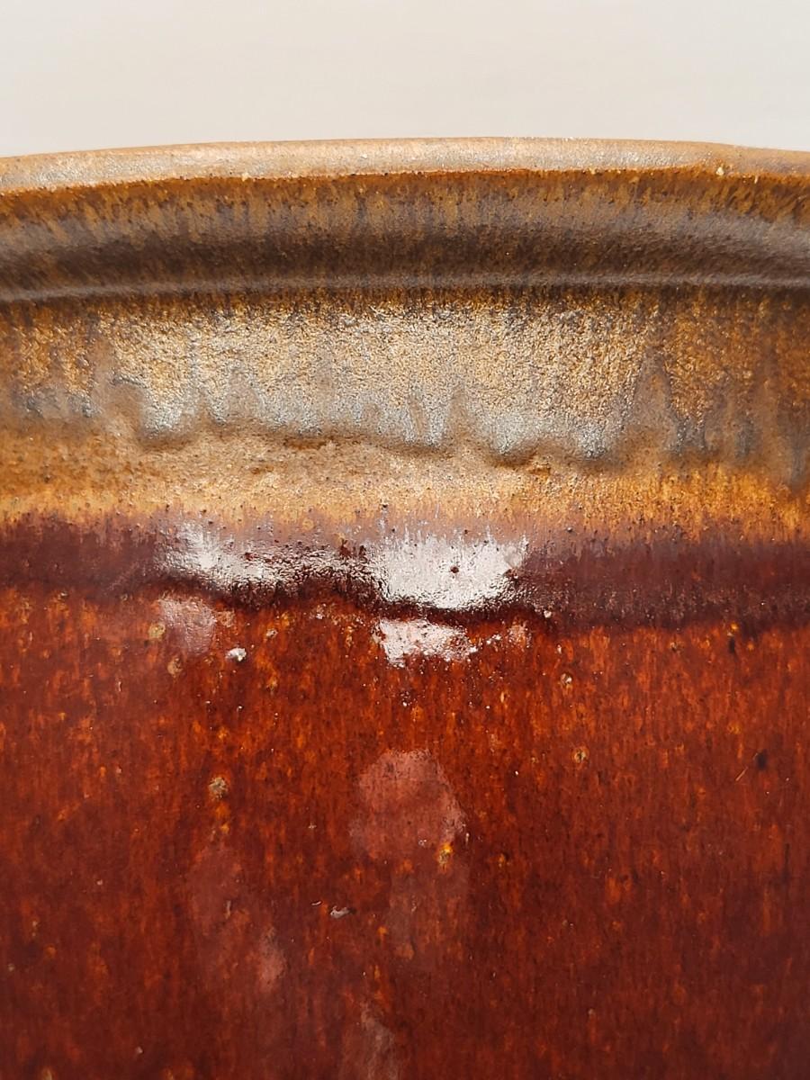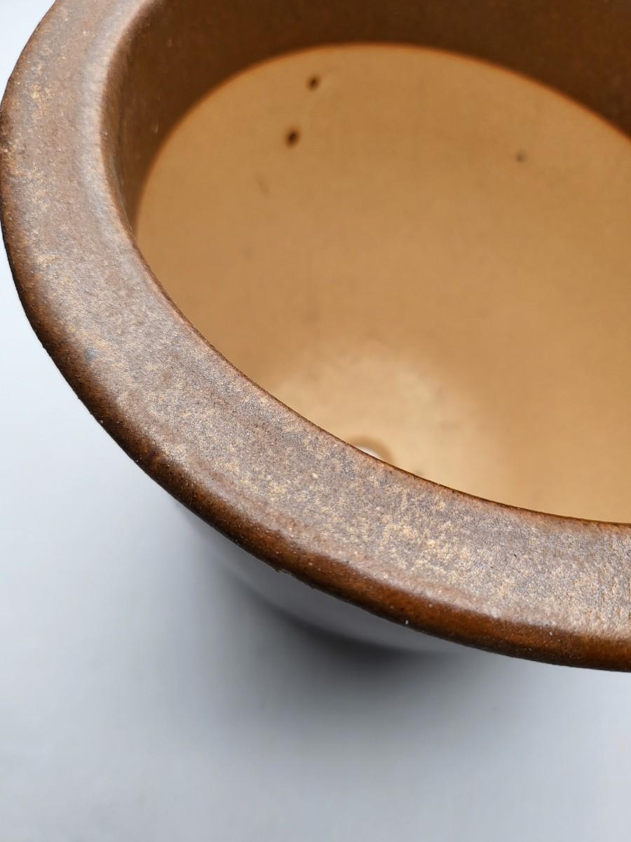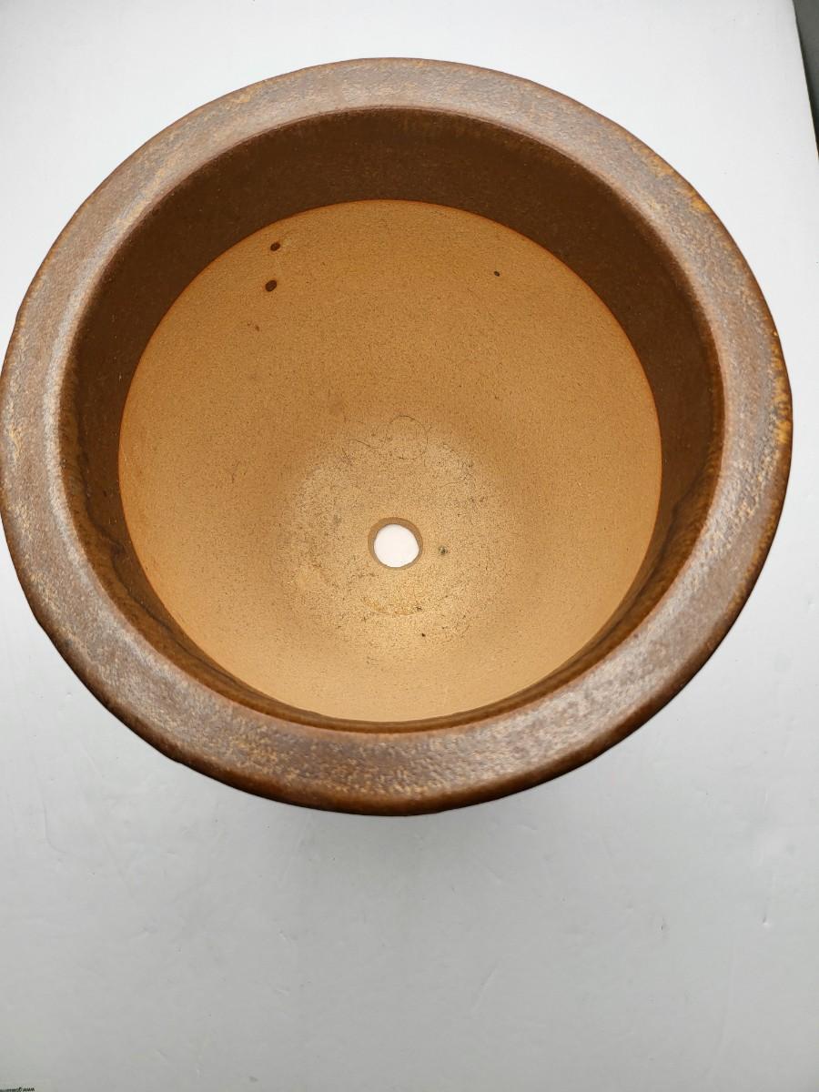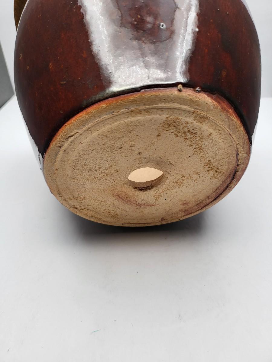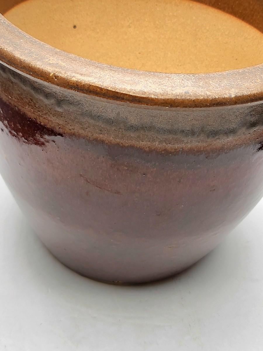 Brown glazed pot with drain hole, 9" wide x 7.5" tall.