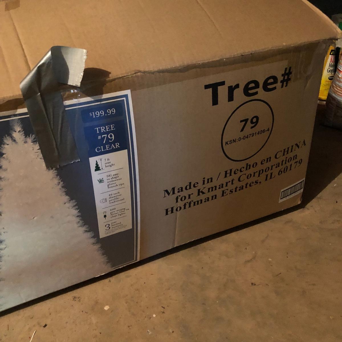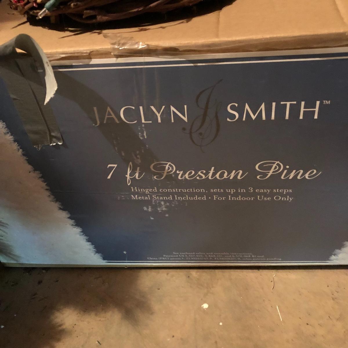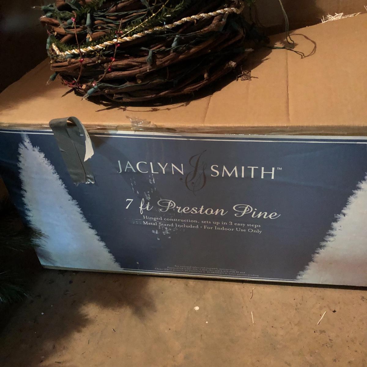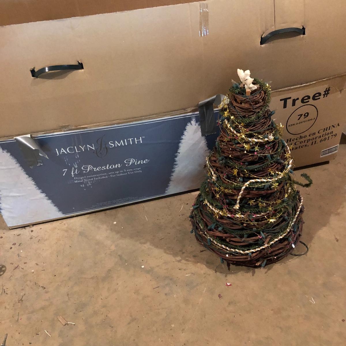 The wooden pre-lit tree is about 22” tall. It lights up when plugged in and is made of wood and twigs. The Jaclyn Smith tree is "clear" color, 7’ tall and pre-lit however was not tested nor assembled. Local pick up only.