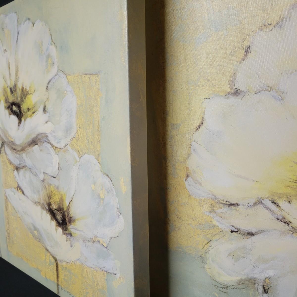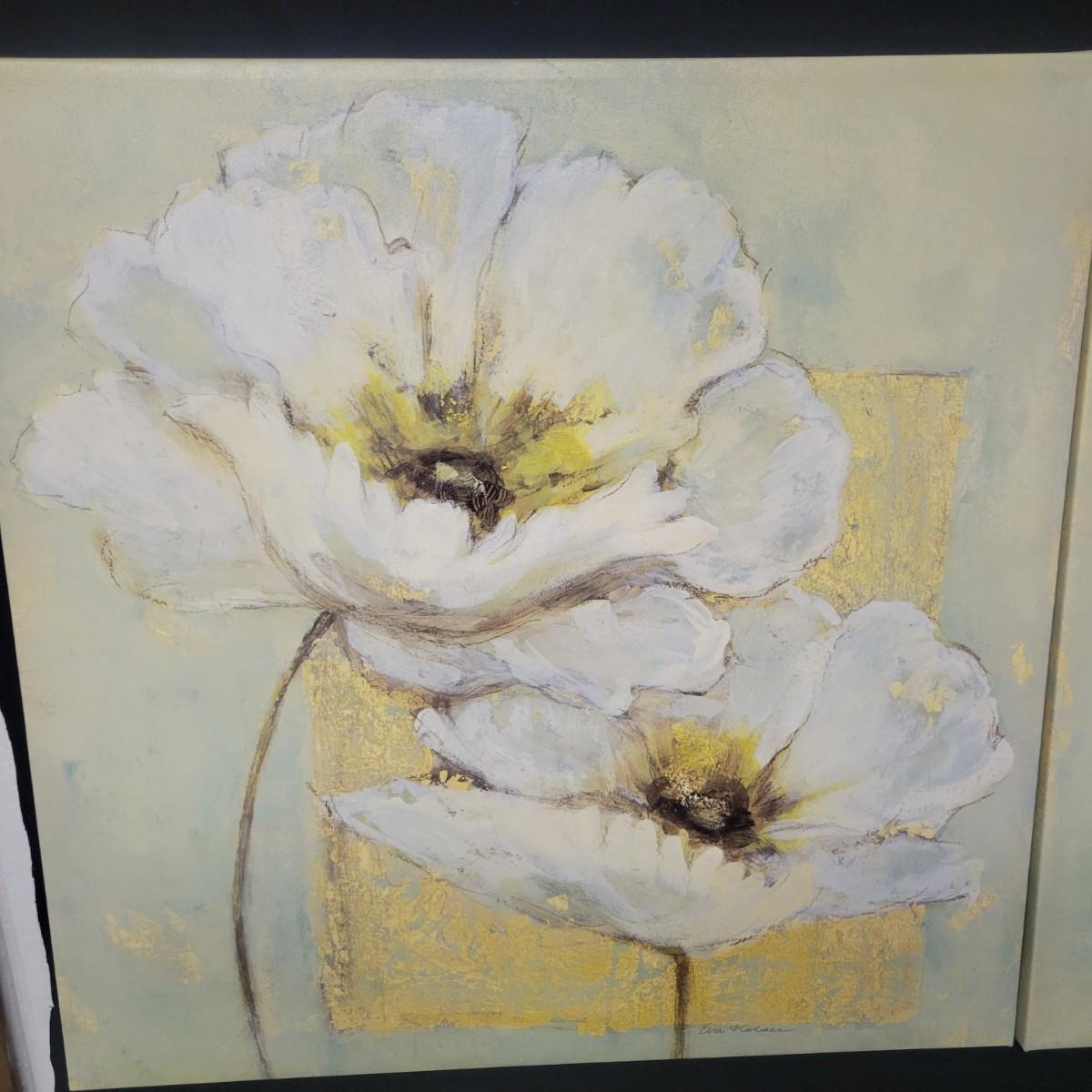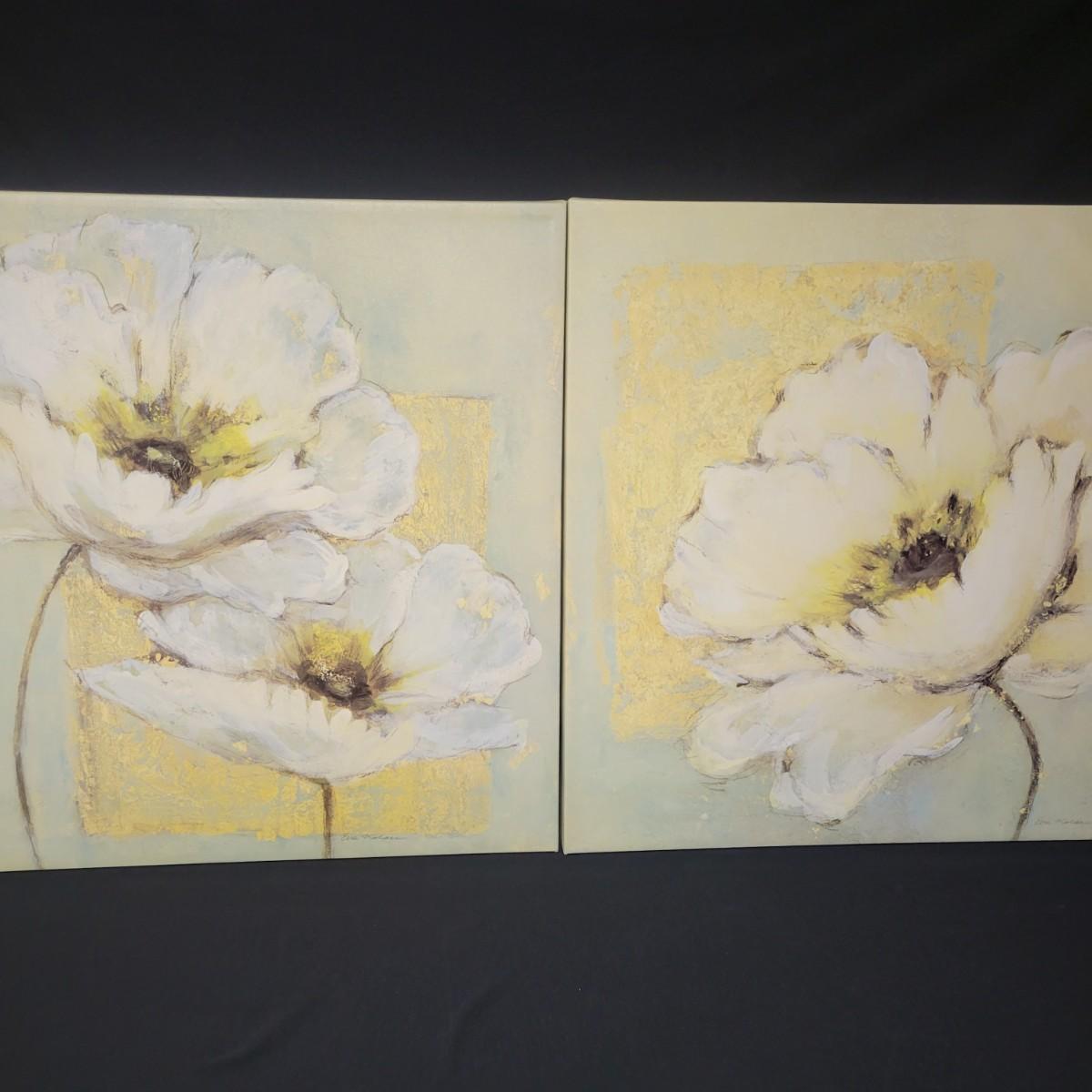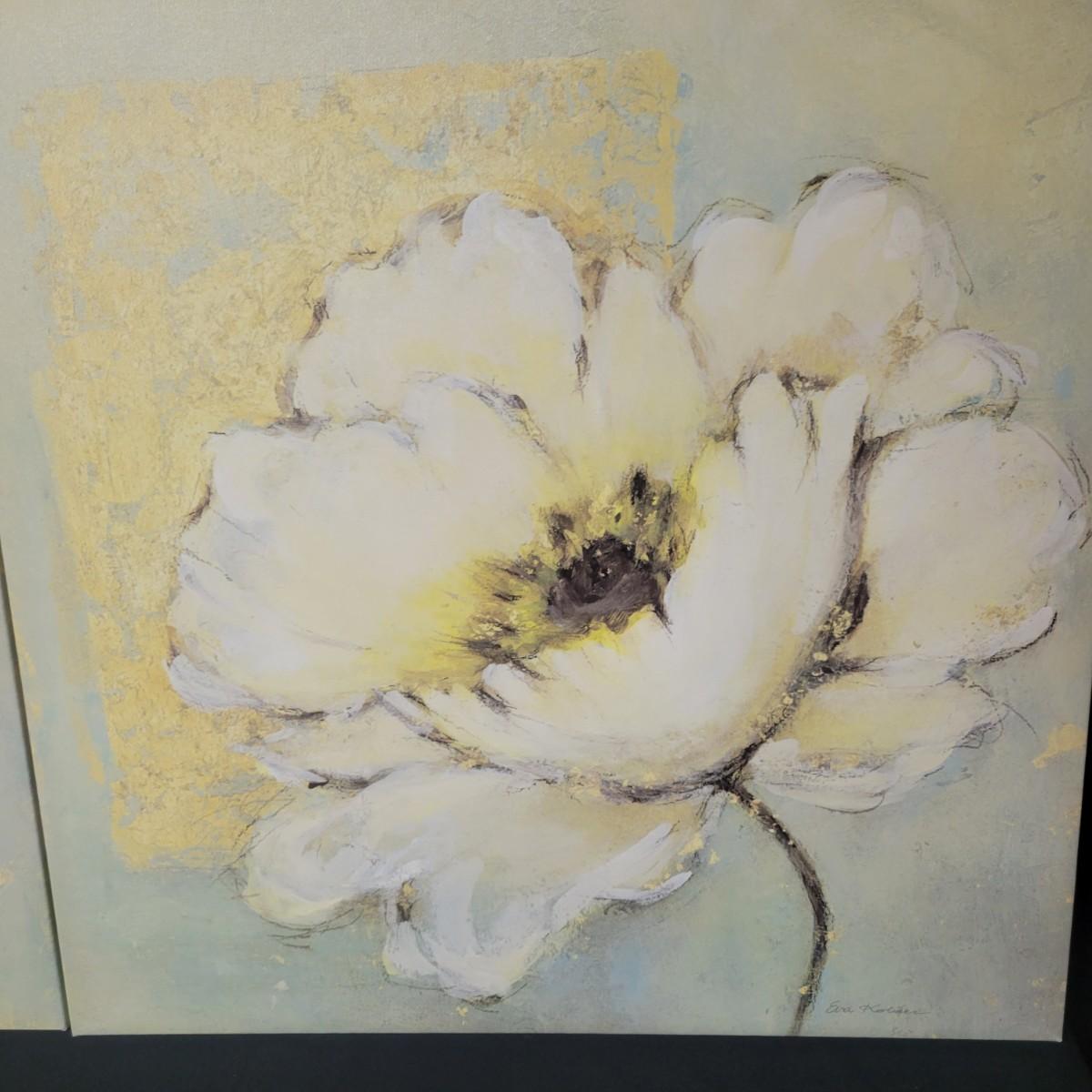 A pair of floral prints with printed signatures on canvas wrapped on thick canvas bars in good condition with no notable damage. Pieces are unframed but are designed to be hung with out framing. The floral canvases measure approximately 23.5" x 23.5" x 1.5" Shipping available. Shipping Art can be costly please call UPS store at 828-252-6930 for quote