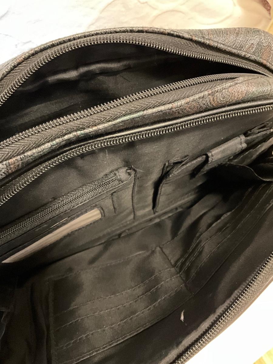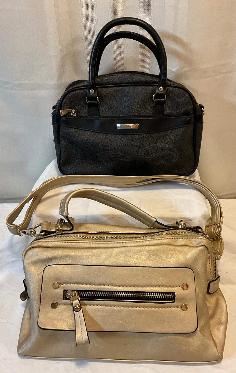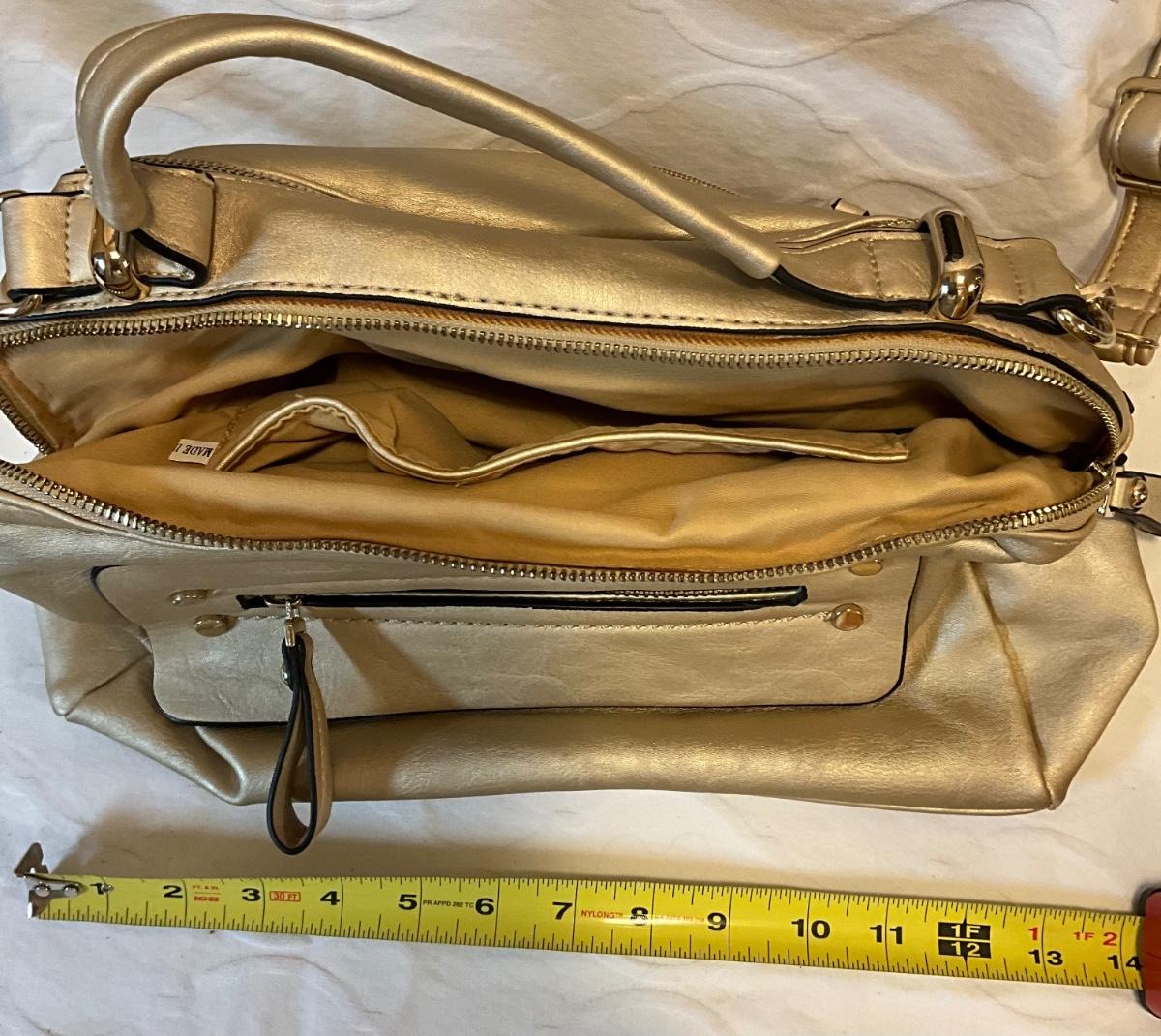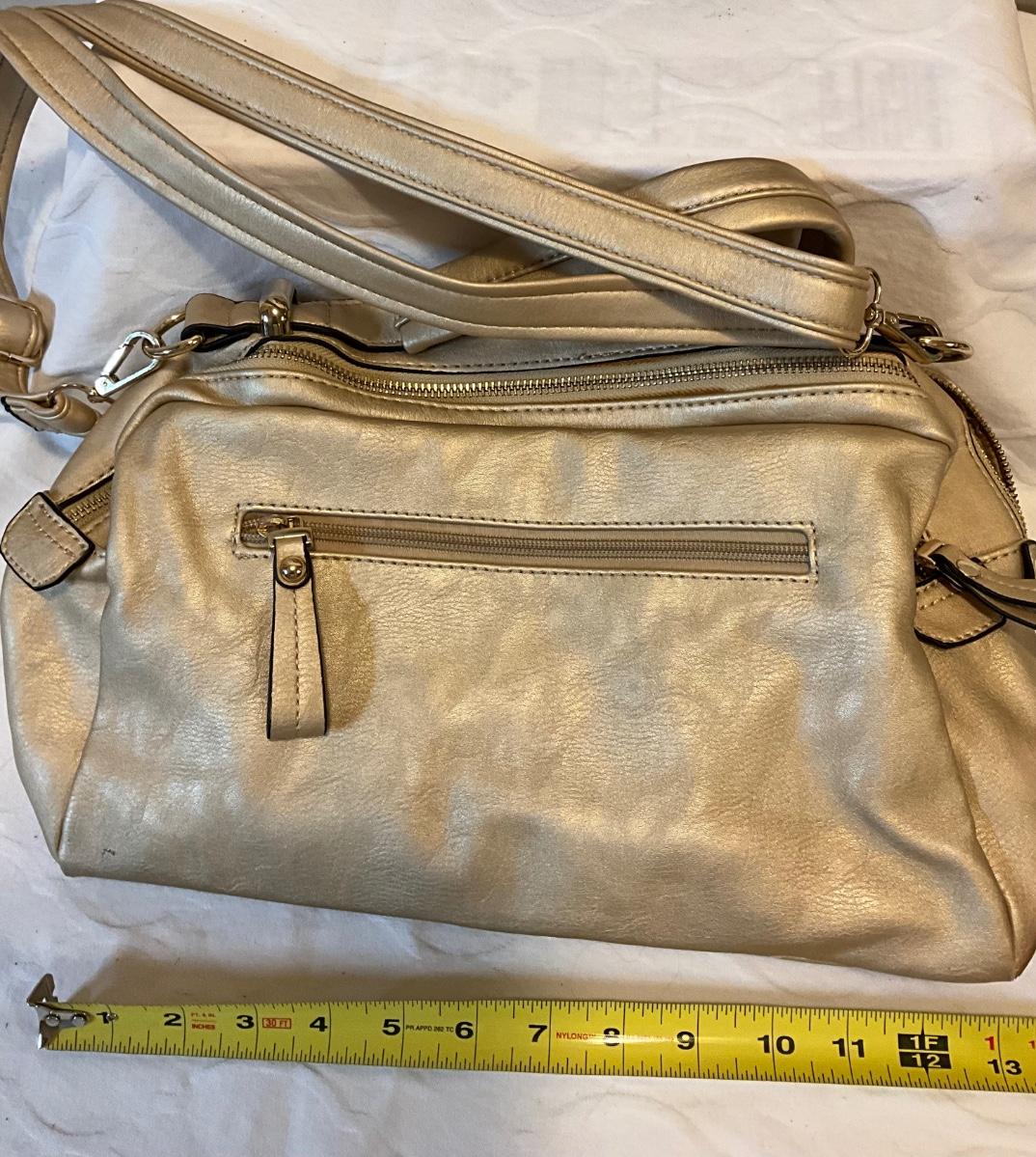 Beautiful champagne colored purse, with dark colored hard vinyl