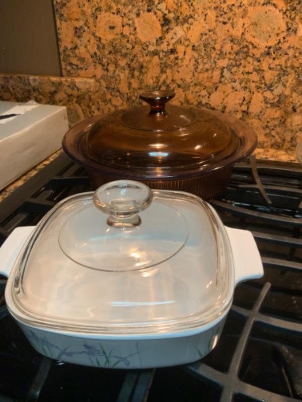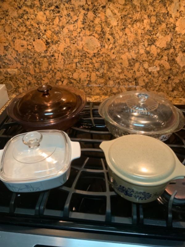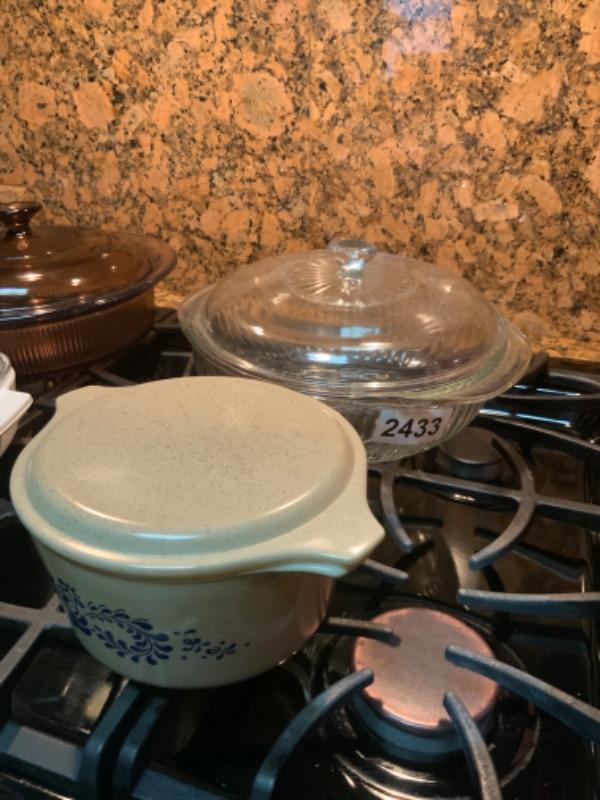 Two Pyrex dishes with lids one corning Ware dish with lid and one vision dish with lid light 2433
