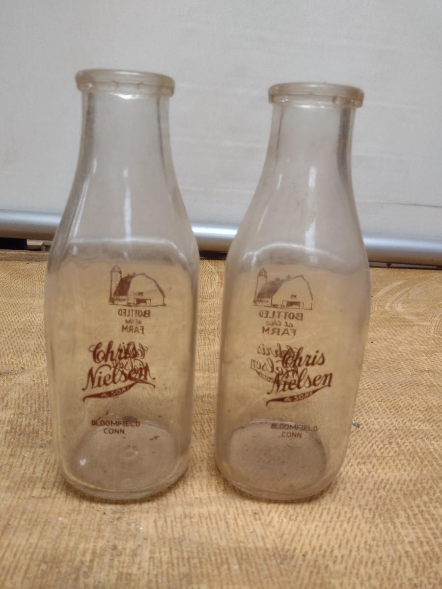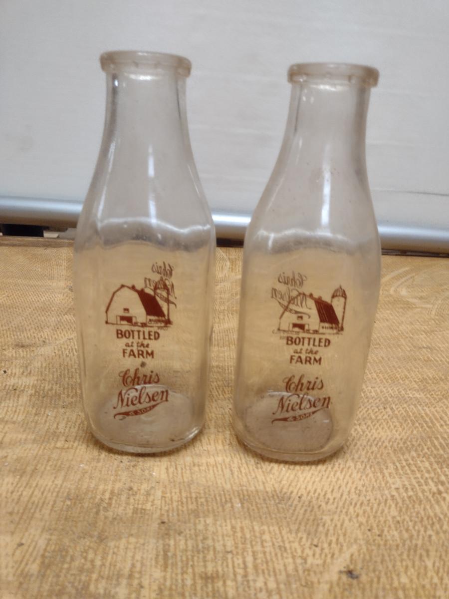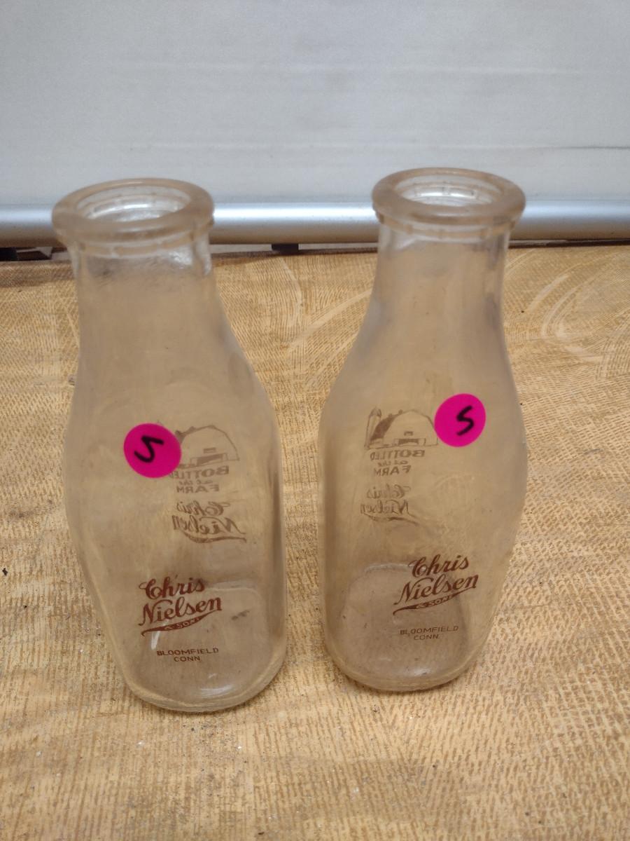 Two Quart Size Painted Milk Bottles (#5). Stored in non-climatized basement so expect item may need to be cleaned from dust, insects, etc. Shipped in as is condition